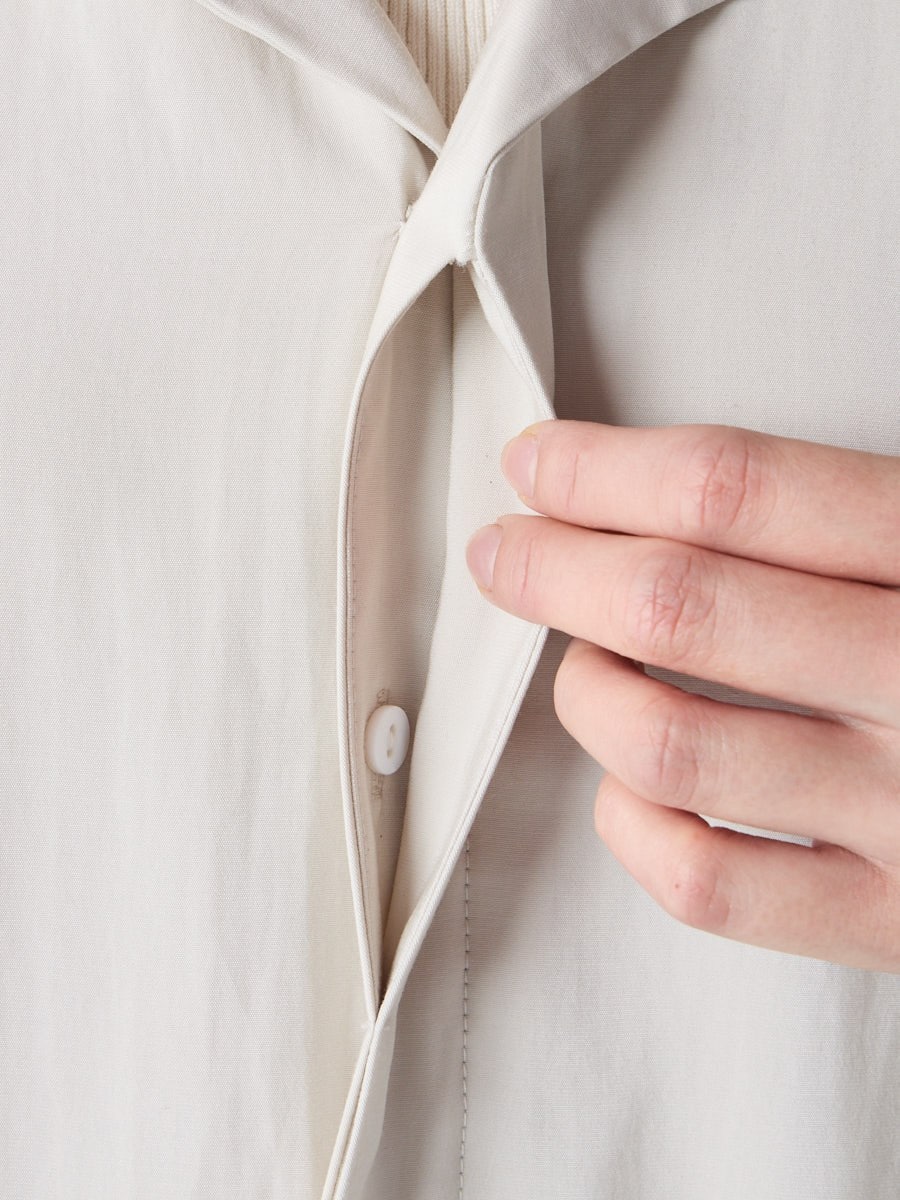 綿のようなドライタッチ素材はさらりと軽く、揺れる落ち感が美しく、羽織るだけでスッとスタイリングに抜け感をプラス。前開きシャツ仕様なので、レイヤードや羽織としても楽しめます。