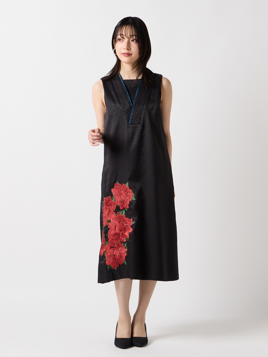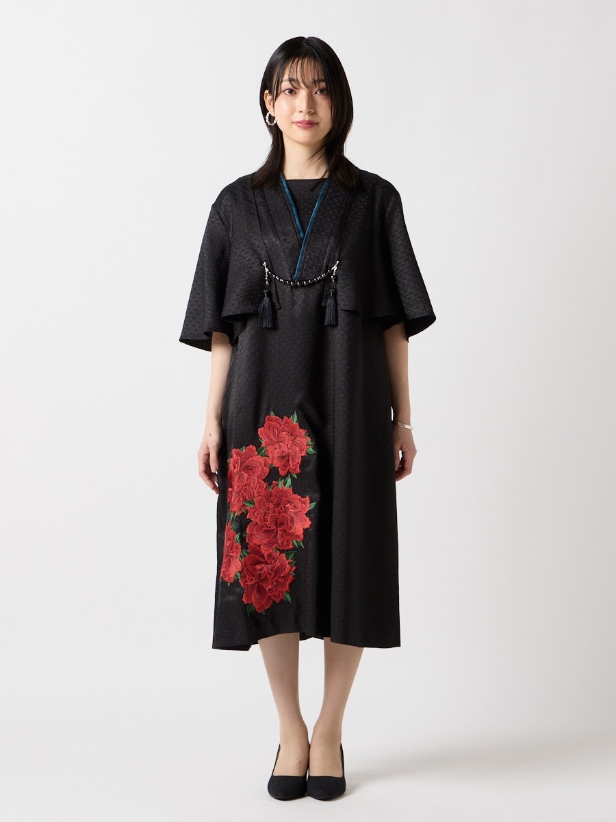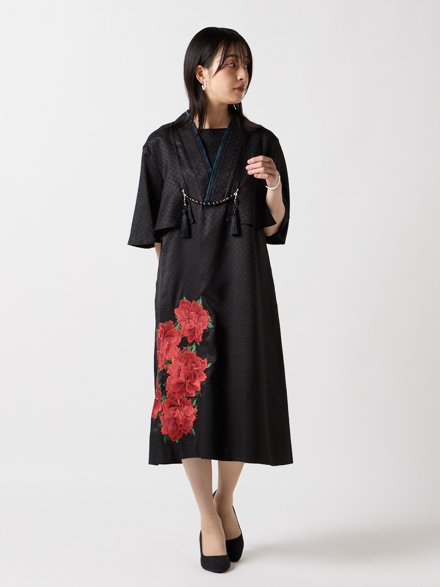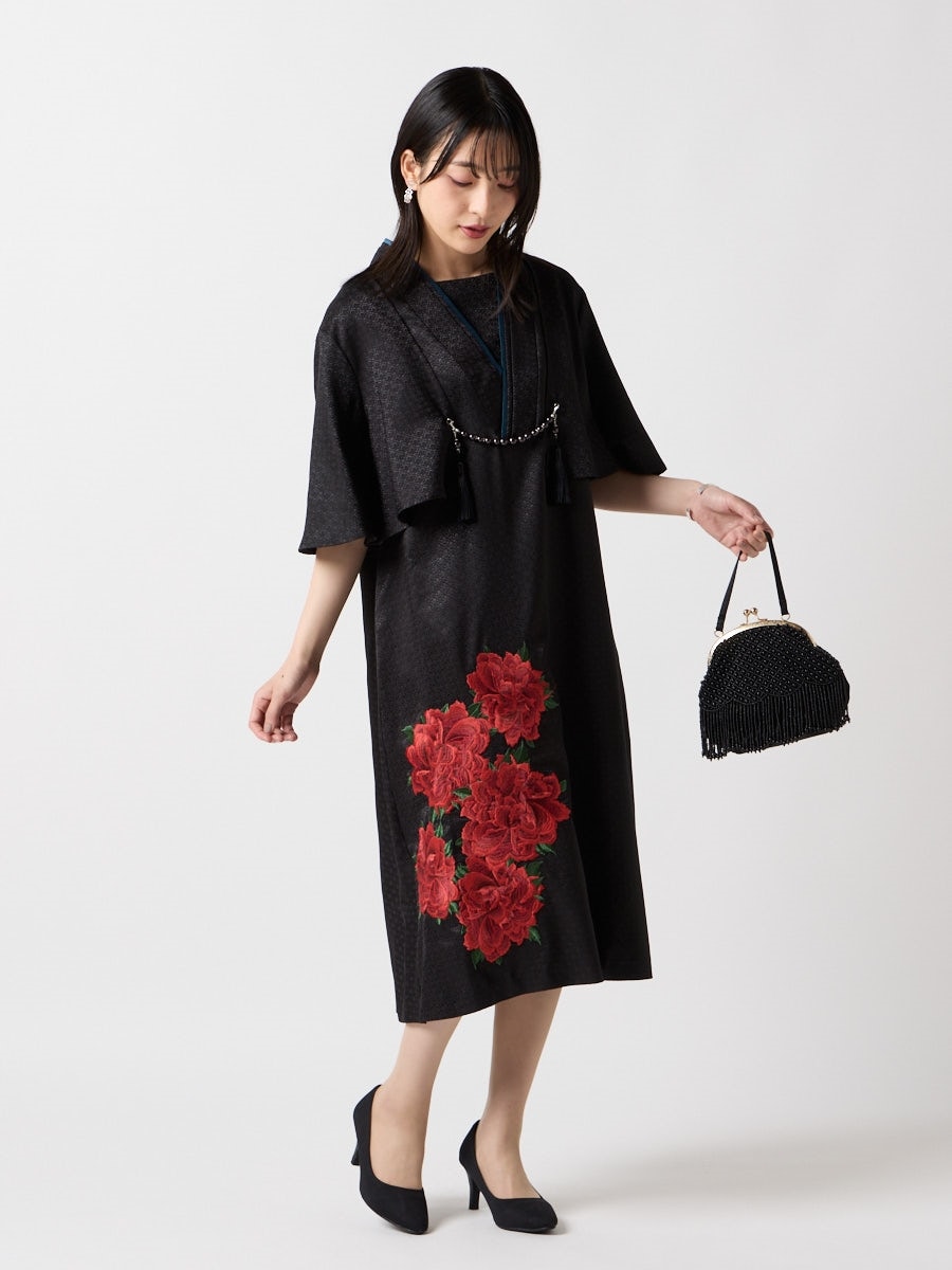 フロントに入った牡丹の花の刺繍がアクセントになります。