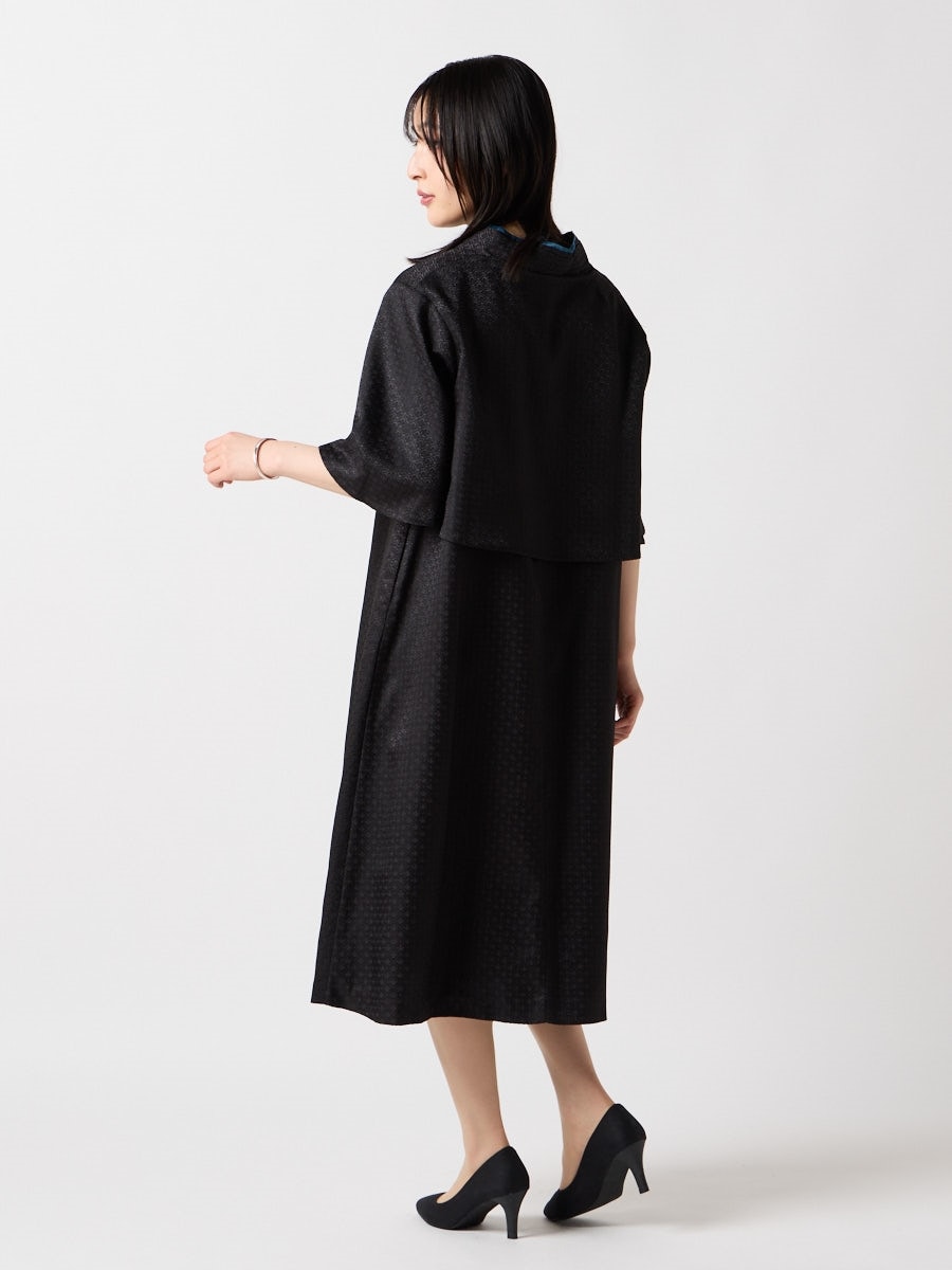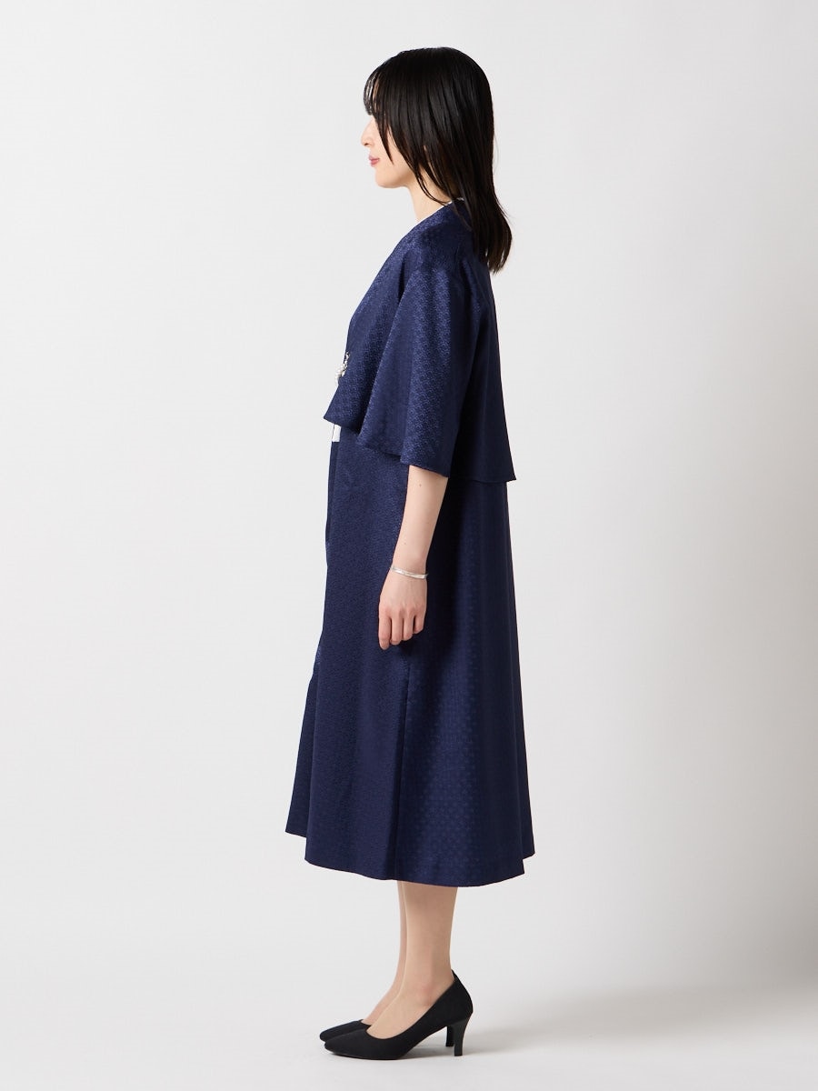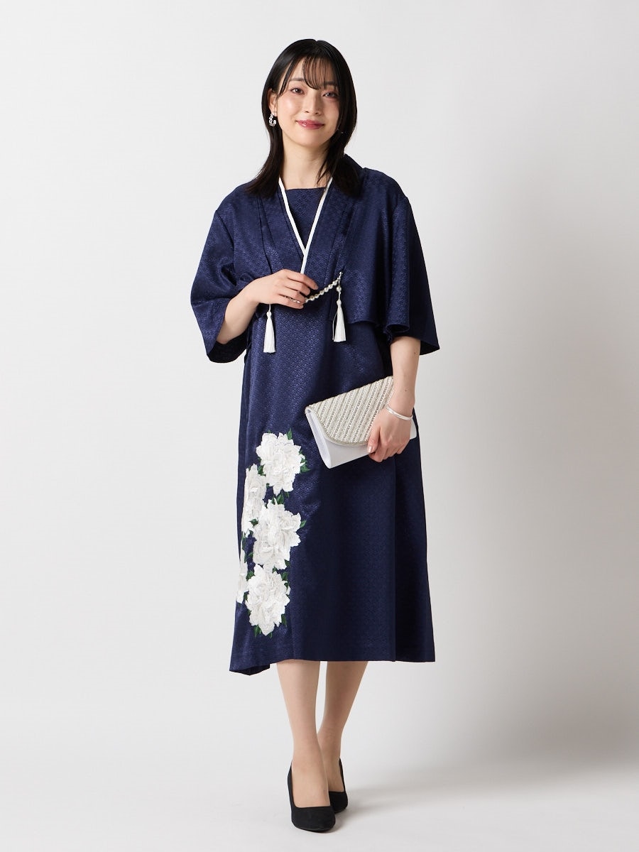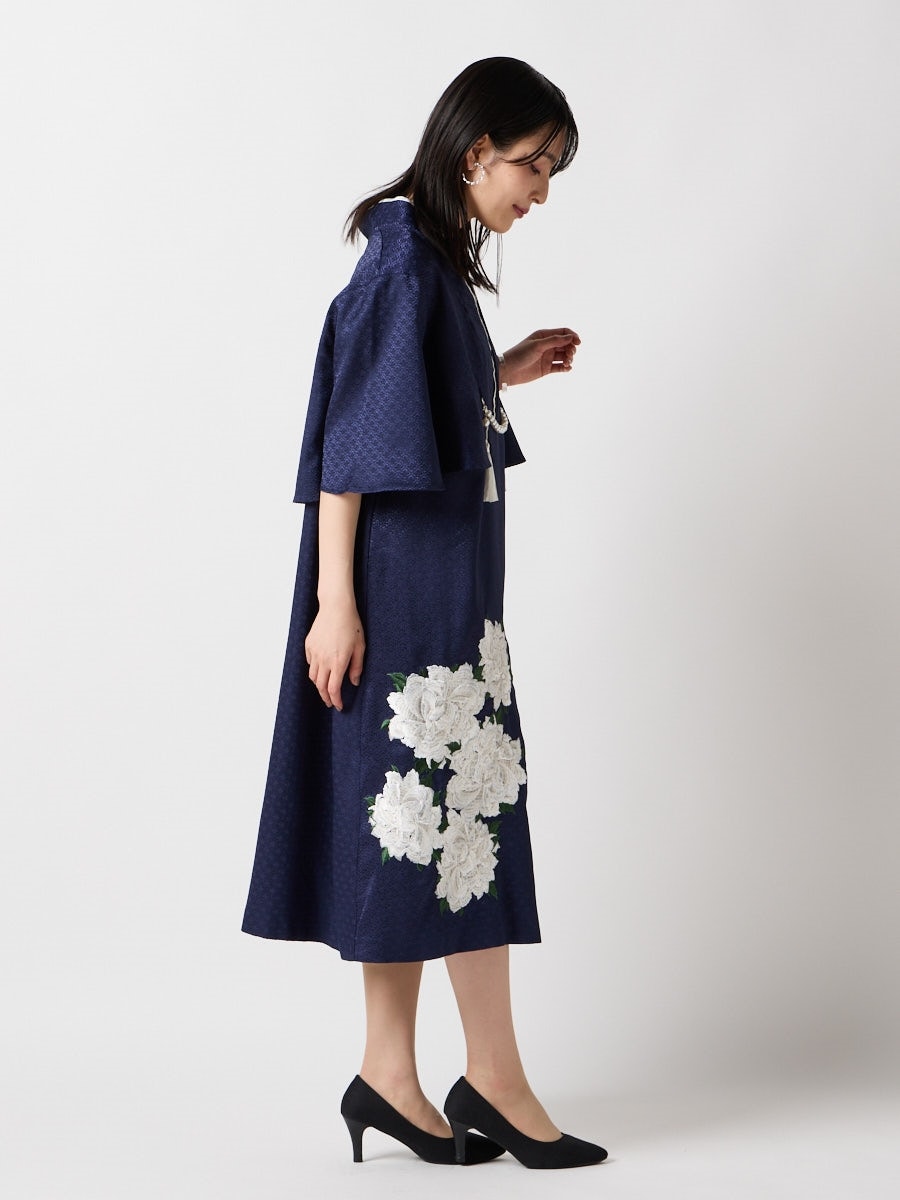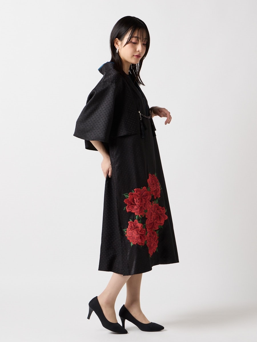 同素材の羽織がセットになっており、小物次第でカジュアルにもフォーマルにも着回しが可能。