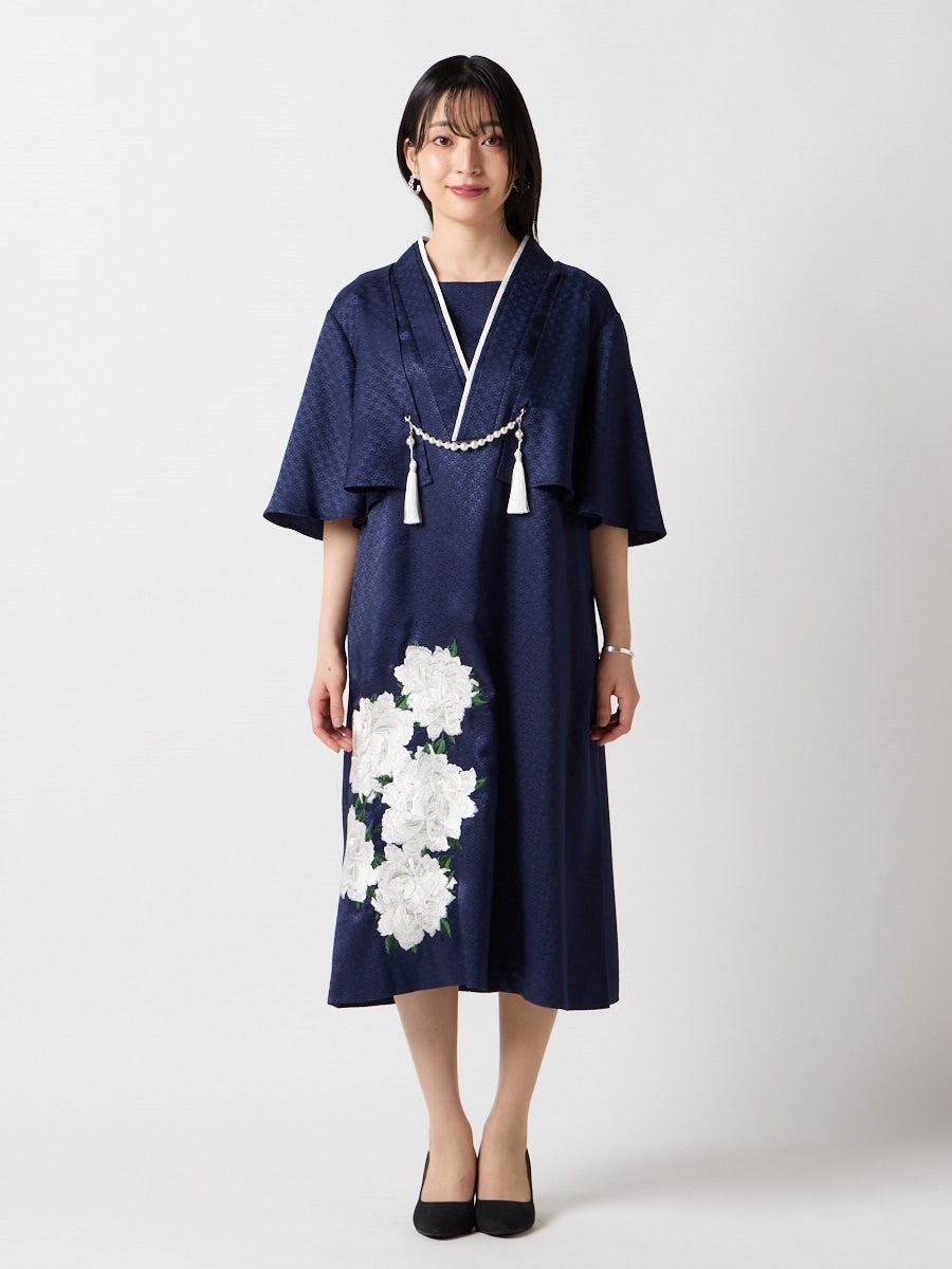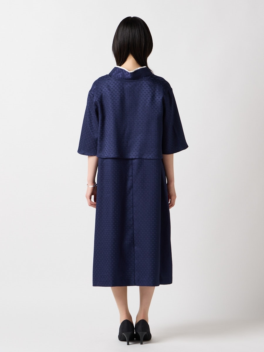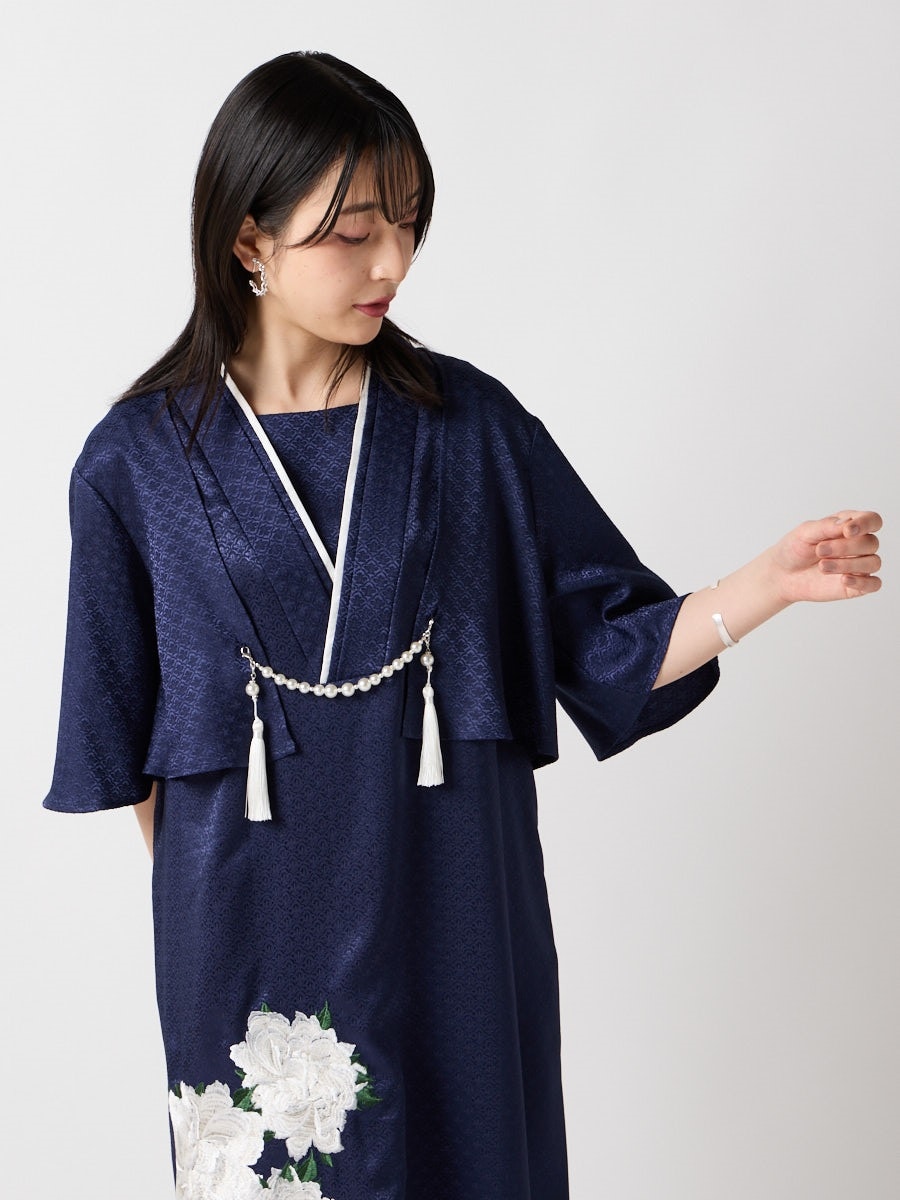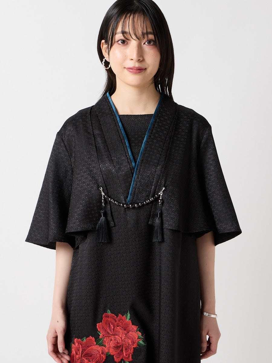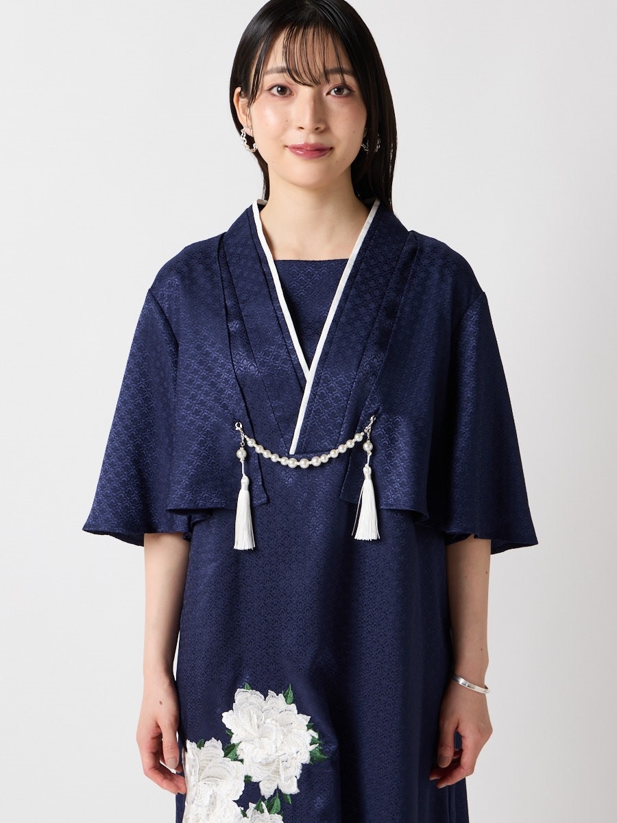 同素材の羽織がセットになっており、小物次第でカジュアルにもフォーマルにも着回しが可能。