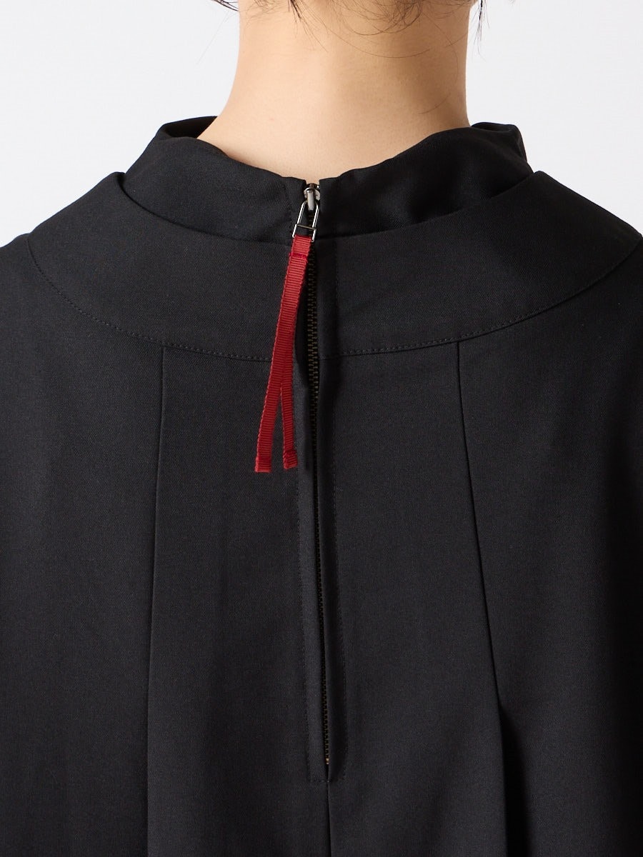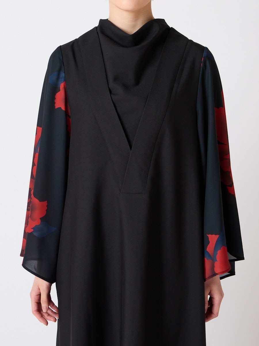 Vネックの切り替えデザインに、ハイネックの衿を仕込み、一枚でスタイルが完成。