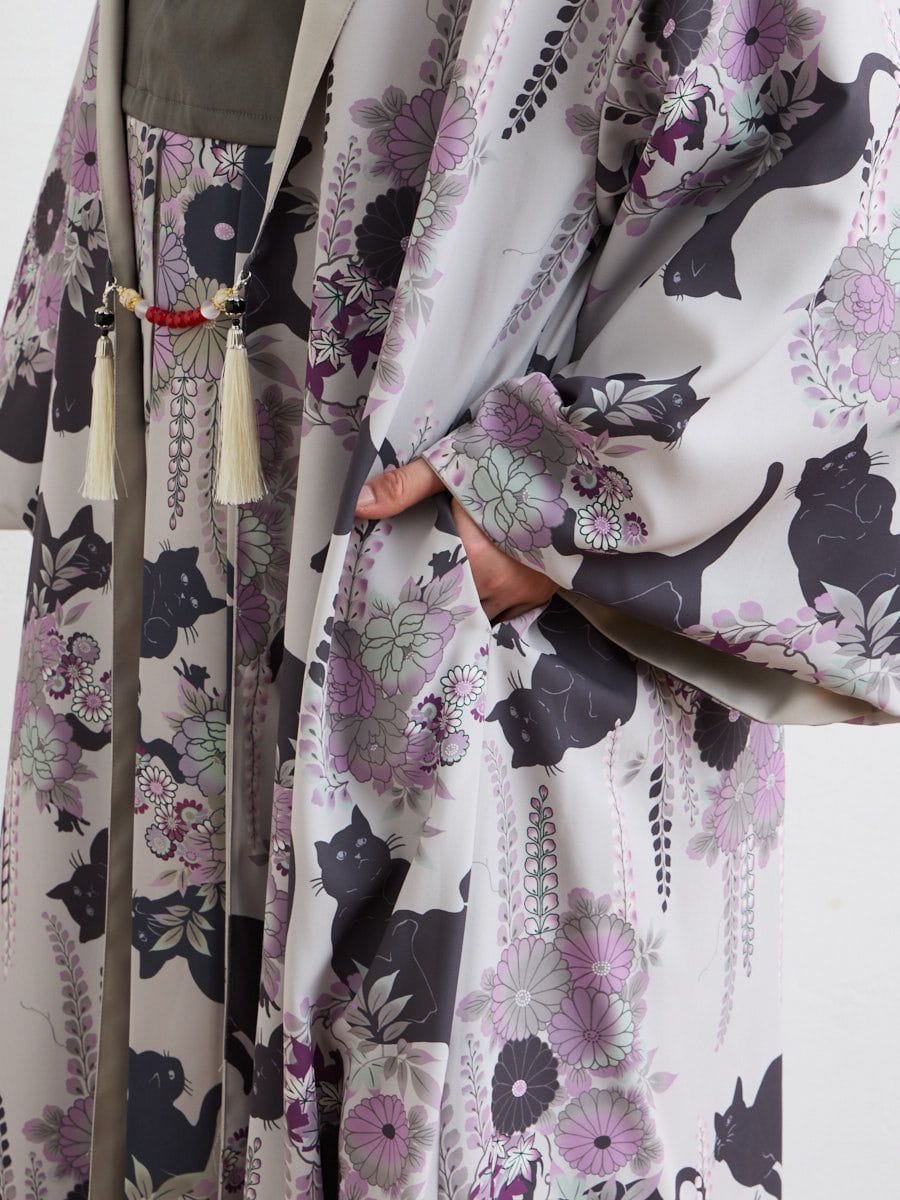藤の花や菊の花など、和の趣をまとう花々の中で、猫たちがのびやかに戯れます。