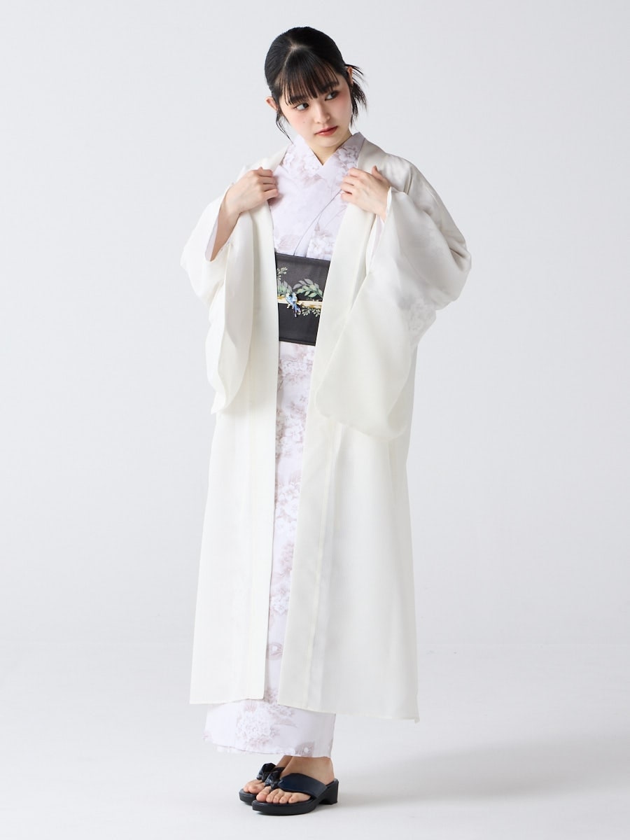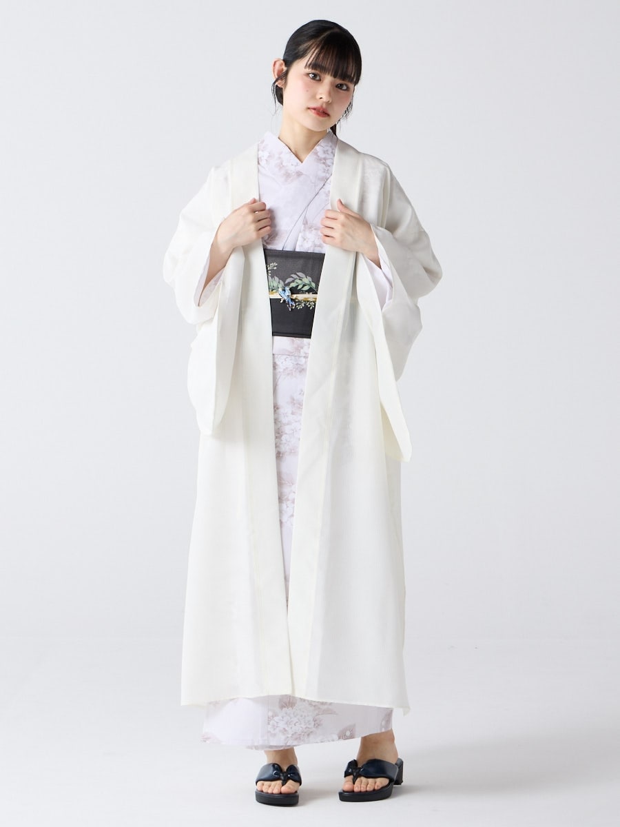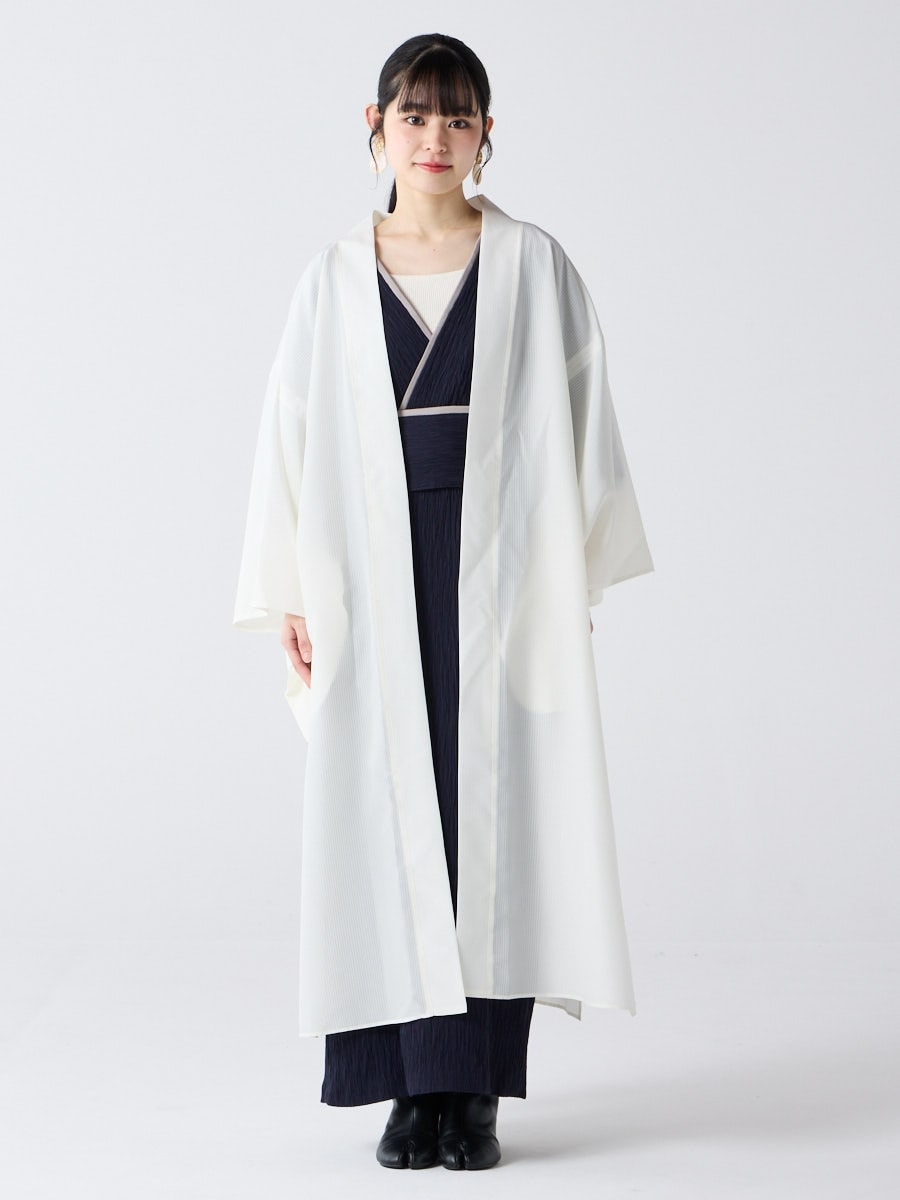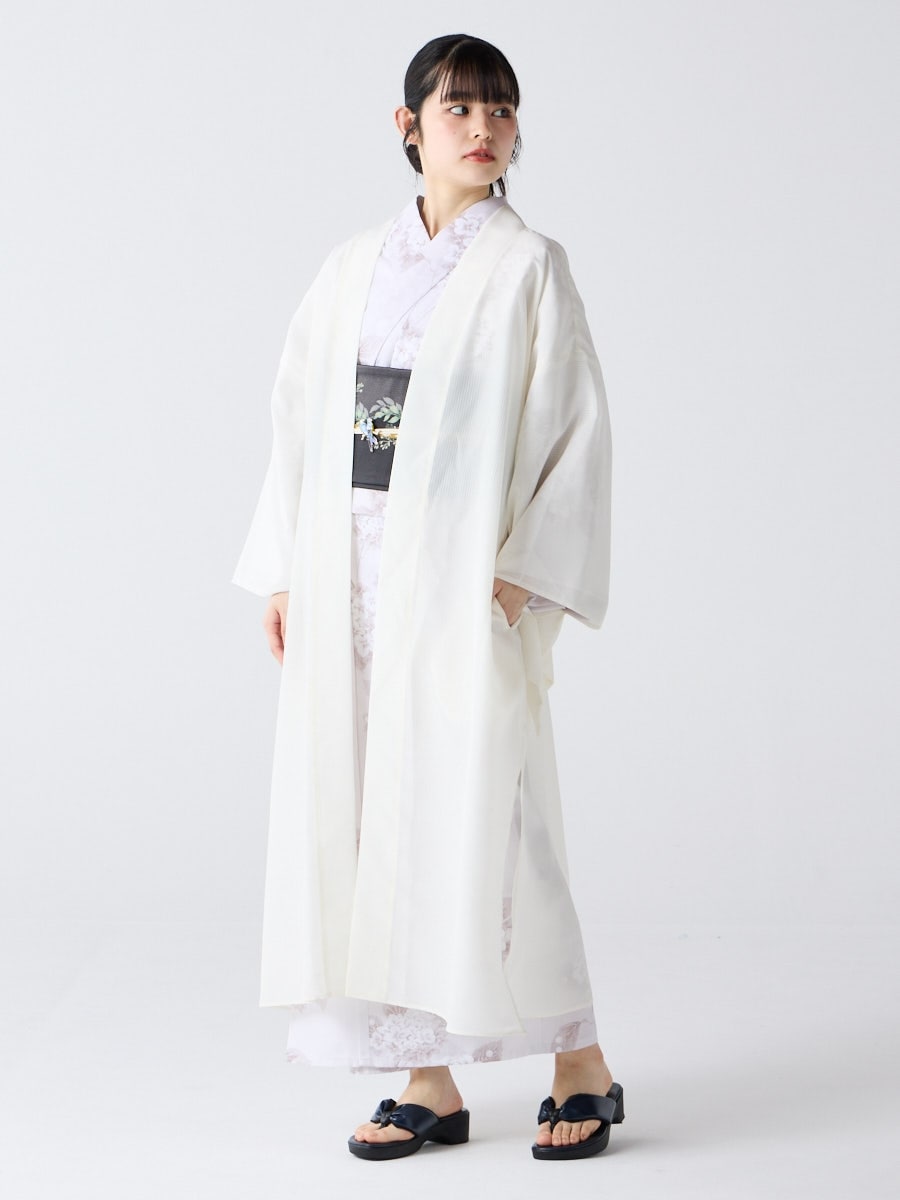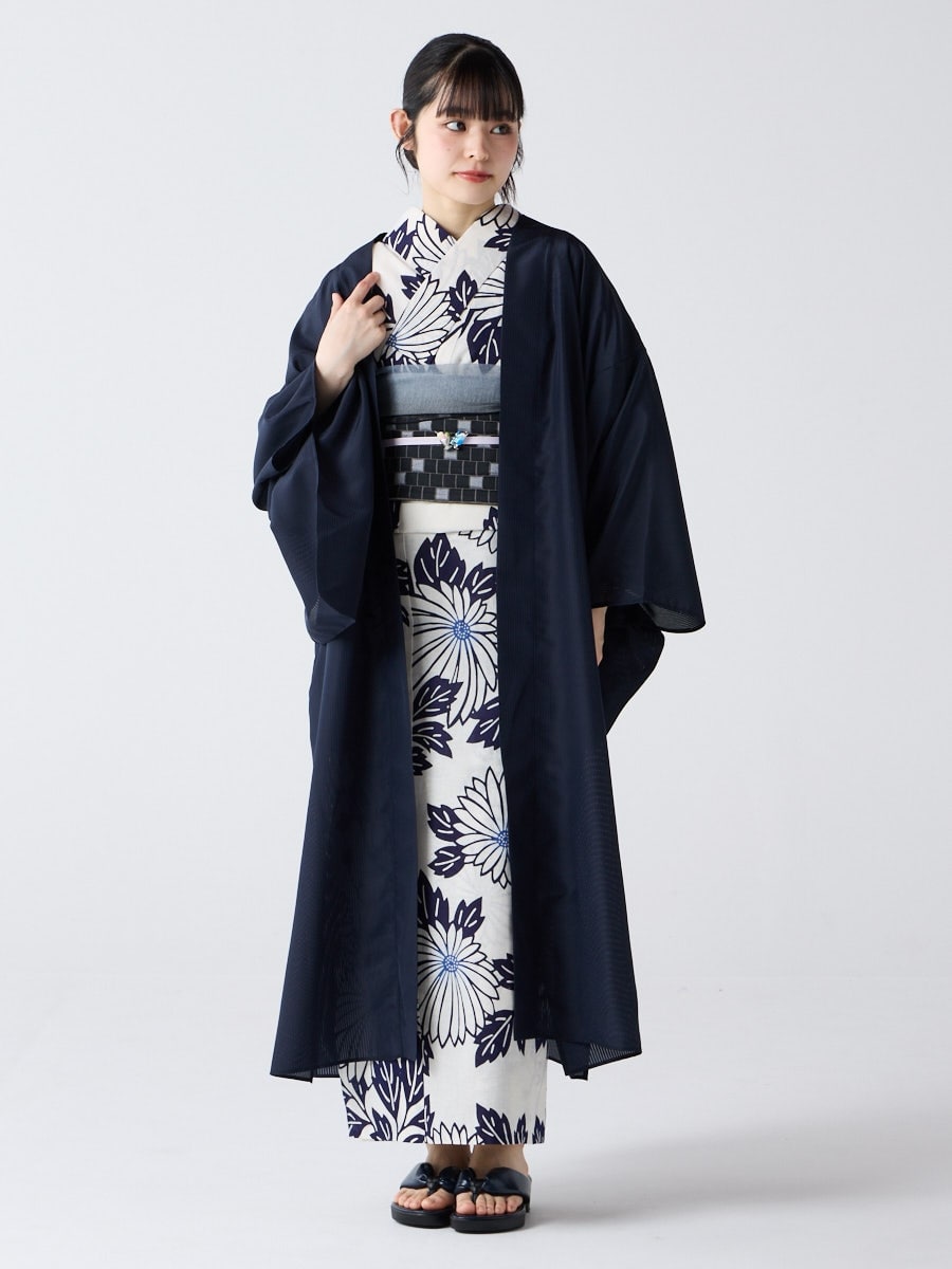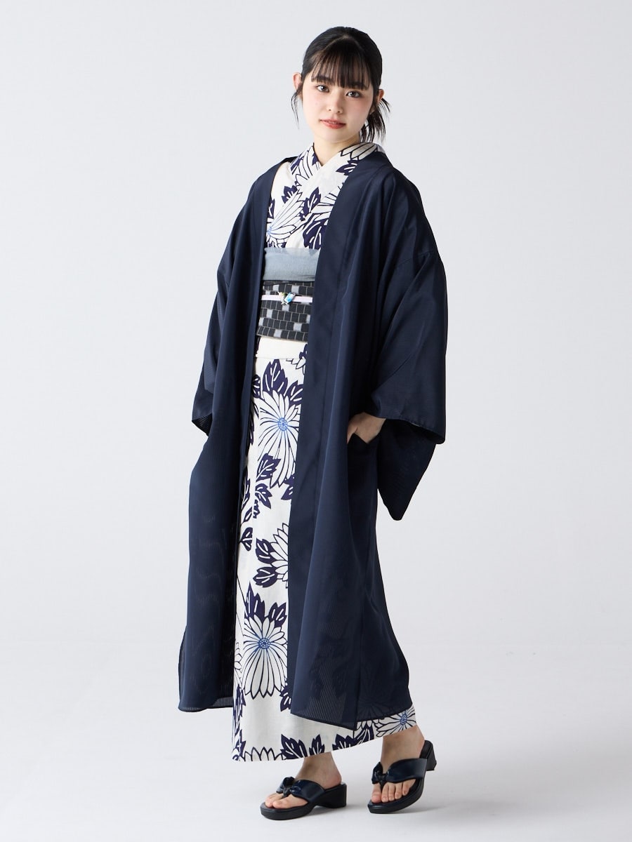 着物用の袖がすっきり収まるサイズで、洋服の上からも着物の上からもサラッと羽織れる一枚。やや透け感のある絽風シャドーストライプ生地が、風を受けてフワッと揺れるたび、夏の爽やかさを演出します。前の羽織紐は取り外し可能で、衿幅を少し太めに設定しているため、折り襟で着物風に着こなすことも。パンジー総柄と、オフホワイト・ダークネイビーの単色の3配色展開で、休日カジュアルにも、ちょっとしたお出かけにも映える、モード感のある羽織です。