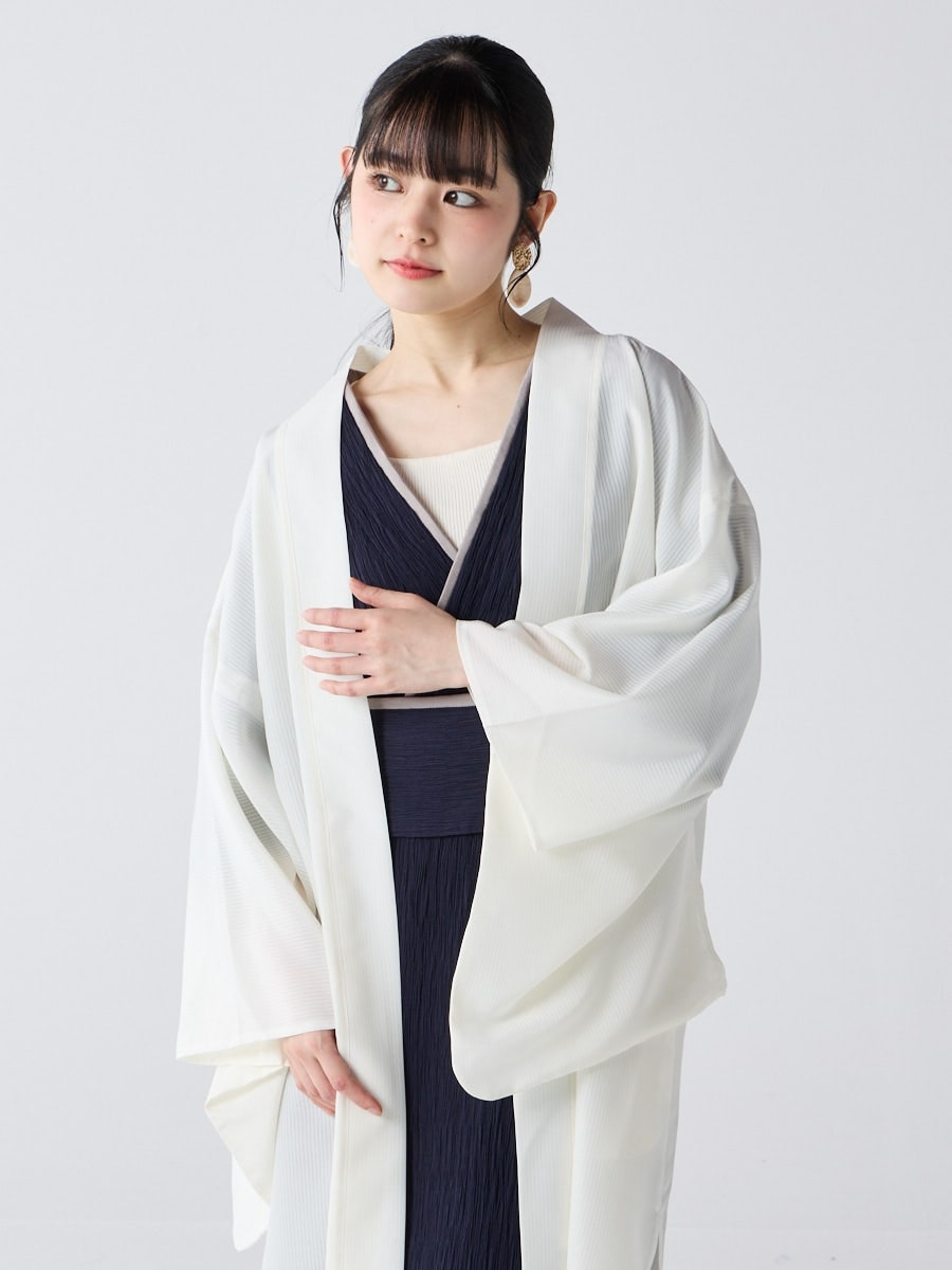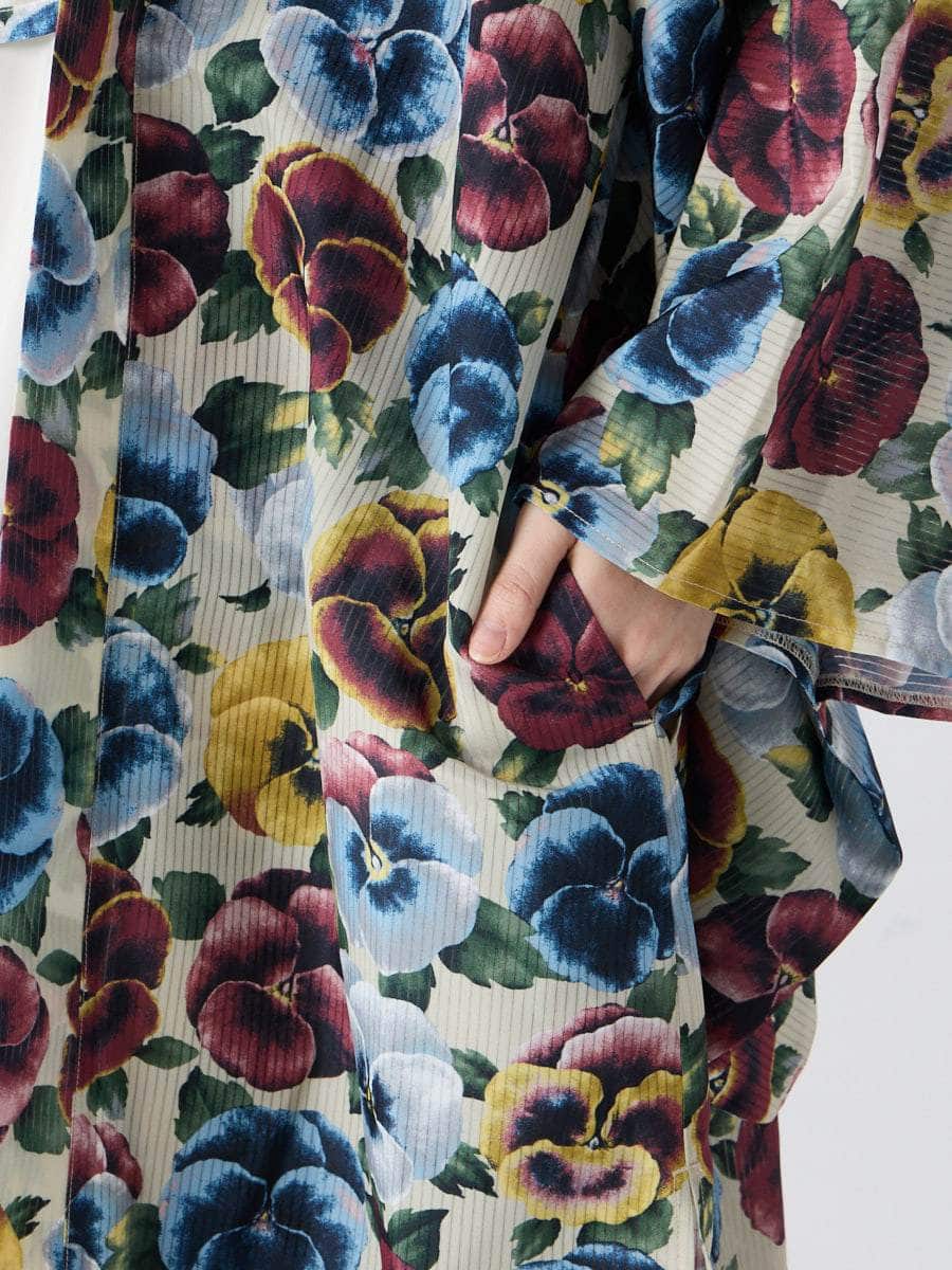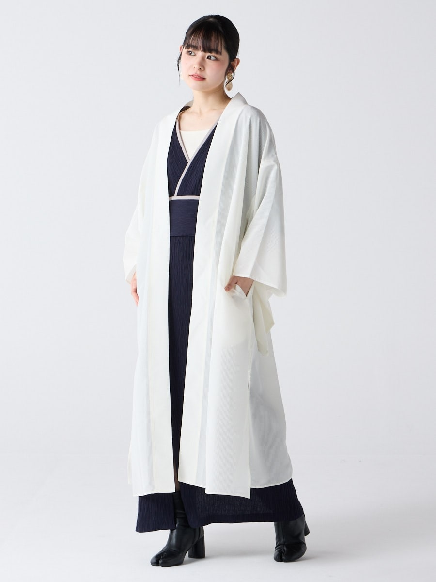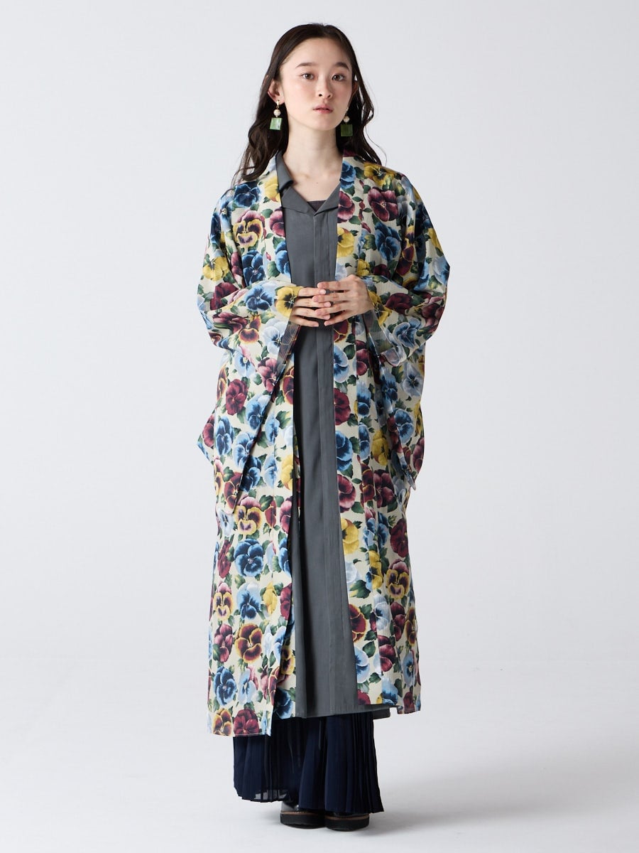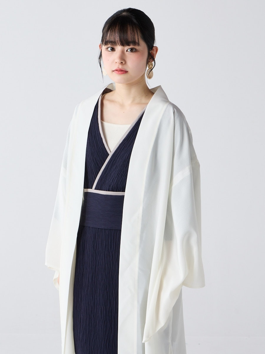 着物用の袖がすっきり収まるサイズで、洋服の上からも着物の上からもサラッと羽織れる一枚。やや透け感のある絽風シャドーストライプ生地が、風を受けてフワッと揺れるたび、夏の爽やかさを演出します。前の羽織紐は取り外し可能で、衿幅を少し太めに設定しているため、折り襟で着物風に着こなすことも。パンジー総柄と、オフホワイト・ダークネイビーの単色の3配色展開で、休日カジュアルにも、ちょっとしたお出かけにも映える、モード感のある羽織です。
