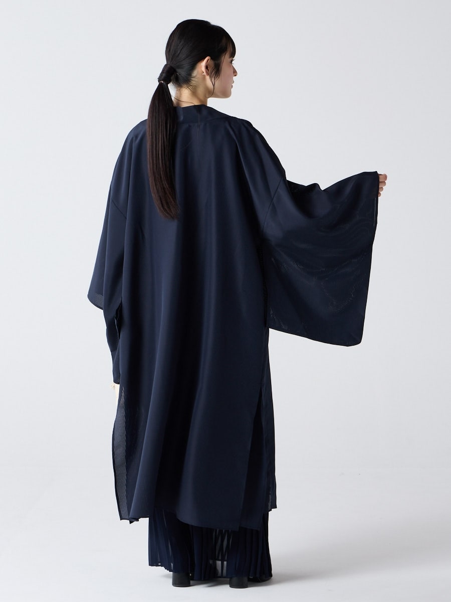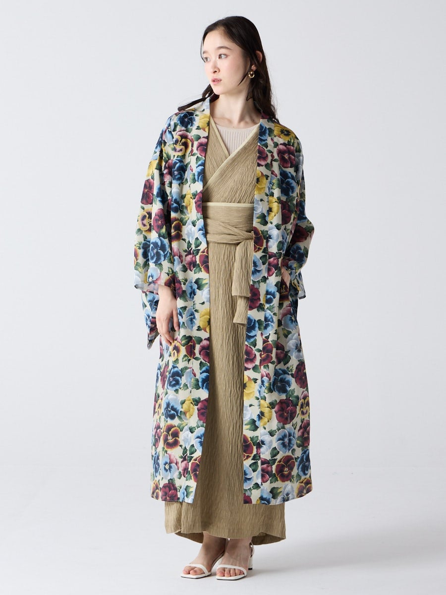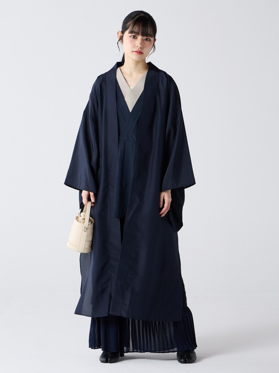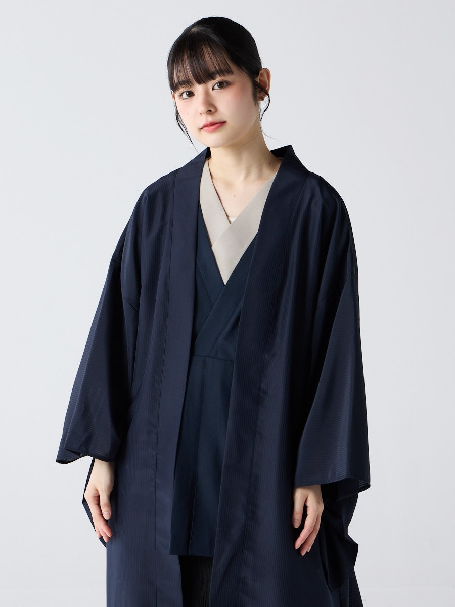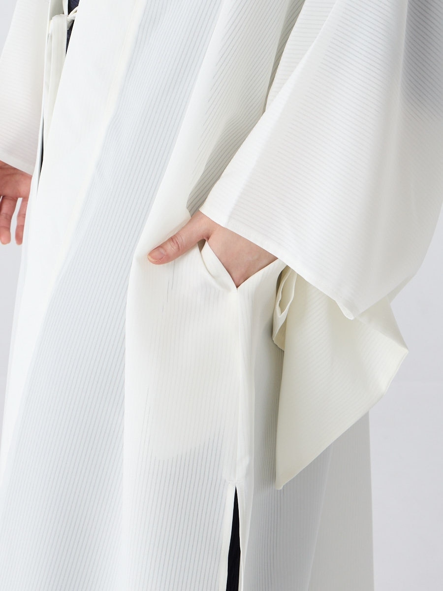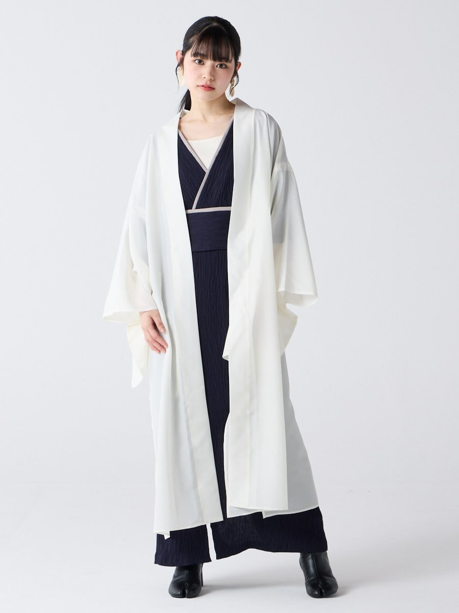 着物用の袖がすっきり収まるサイズで、洋服の上からも着物の上からもサラッと羽織れる一枚。やや透け感のある絽風シャドーストライプ生地が、風を受けてフワッと揺れるたび、夏の爽やかさを演出します。前の羽織紐は取り外し可能で、衿幅を少し太めに設定しているため、折り襟で着物風に着こなすことも。パンジー総柄と、オフホワイト・ダークネイビーの単色の3配色展開で、休日カジュアルにも、ちょっとしたお出かけにも映える、モード感のある羽織です。