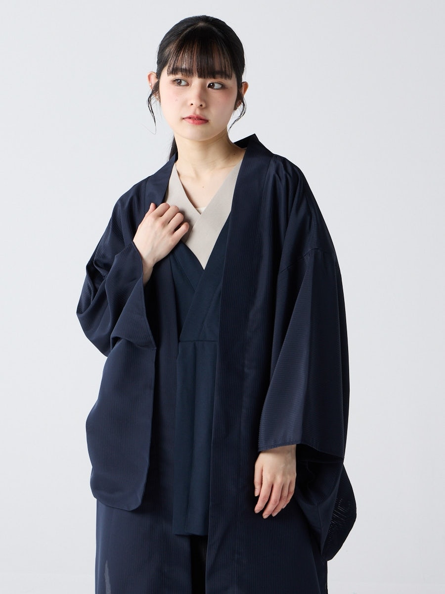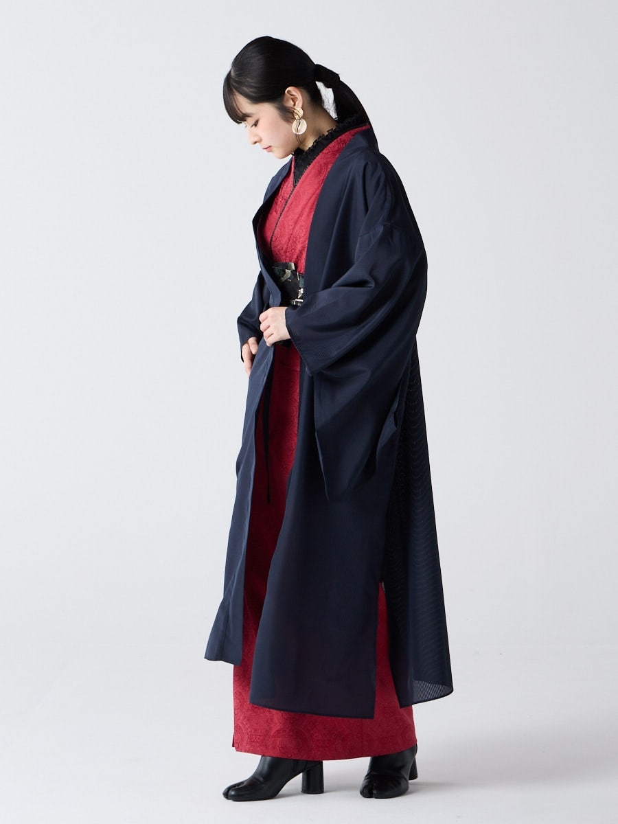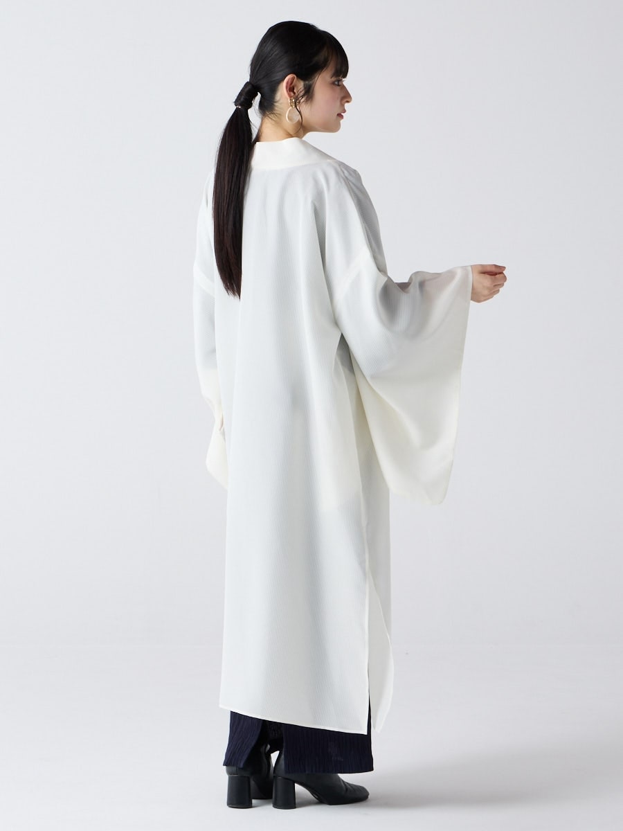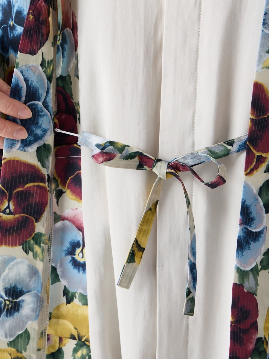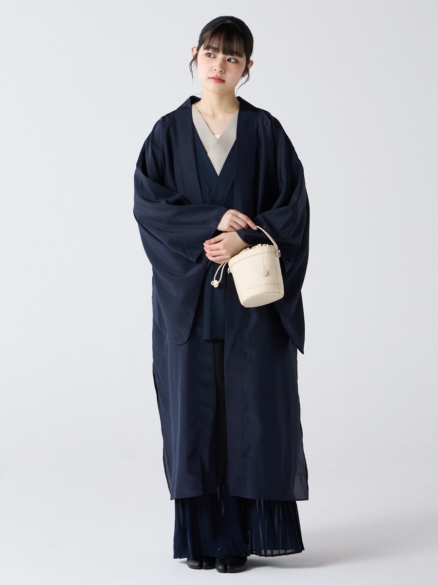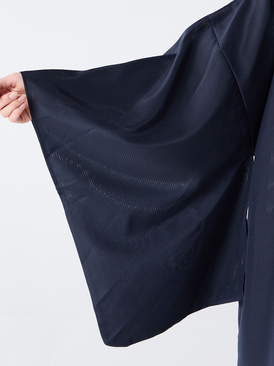 着物用の袖がすっきり収まるサイズで、洋服の上からも着物の上からもサラッと羽織れる一枚。やや透け感のある絽風シャドーストライプ生地が、風を受けてフワッと揺れるたび、夏の爽やかさを演出します。前の羽織紐は取り外し可能で、衿幅を少し太めに設定しているため、折り襟で着物風に着こなすことも。パンジー総柄と、オフホワイト・ダークネイビーの単色の3配色展開で、休日カジュアルにも、ちょっとしたお出かけにも映える、モード感のある羽織です。