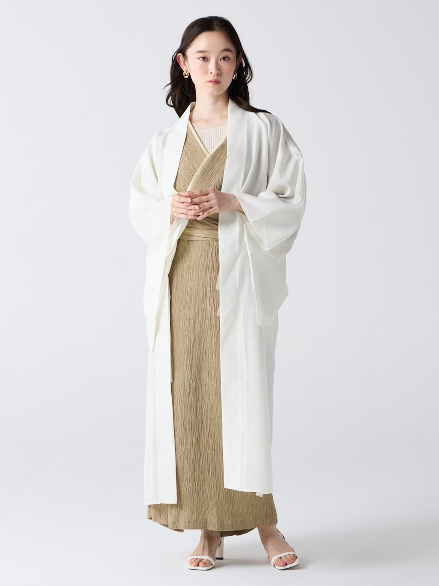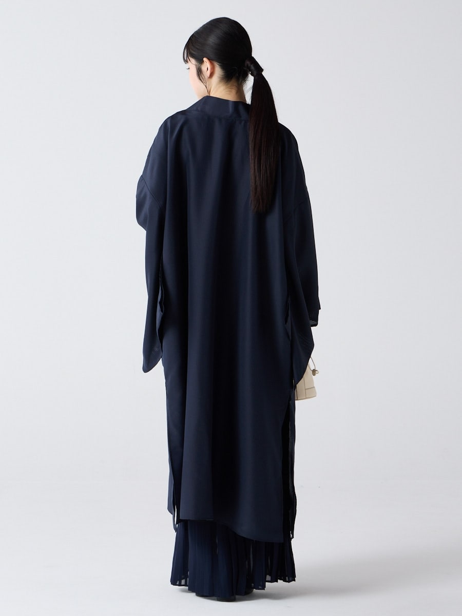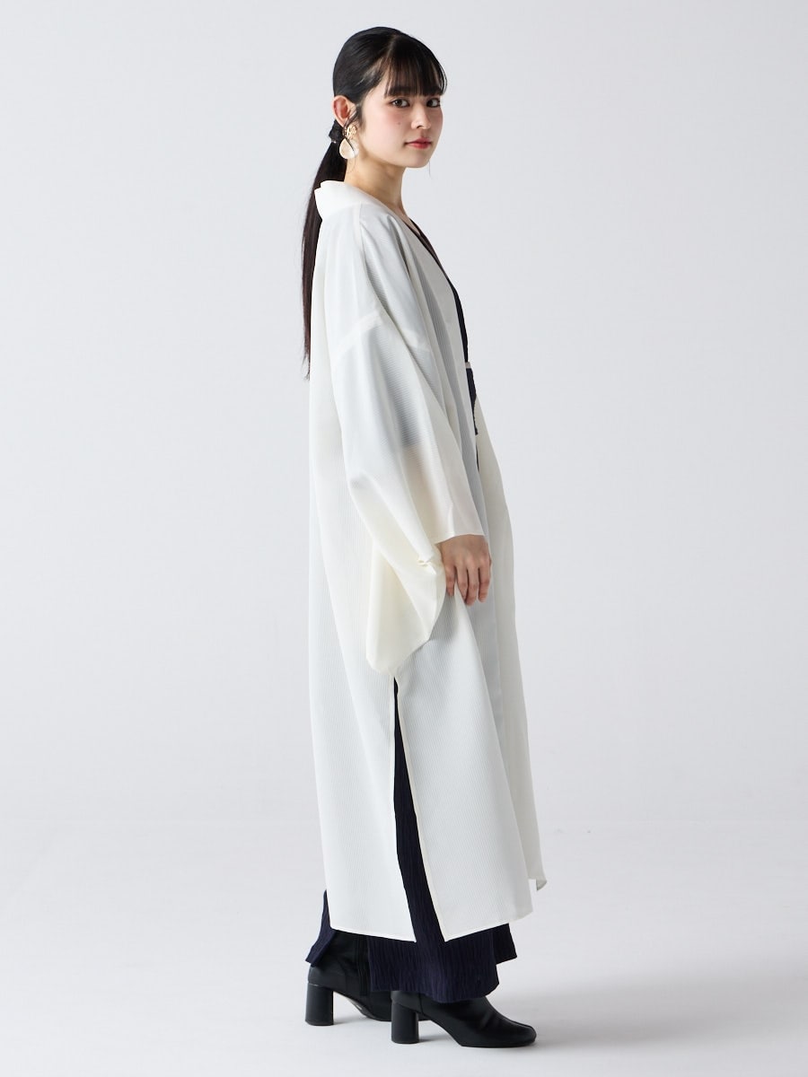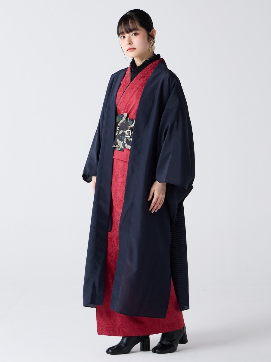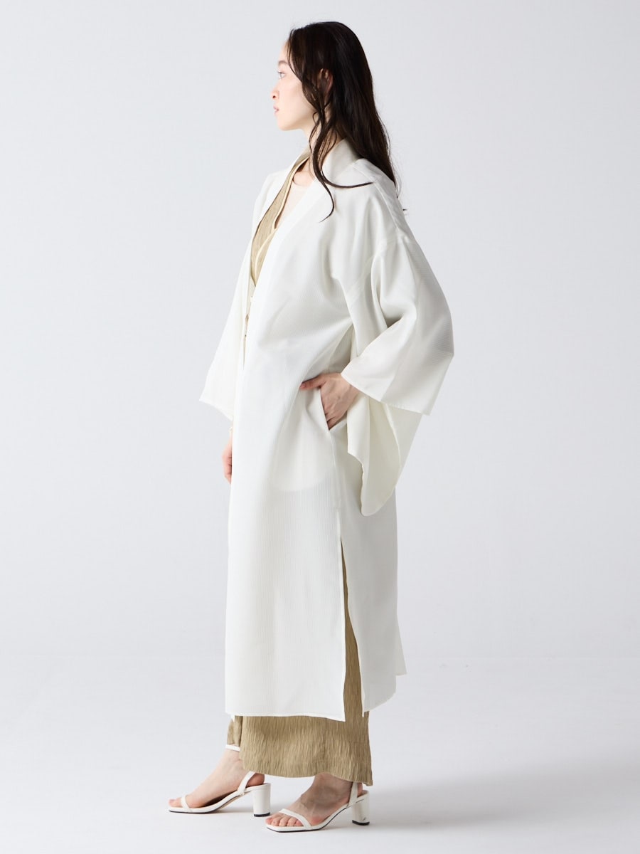 着物用の袖がすっきり収まるサイズで、洋服の上からも着物の上からもサラッと羽織れる一枚。やや透け感のある絽風シャドーストライプ生地が、風を受けてフワッと揺れるたび、夏の爽やかさを演出します。前の羽織紐は取り外し可能で、衿幅を少し太めに設定しているため、折り襟で着物風に着こなすことも。パンジー総柄と、オフホワイト・ダークネイビーの単色の3配色展開で、休日カジュアルにも、ちょっとしたお出かけにも映える、モード感のある羽織です。