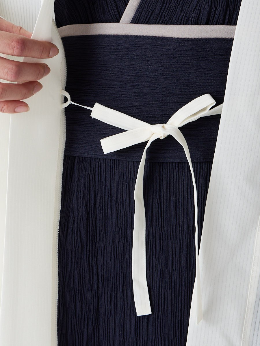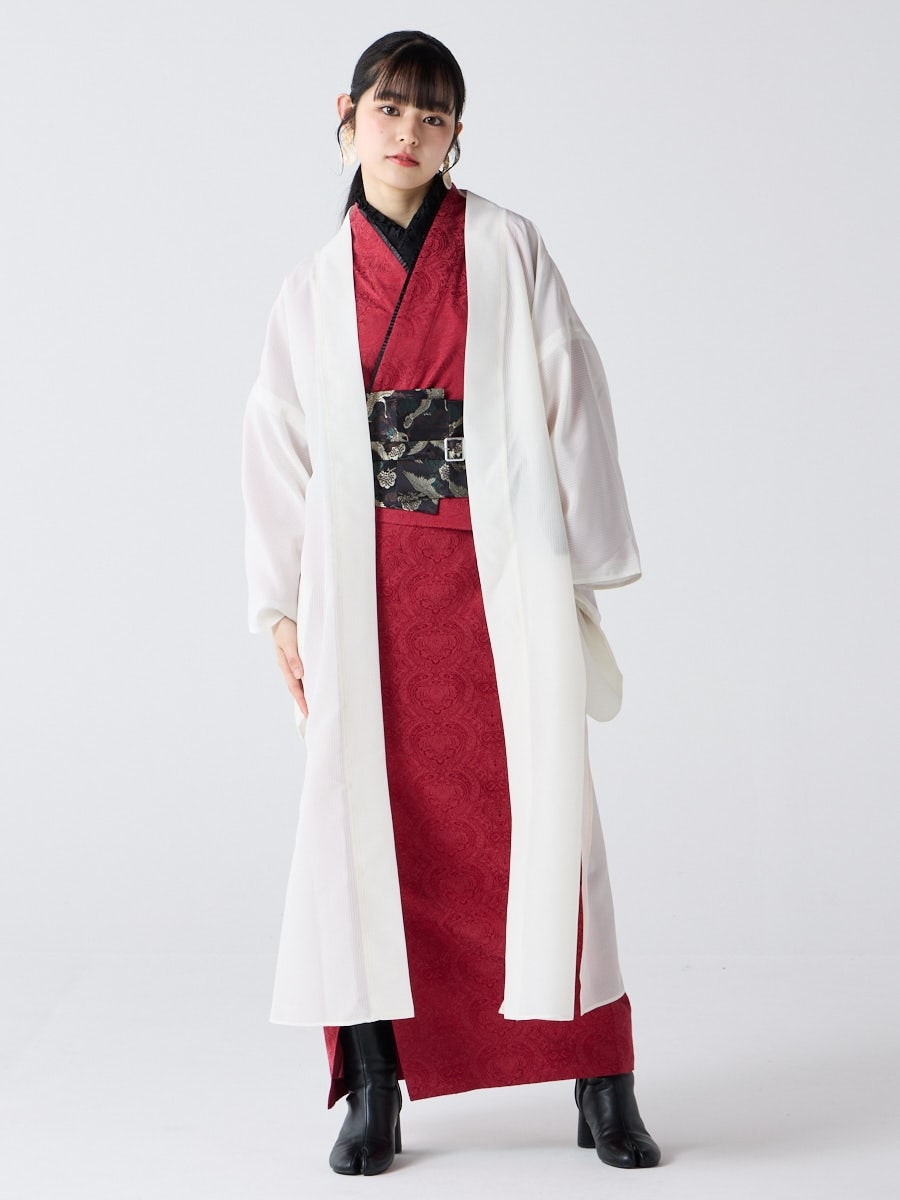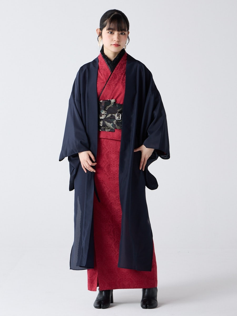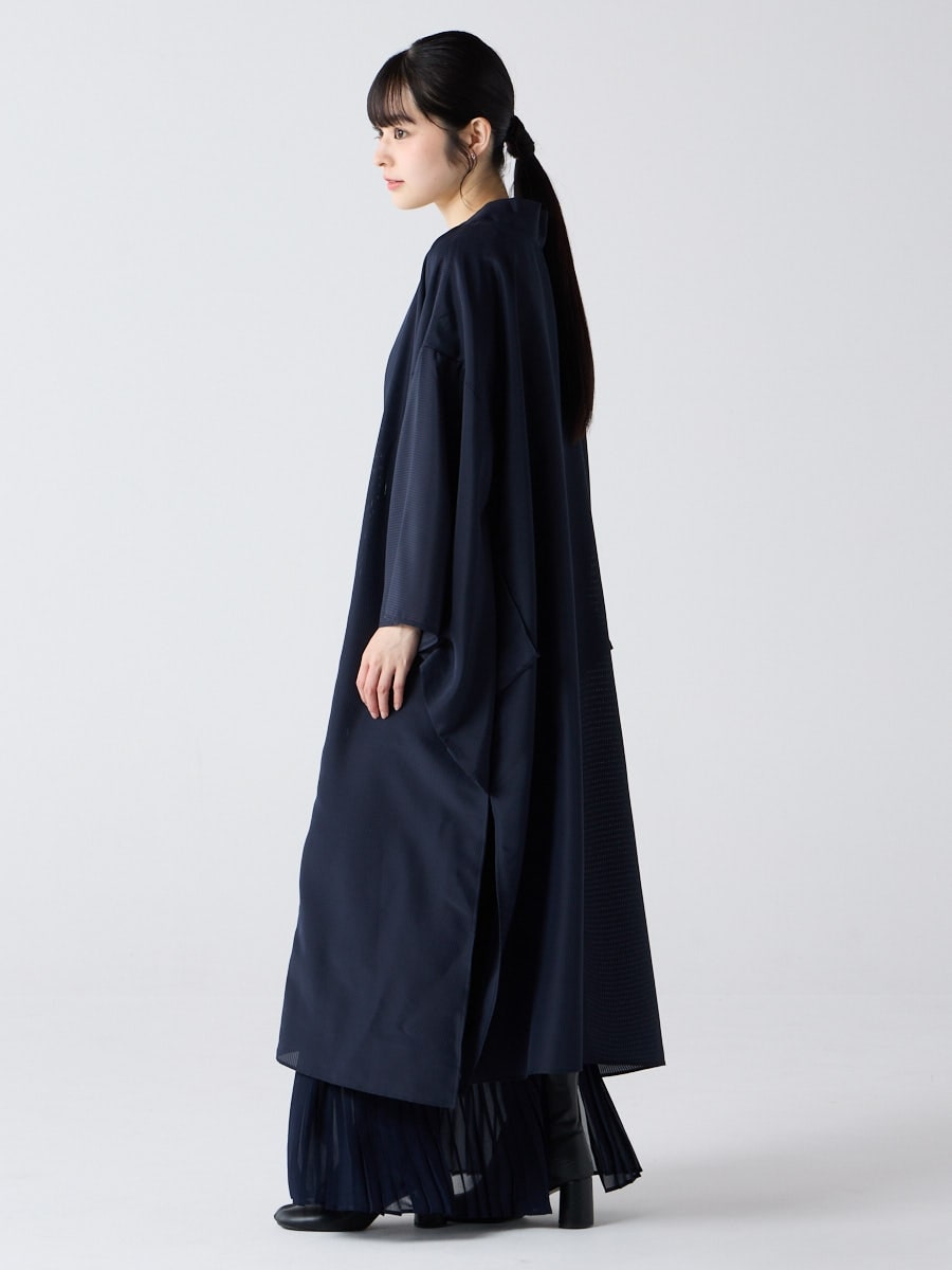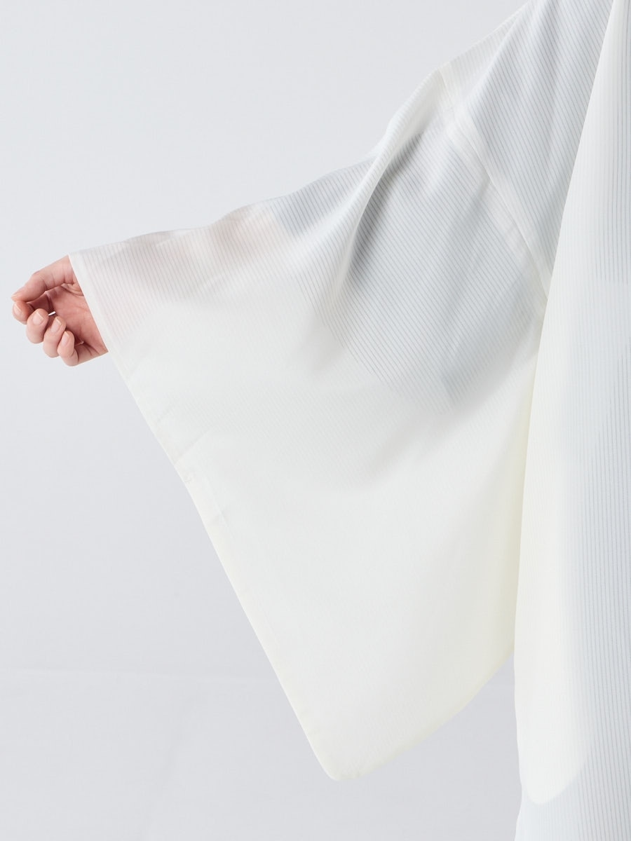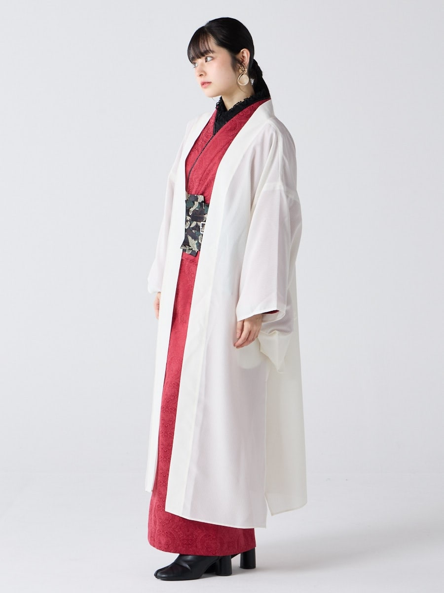 着物用の袖がすっきり収まるサイズで、洋服の上からも着物の上からもサラッと羽織れる一枚。やや透け感のある絽風シャドーストライプ生地が、風を受けてフワッと揺れるたび、夏の爽やかさを演出します。前の羽織紐は取り外し可能で、衿幅を少し太めに設定しているため、折り襟で着物風に着こなすことも。パンジー総柄と、オフホワイト・ダークネイビーの単色の3配色展開で、休日カジュアルにも、ちょっとしたお出かけにも映える、モード感のある羽織です。