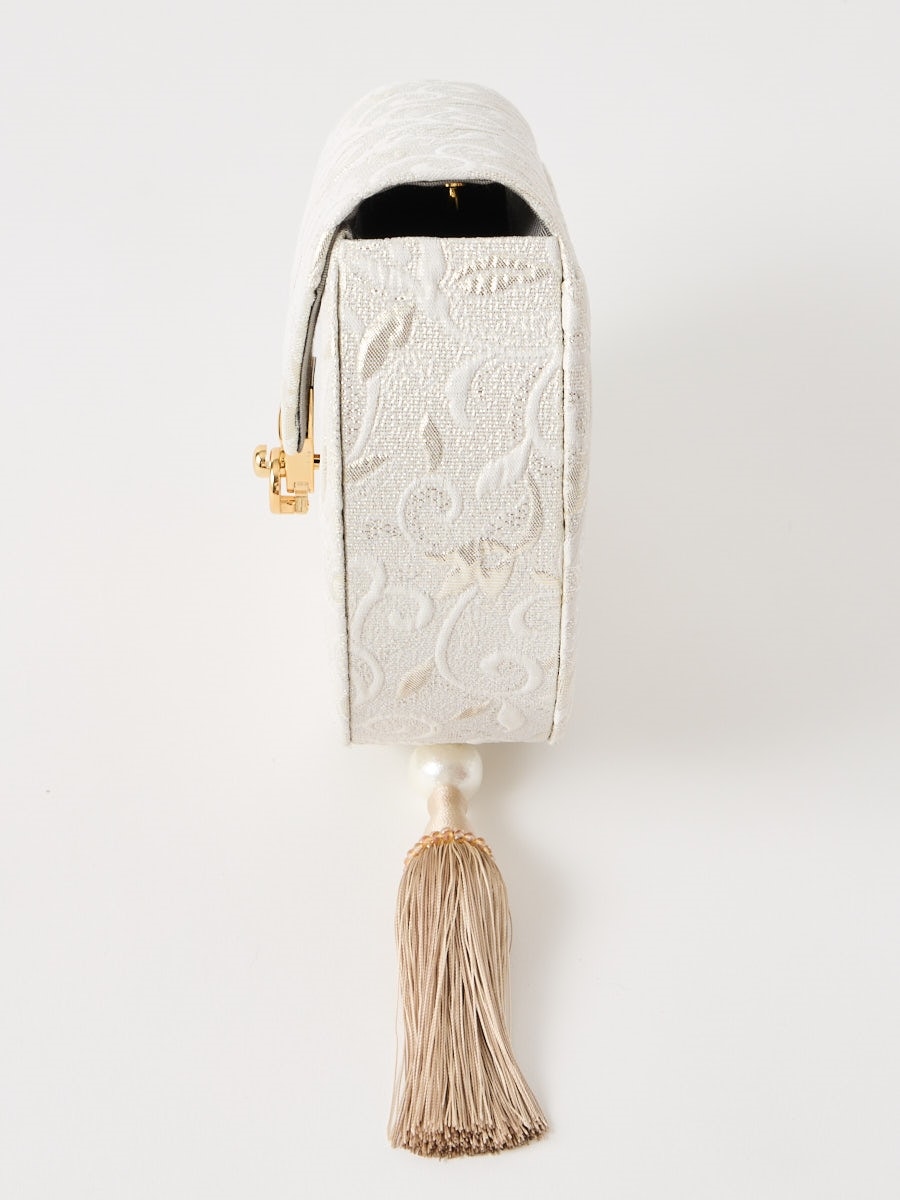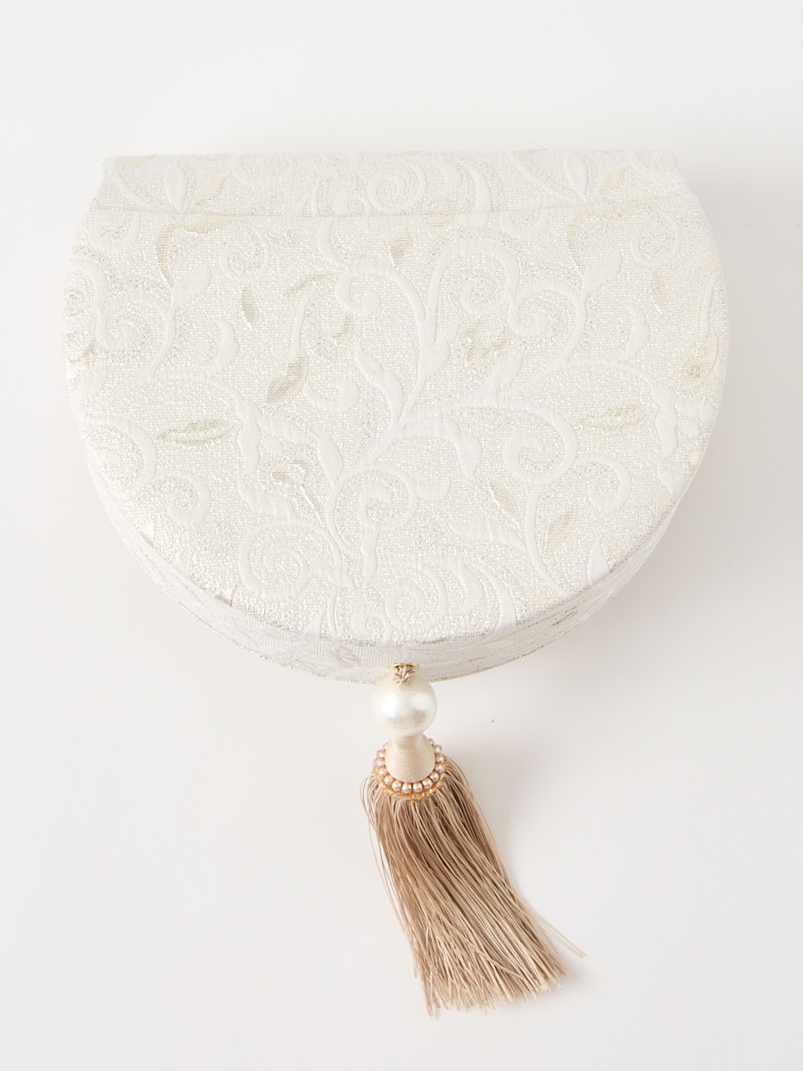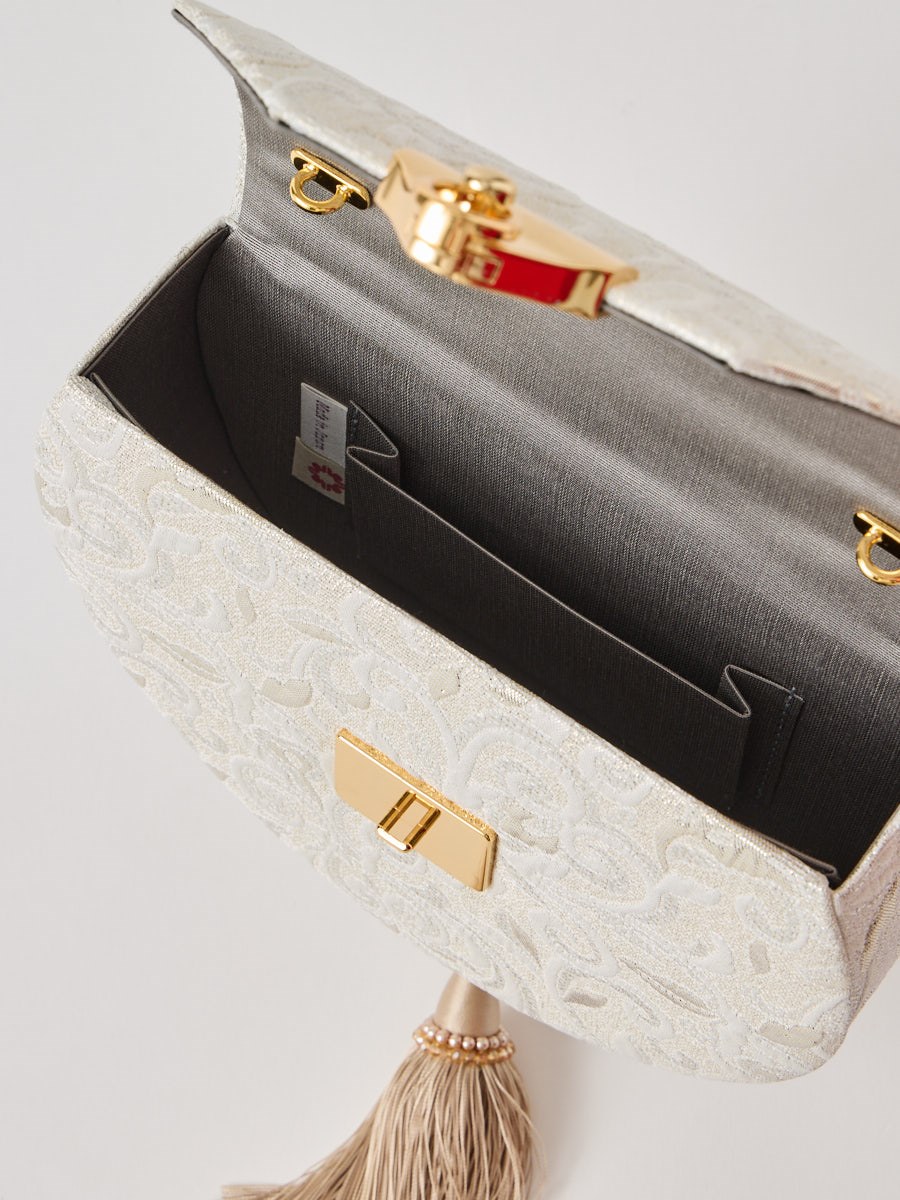 口金はおしゃれなプッシュ式デザイン、生地には銀糸が織り込まれ、ふっくらとした立体感と高級感を演出します。