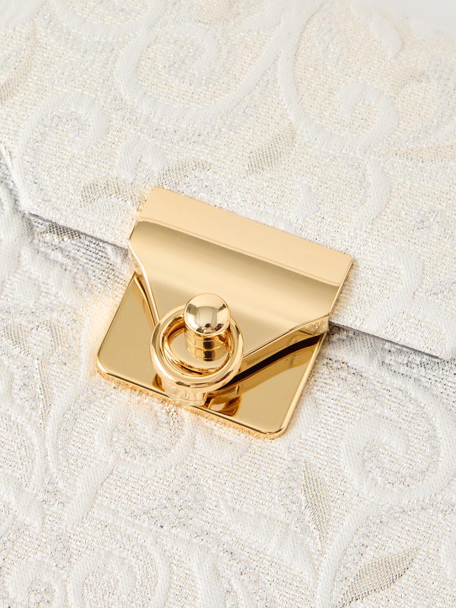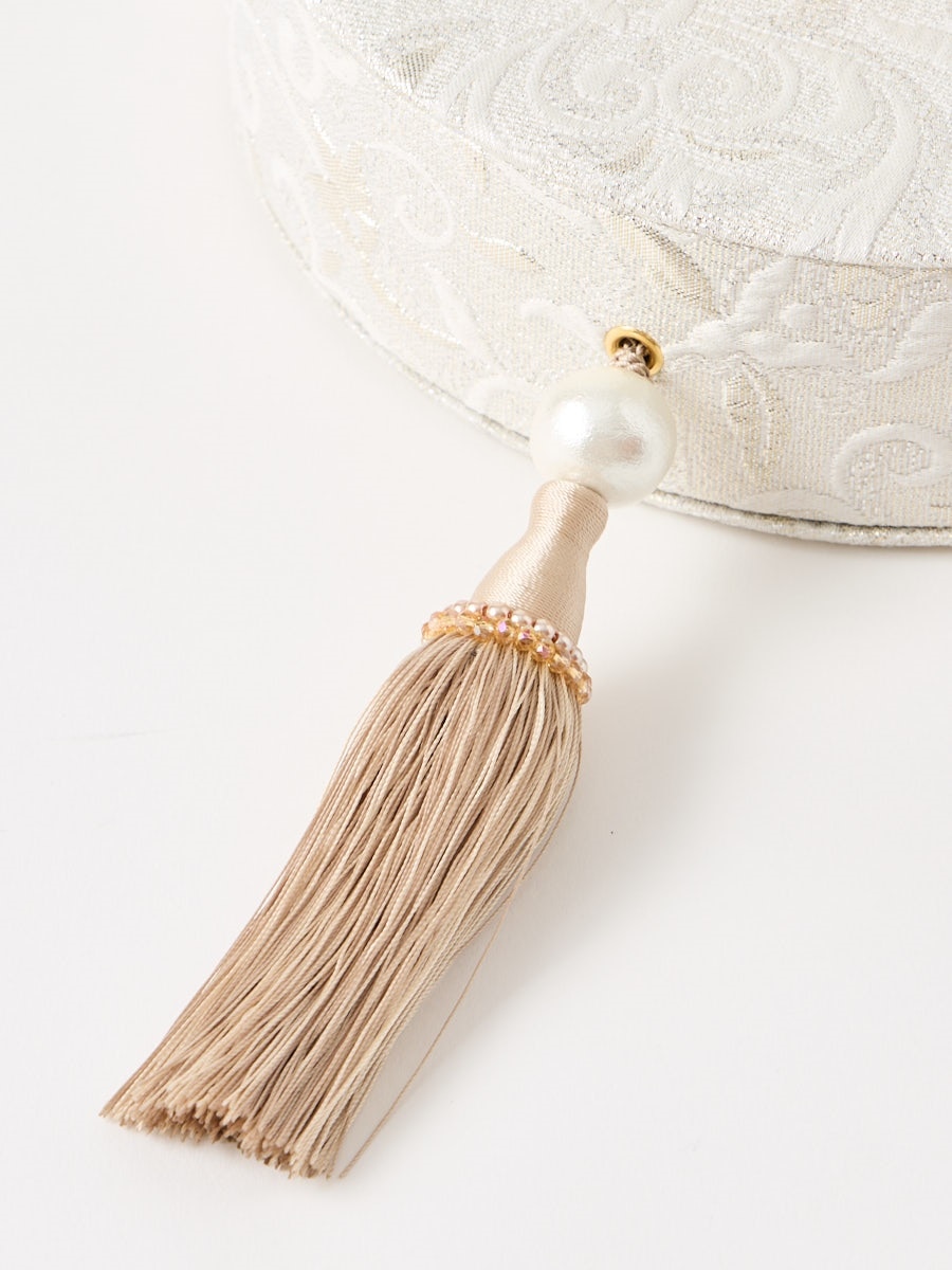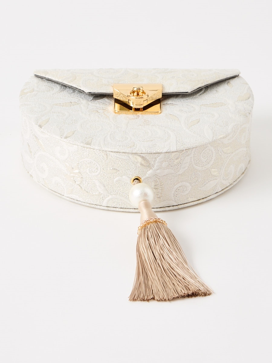 口金はおしゃれなプッシュ式デザイン、生地には銀糸が織り込まれ、ふっくらとした立体感と高級感を演出します。