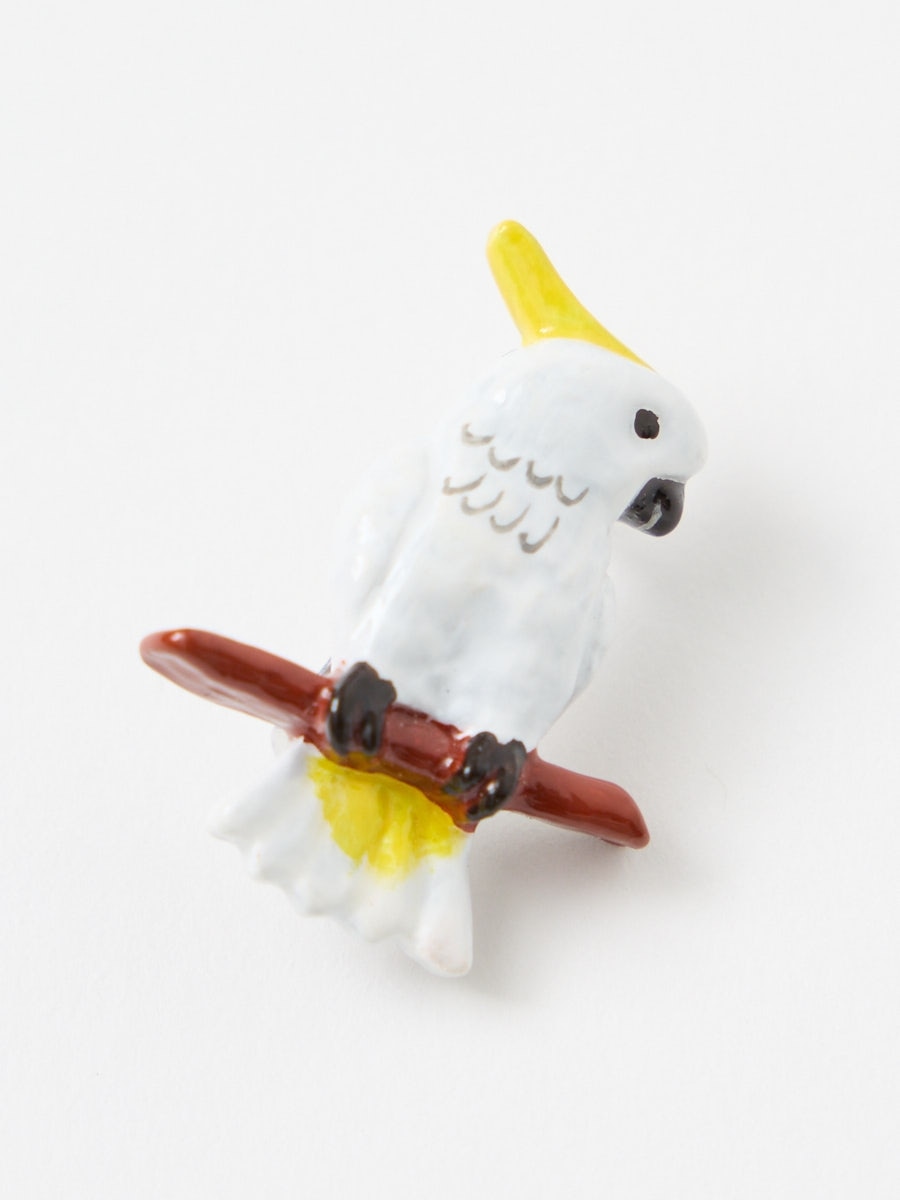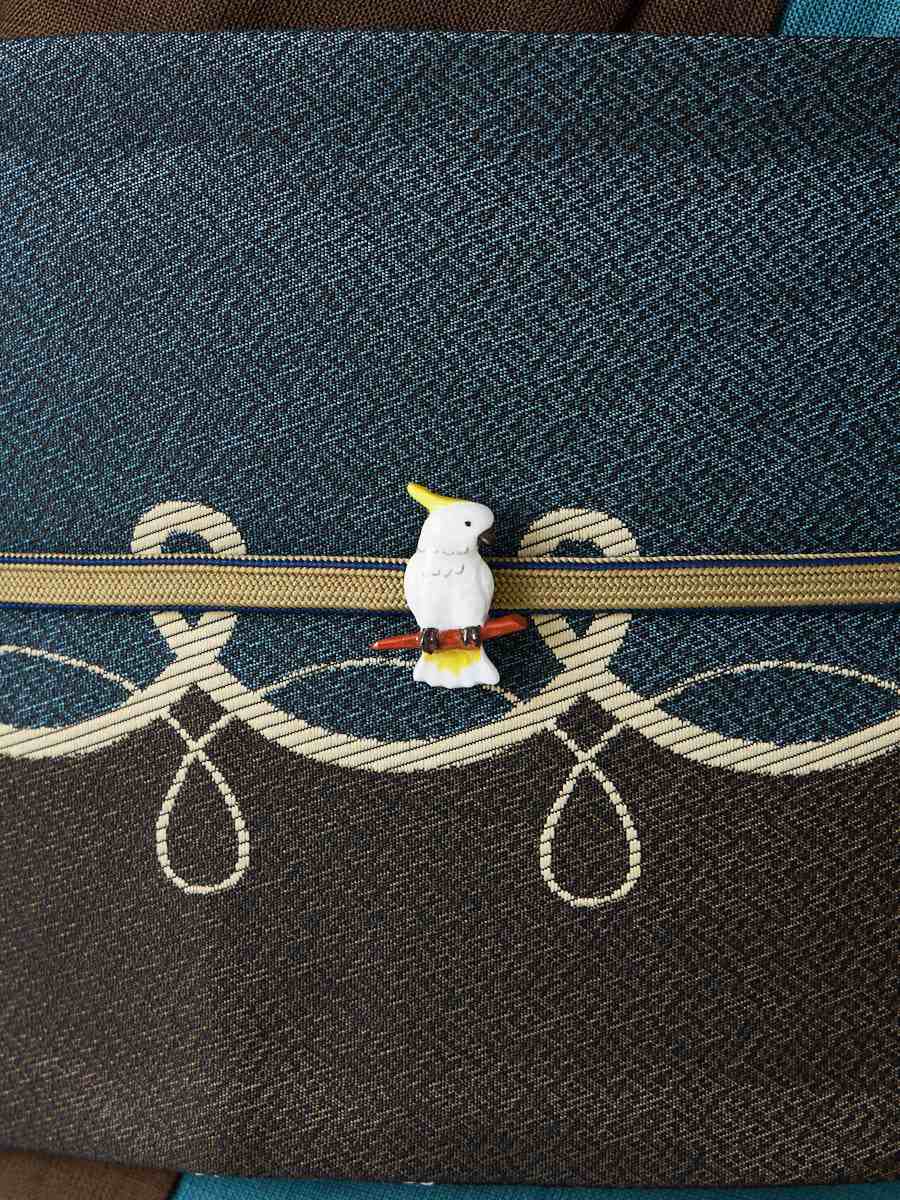 白い羽に鮮やかな黄色の冠羽が映える、オウムの「キバタン」をモチーフにした帯留めです。 つぶらな瞳と枝にとまる愛らしい姿は、手仕事ならではの温かみが感じられ、見ているだけで心が和みます。