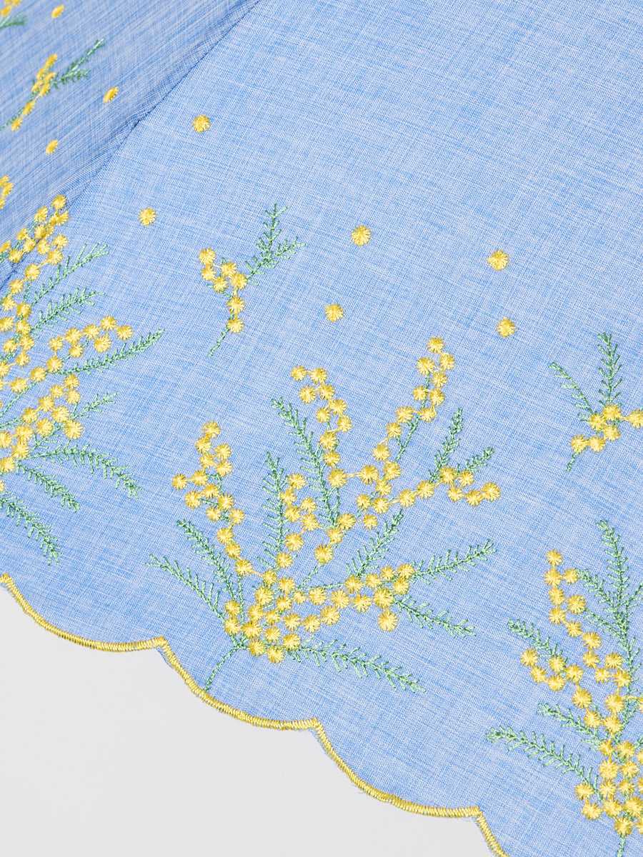 ポンポンと可憐に咲くミモザ刺繍が、控えめながらも華やかな雰囲気をプラス。麻風の生地に映えるイエローは、見ているだけでハッピーな気分になります。