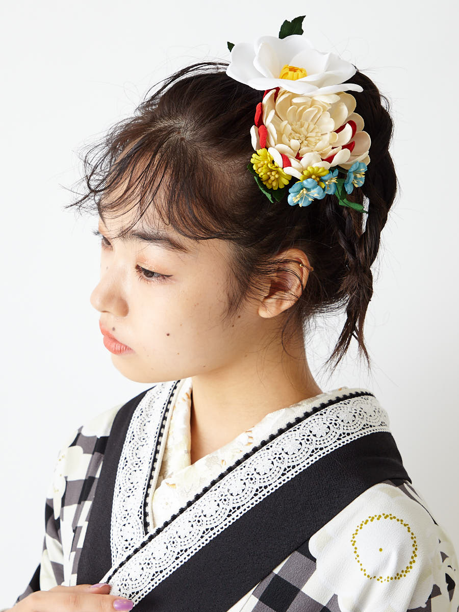 定番の椿に、まん丸の梅の花、菊を合わせました。 色々なお花がコラージュされながらも、きちんとまとまり感があります。 レトロモダンな華やかなヘアスタイルが出来上がります。