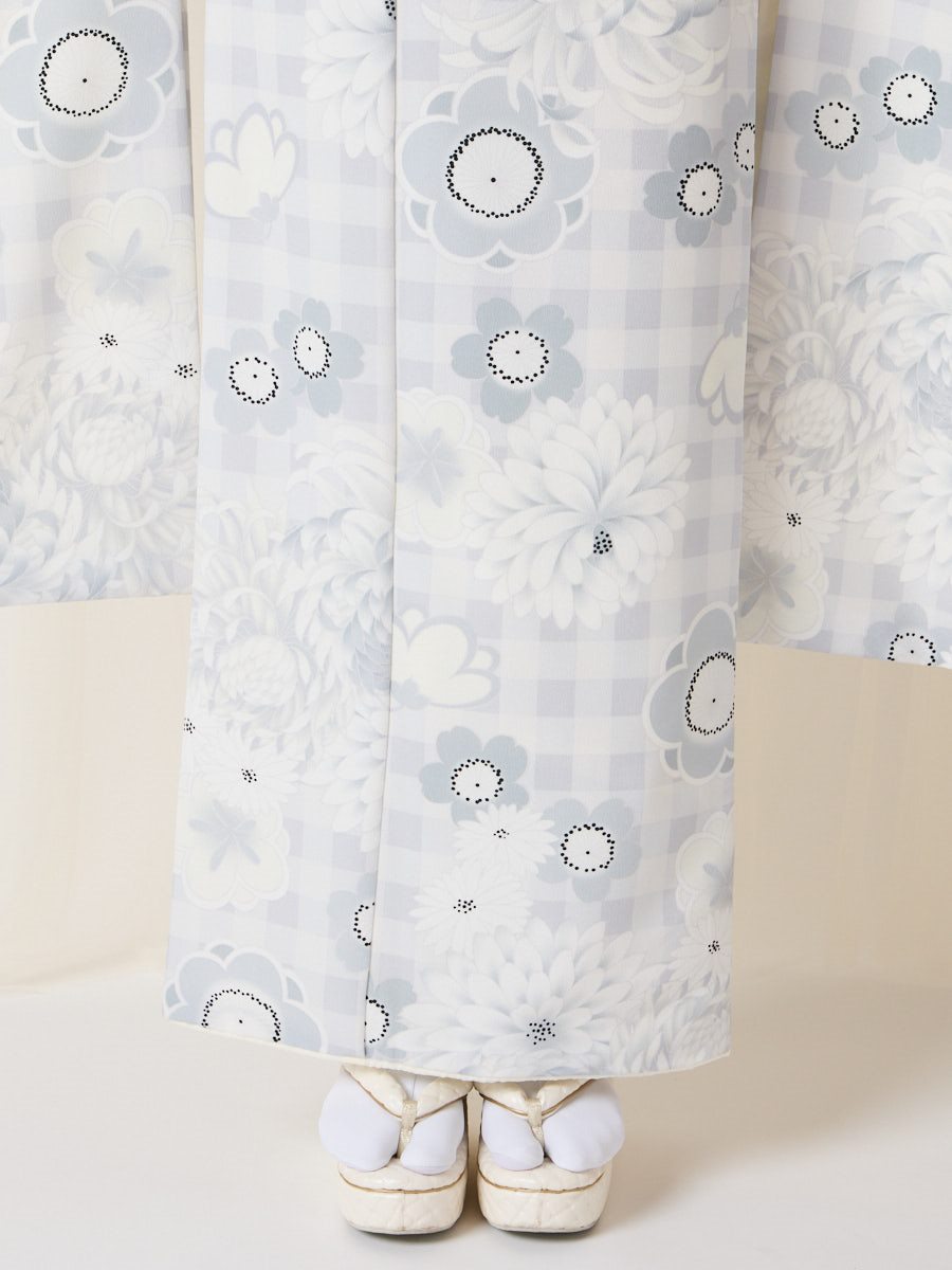 ギンガムチェックをベースに、古典的な乱菊や梅、桜を組み合わせたふりふらしいレトロモダンな振袖。