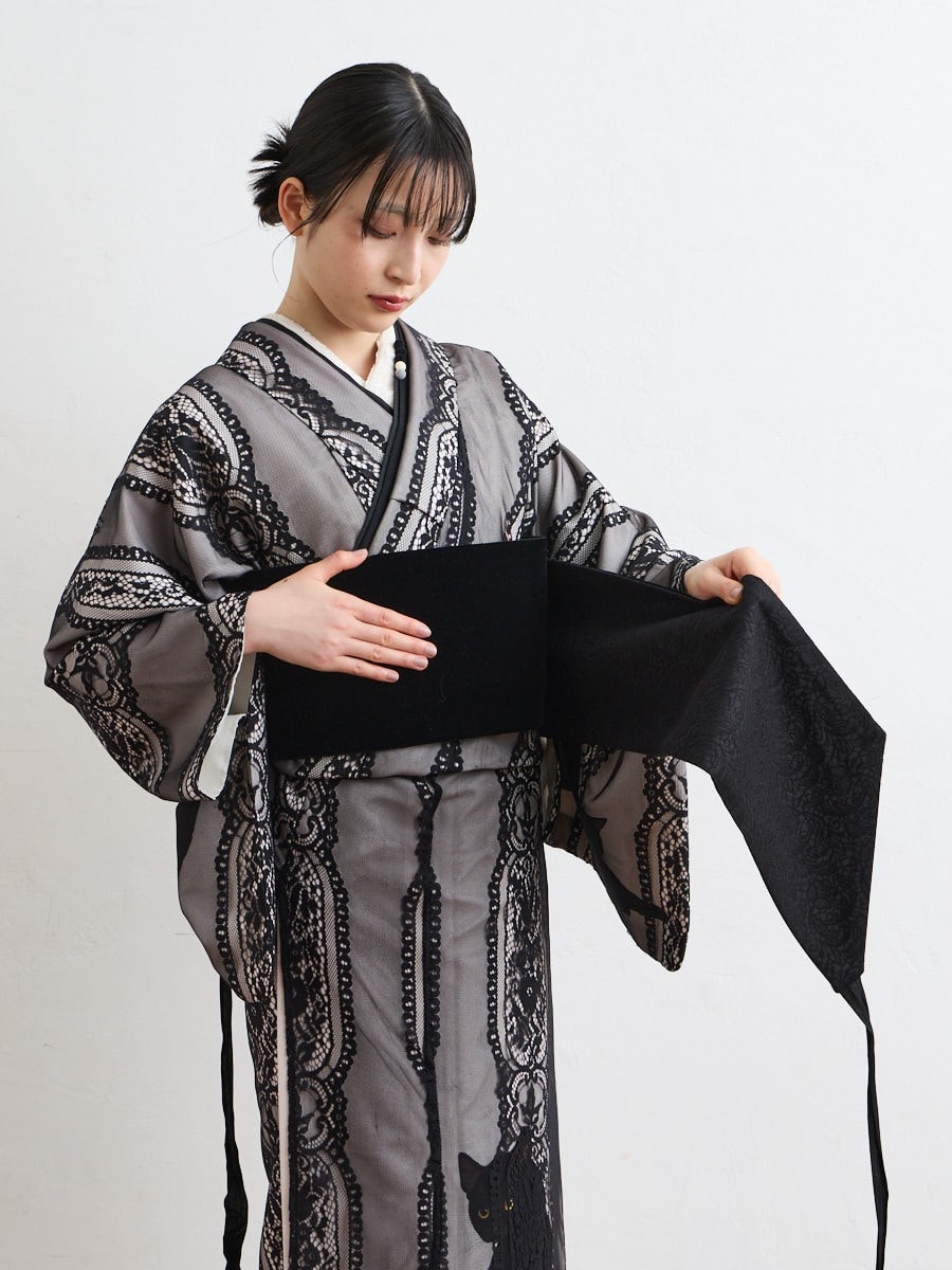 立体感のあるひだの帯結びがポイントで、コーディネートしやすく、幅広い装いに合わせやすいデザインです。