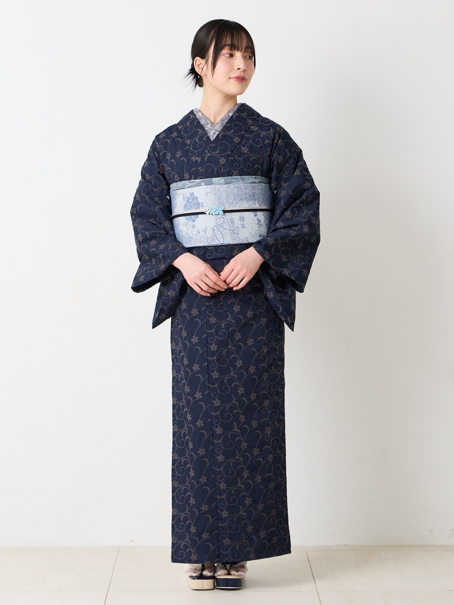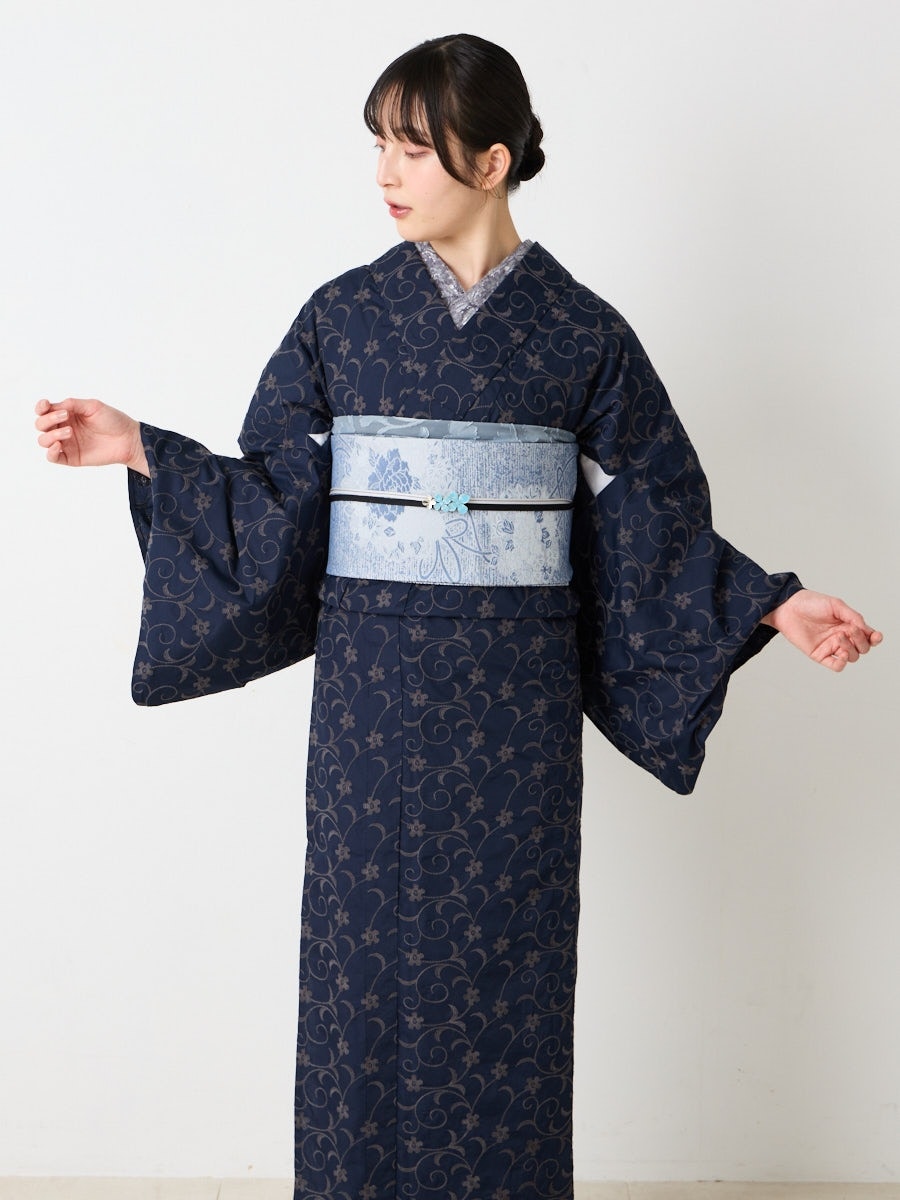 裏地は縞柄の落ち着いた濃淡配色で合わせやすい両面帯です。