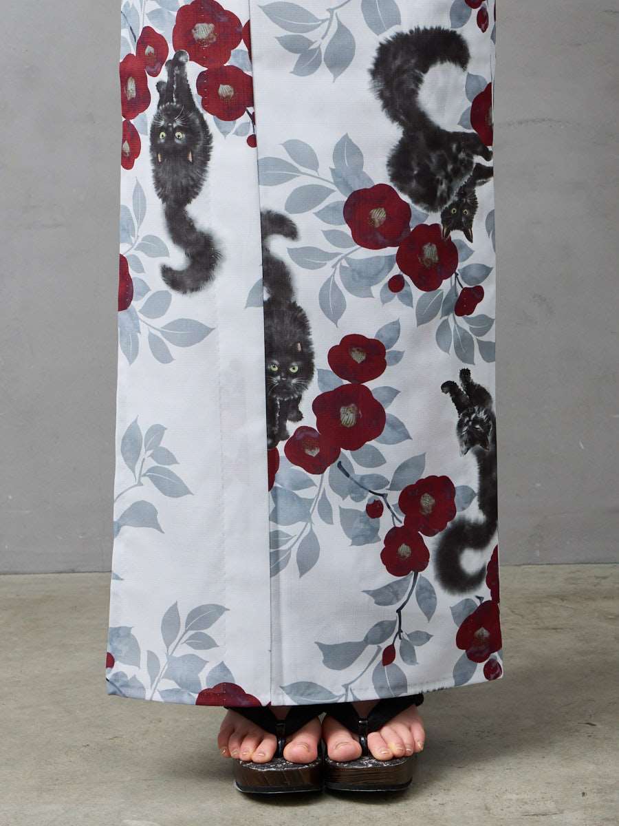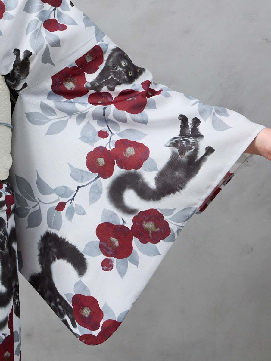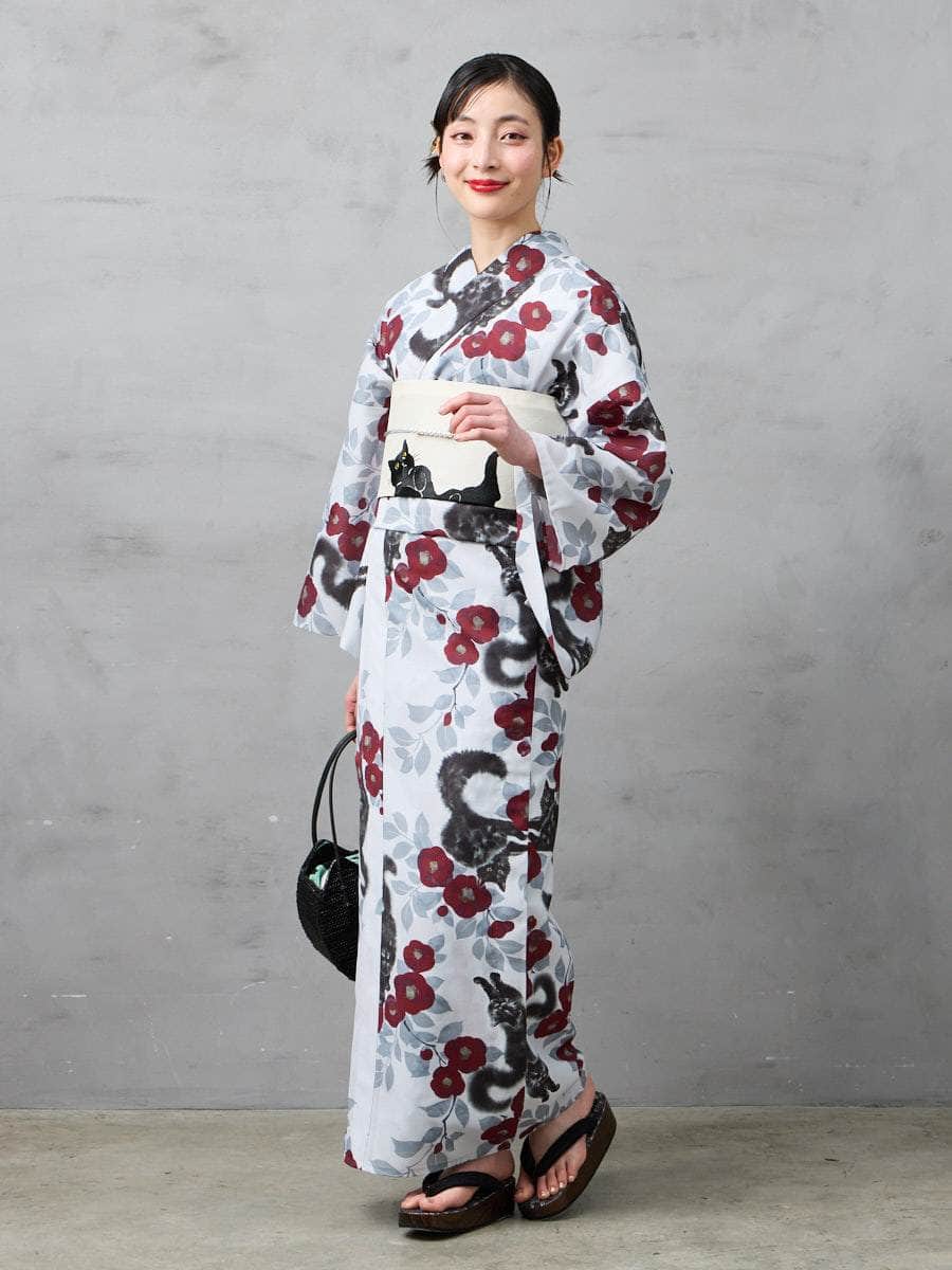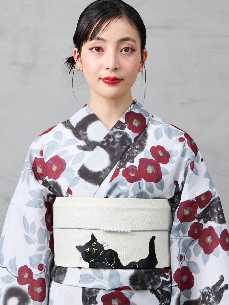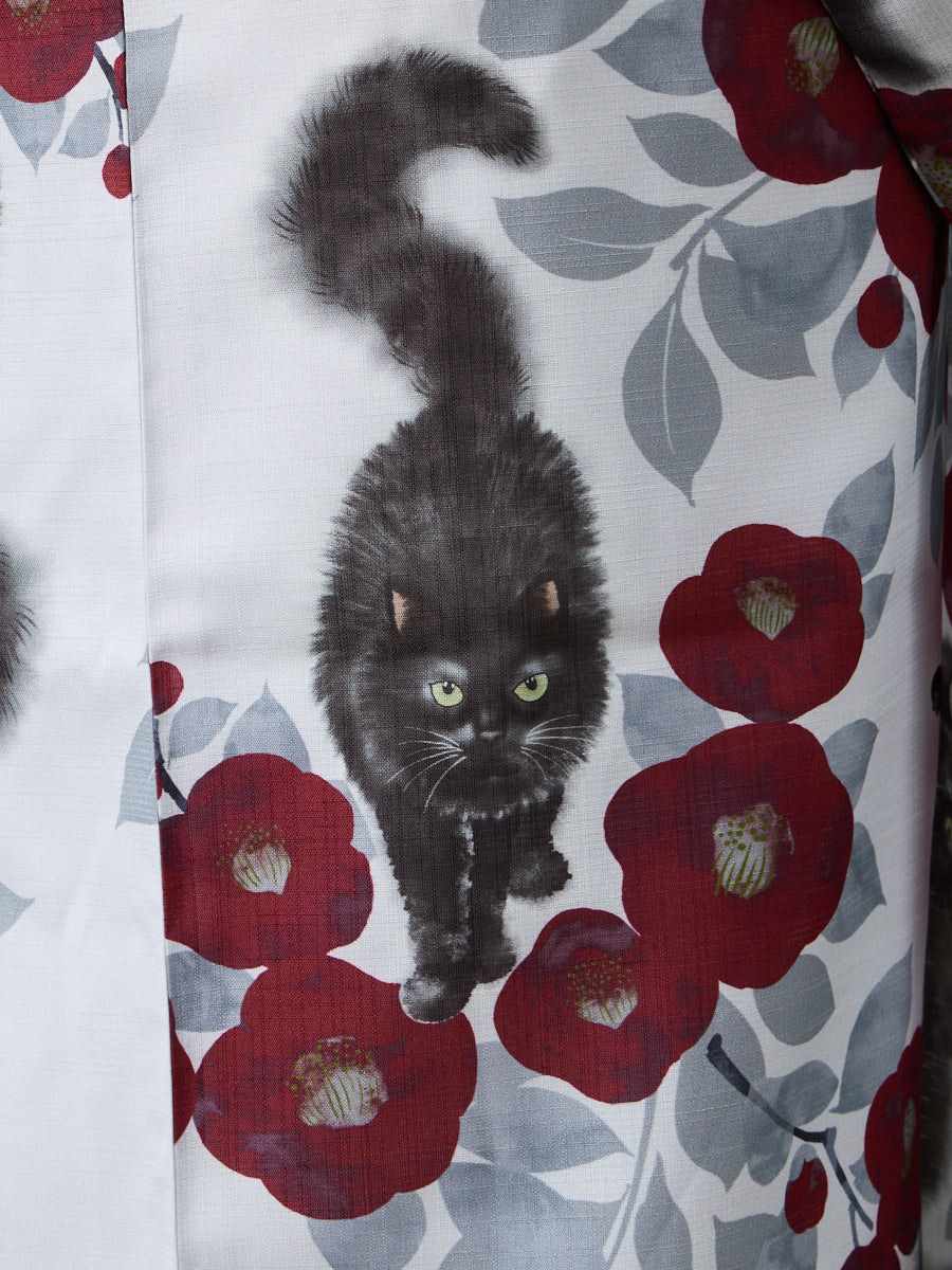 実物を拝見し素敵すぎて大変気に入りました!猫ちゃんも可愛いのは当然のことながら、ライトグレー生地の中に猫柄にダークレッドカラーの椿が妖艶な色気を感じますw。一緒に帯も猫柄を今回購入したのでモデルさんのようにコーデしようと今から楽しみです☆毎年必ず1着は浴衣を購入させてもらっていますが、ホントにいつも大満足デス☆