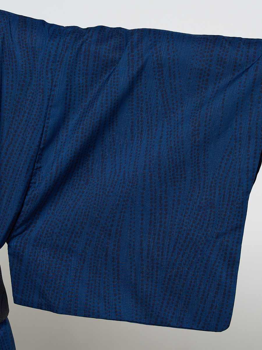 流れるような点描柄に、落ち着いた青みのネイビーカラーで夏らしい一着。