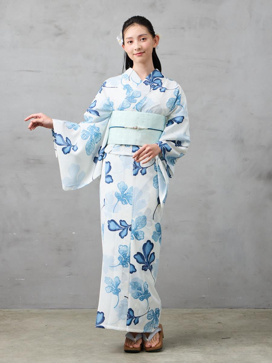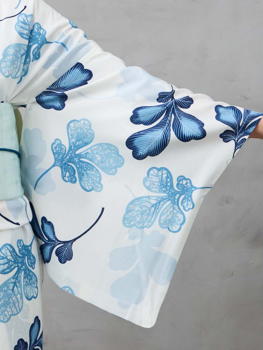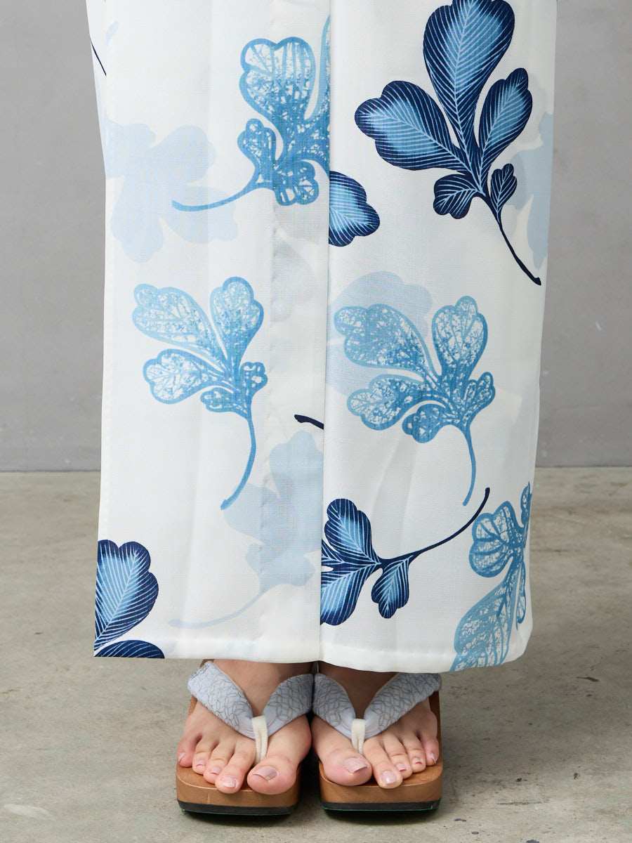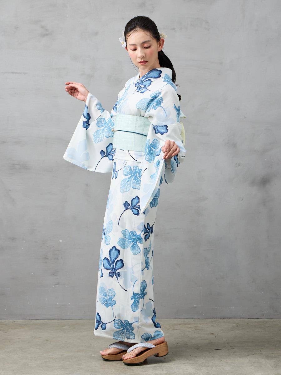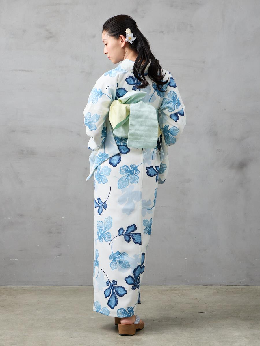 繊細な葉脈の線と、葉のぼかし、流れる図案が涼し気な浴衣。