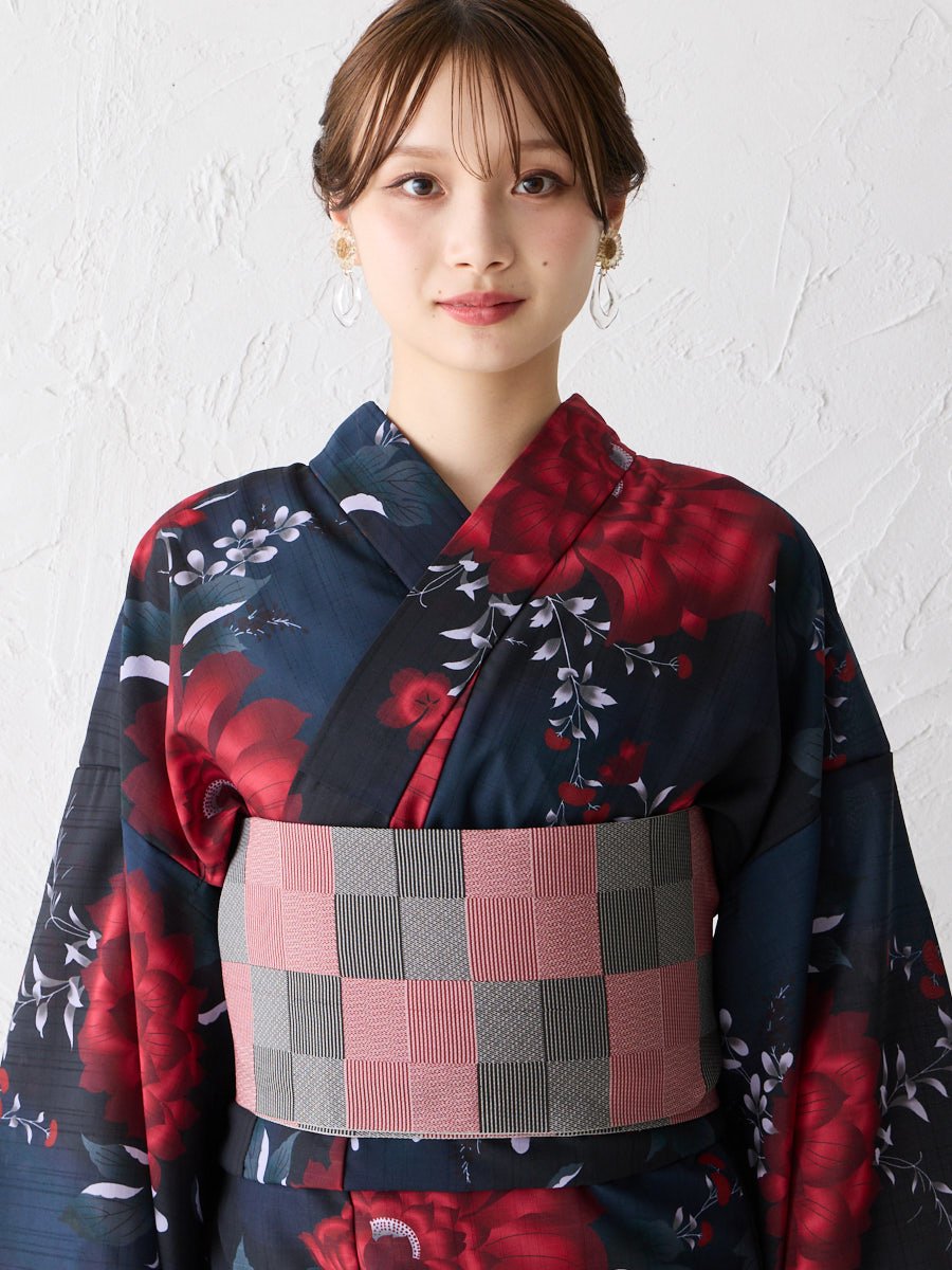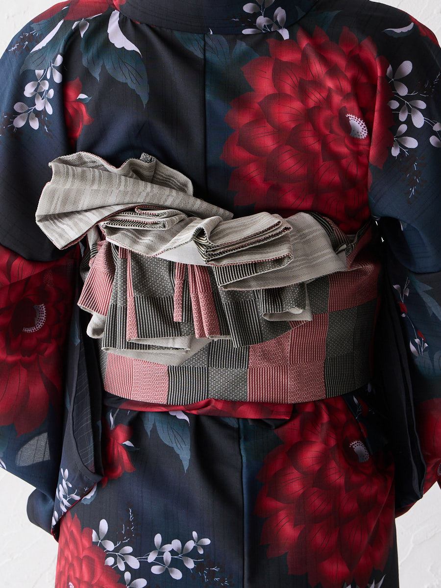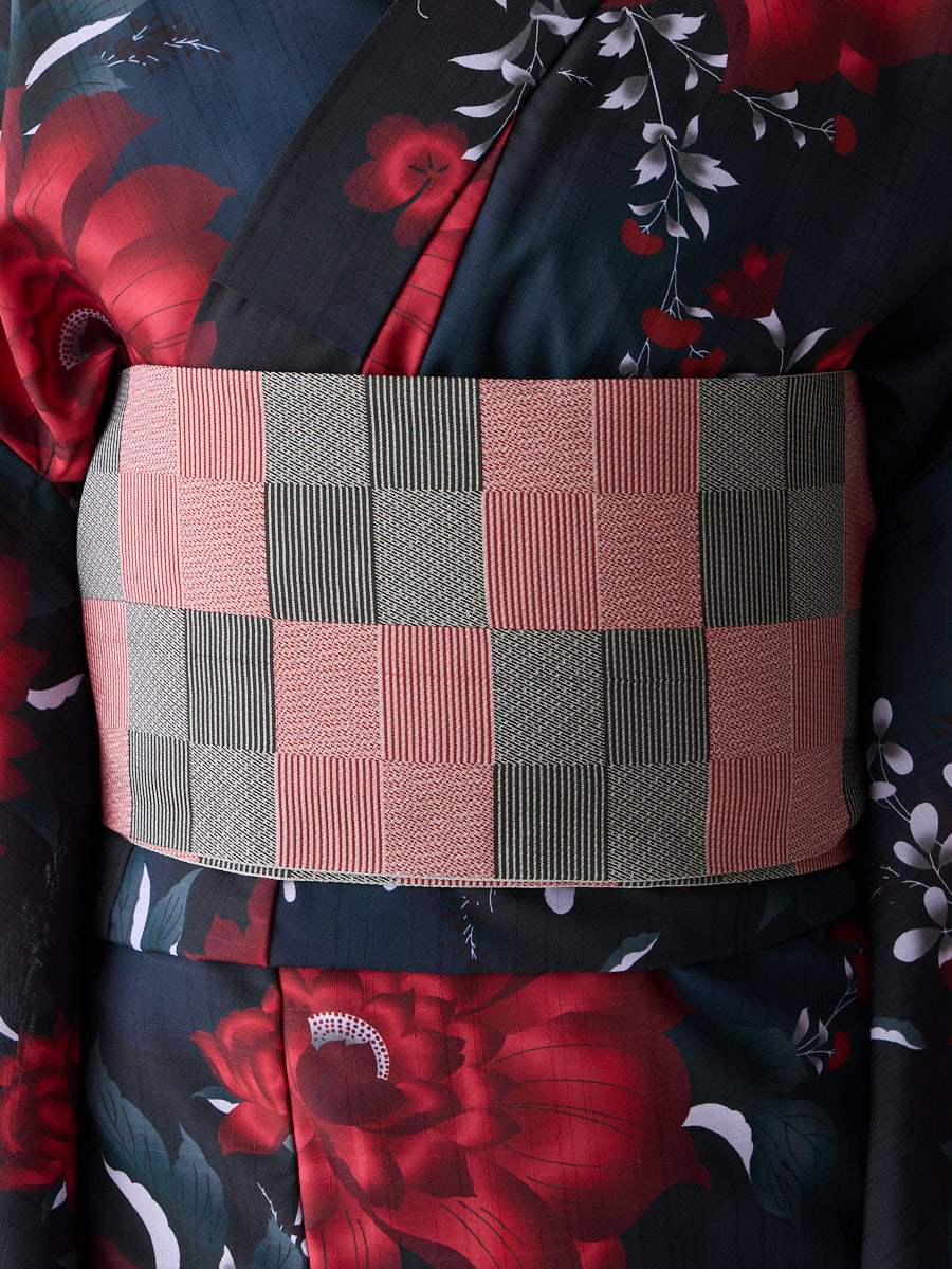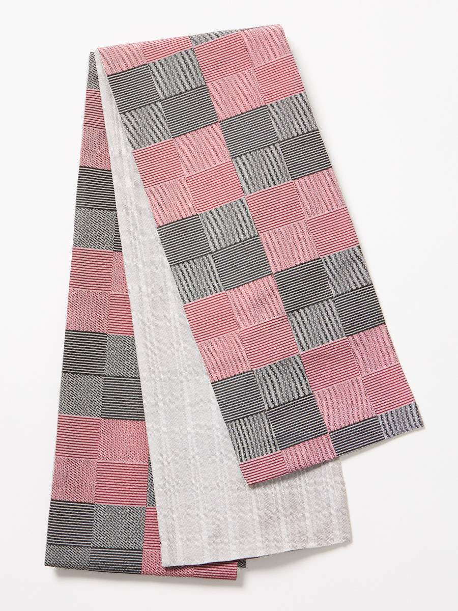 セットの帯は小さな市松柄で大きな市松柄を表現するこだわりをプラス。リバーシブル仕様で無地感のグレーも使いやすく、錯覚のようなデザインが着こなしに奥行きを添えます。