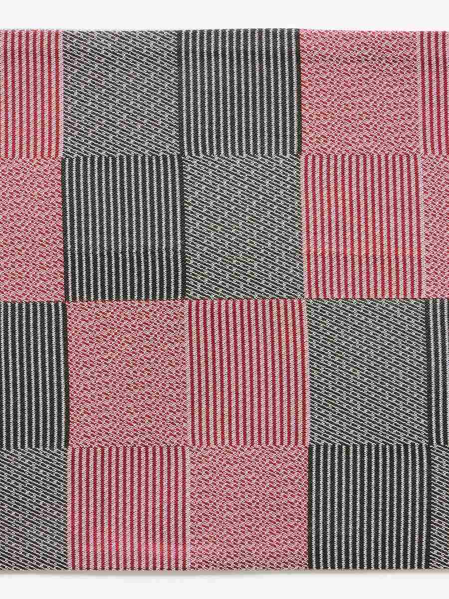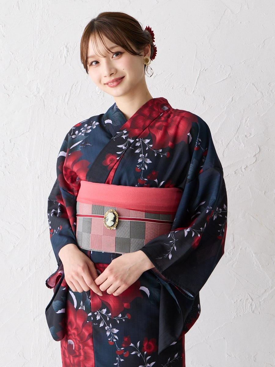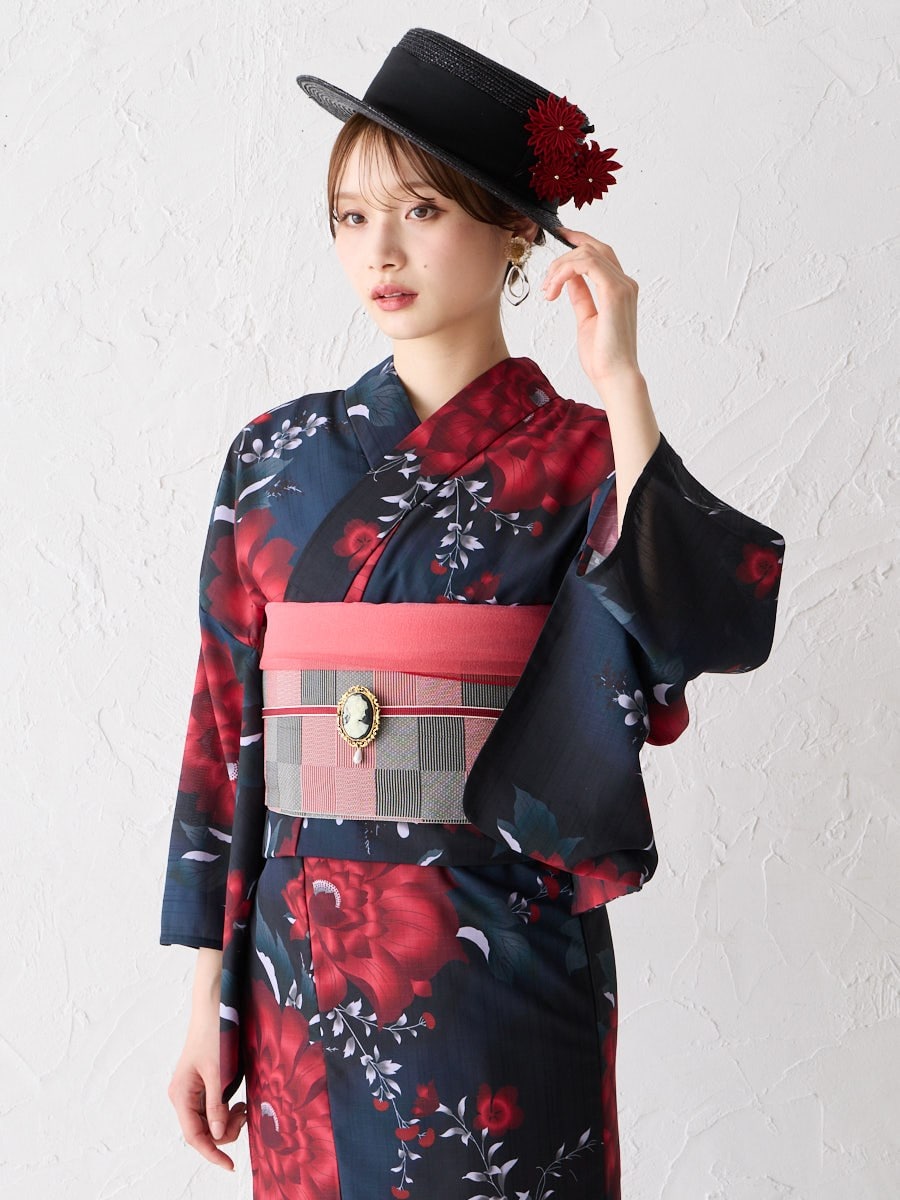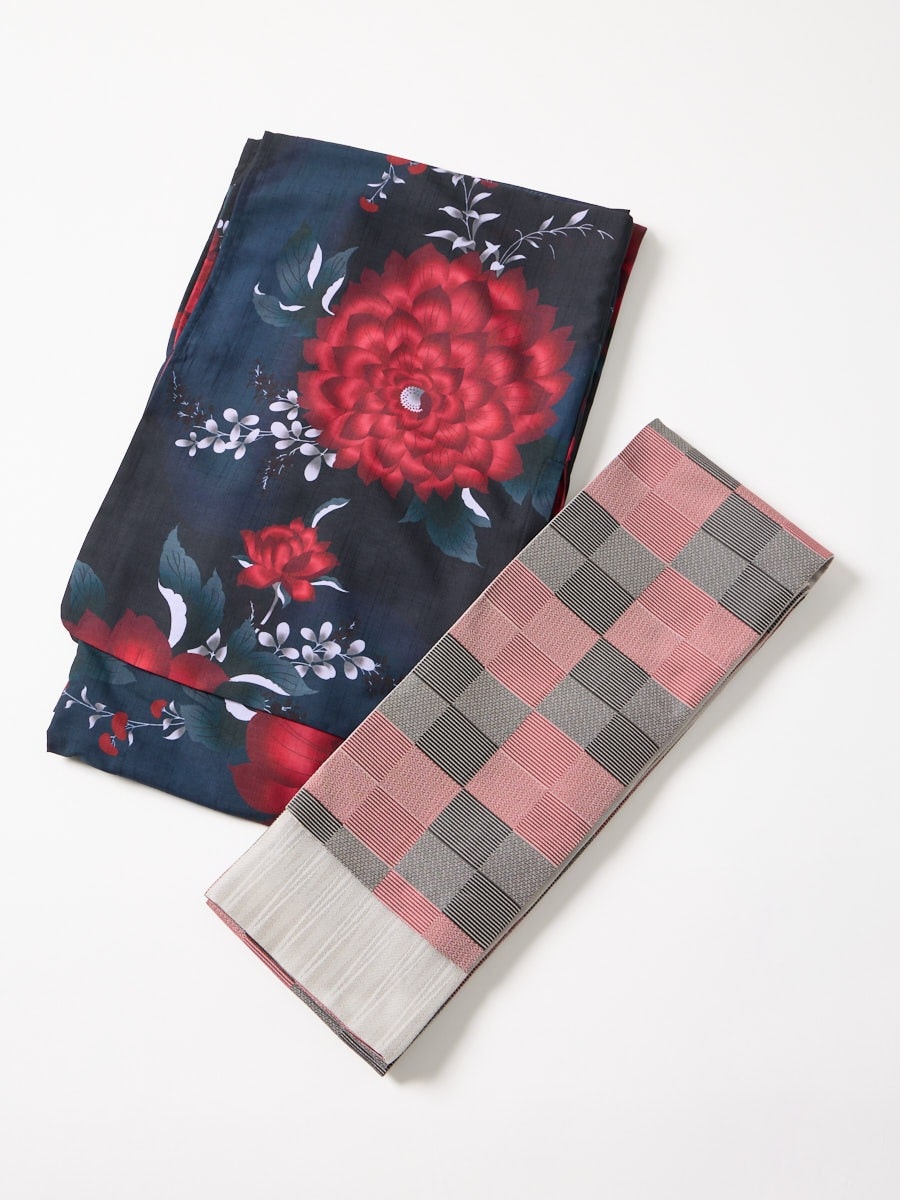 セットの帯は小さな市松柄で大きな市松柄を表現するこだわりをプラス。リバーシブル仕様で無地感のグレーも使いやすく、錯覚のようなデザインが着こなしに奥行きを添えます。