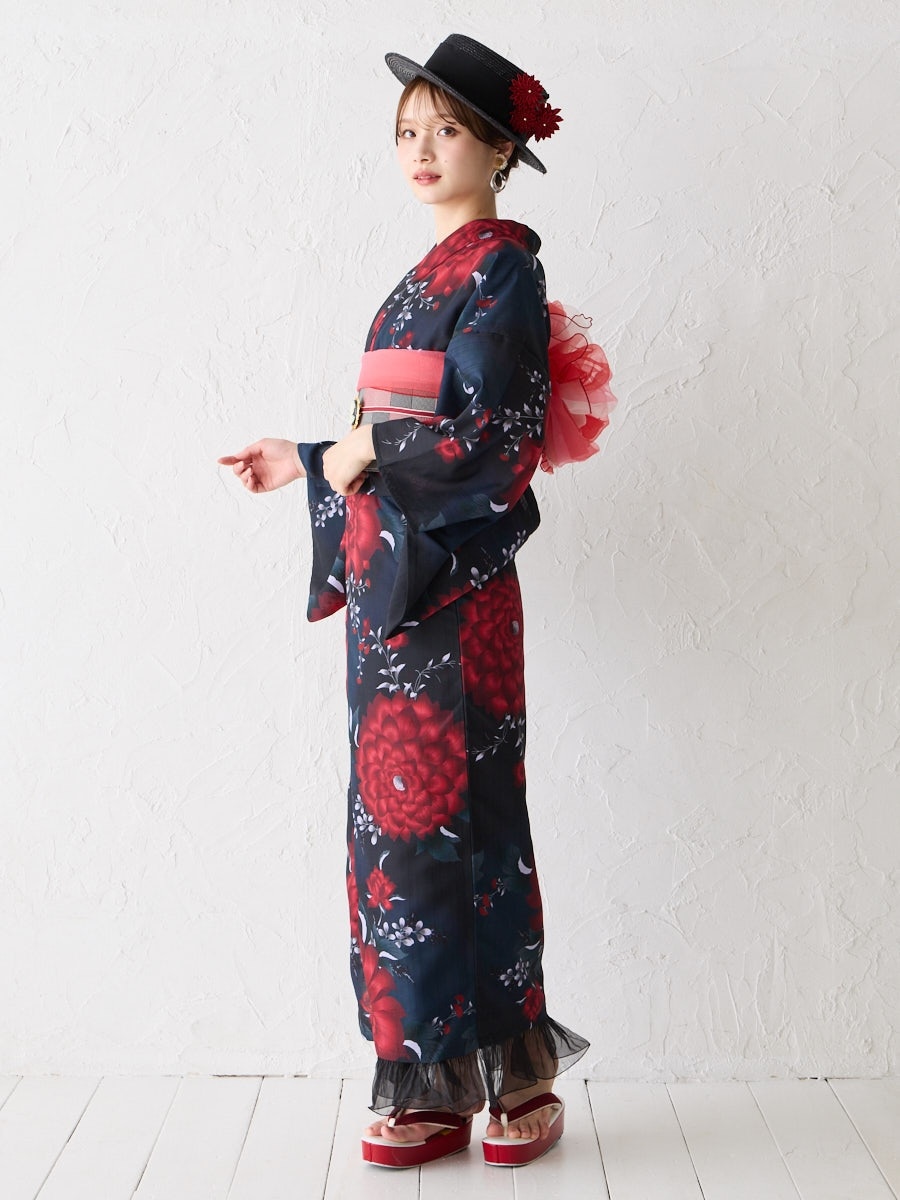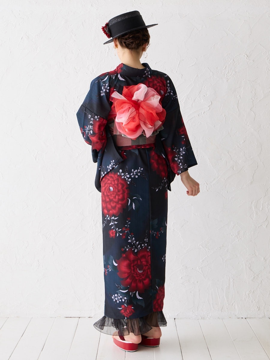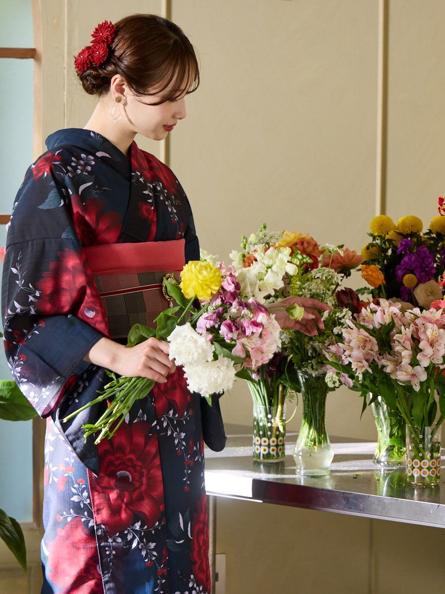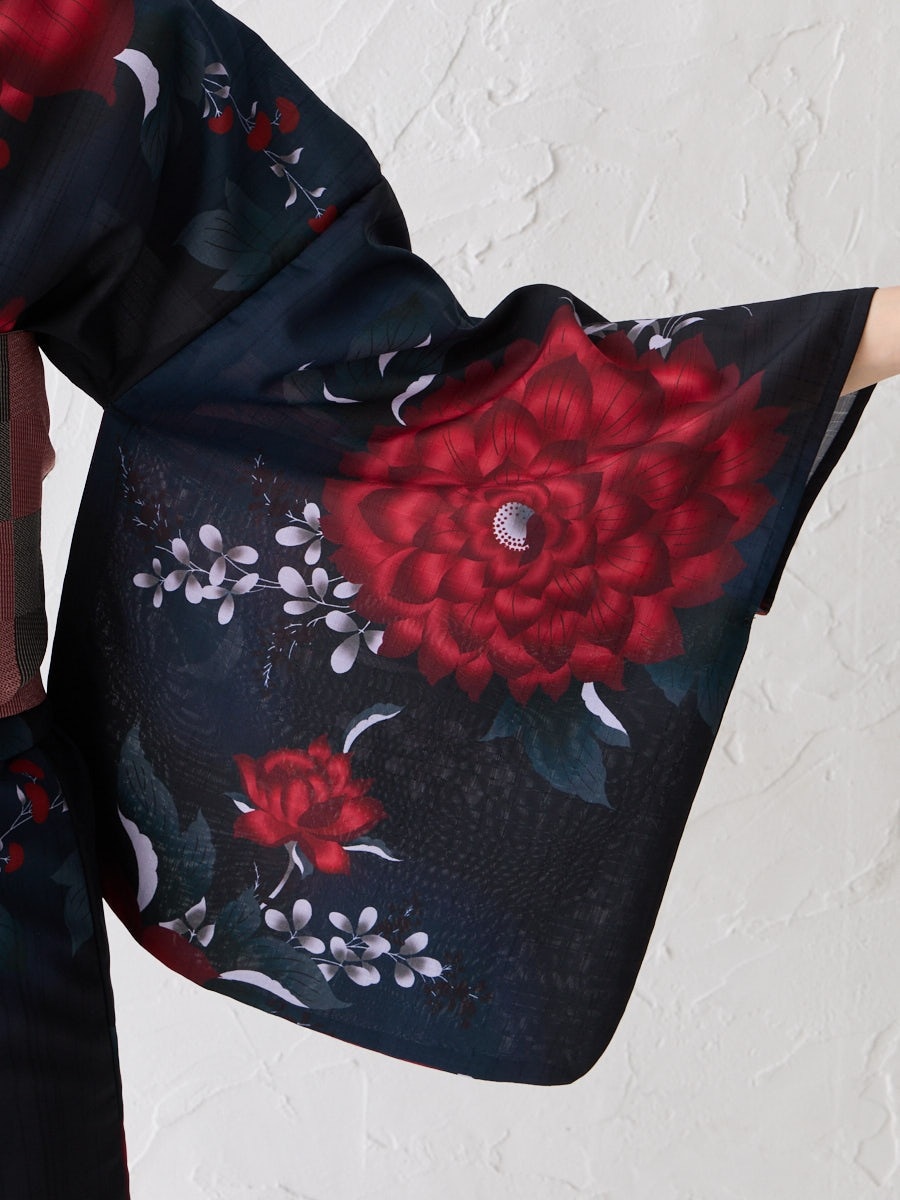 深みのある黒地に、艶やかに咲く赤いダリアを大胆に描いた印象的な浴衣。