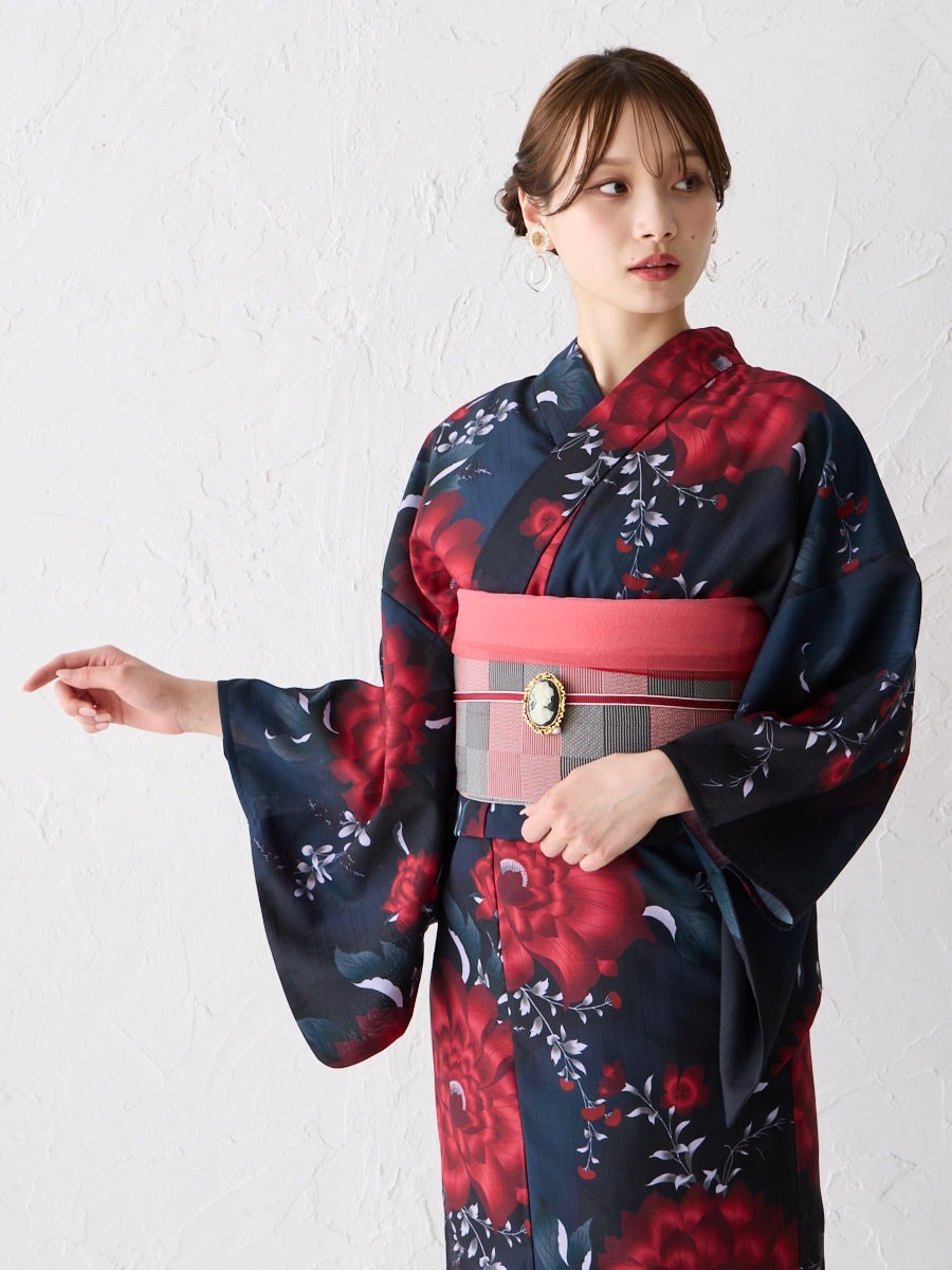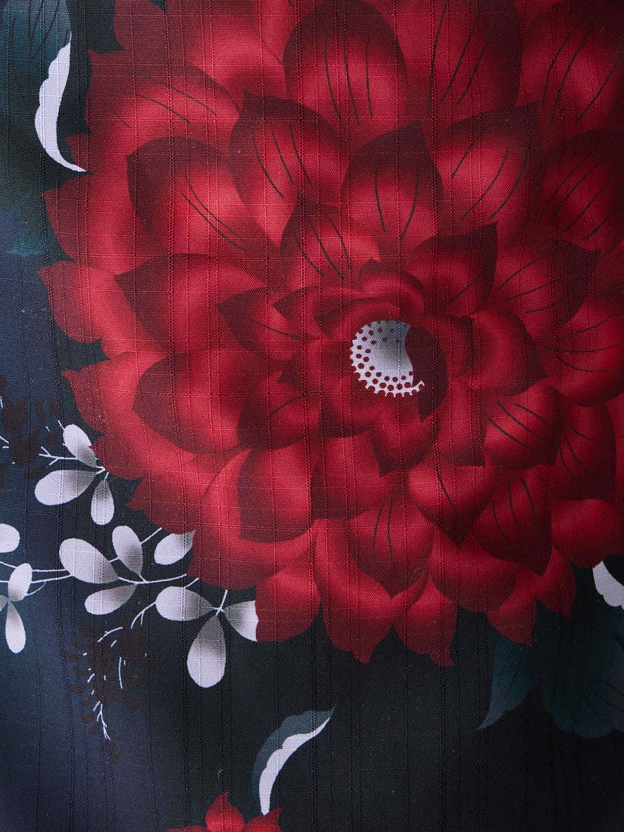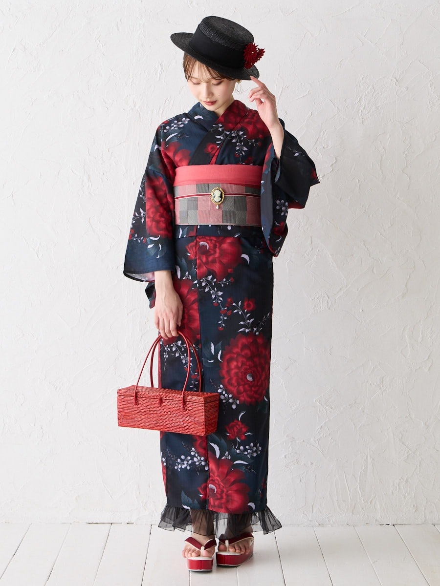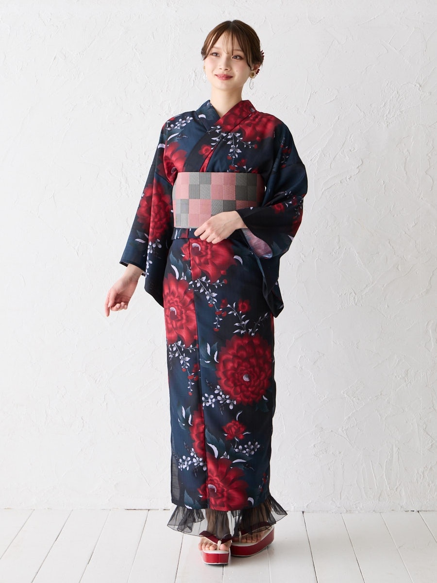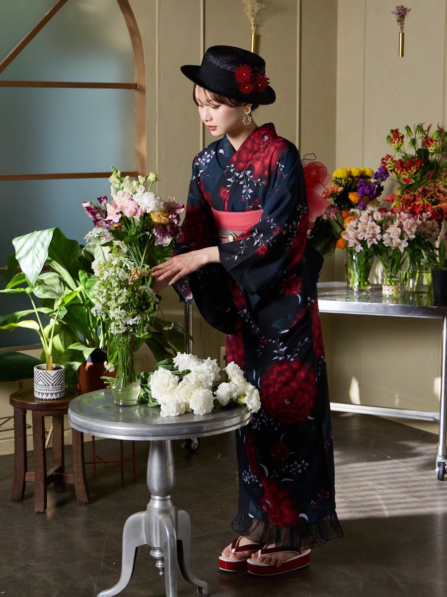 深みのある黒地に、艶やかに咲く赤いダリアを大胆に描いた印象的な浴衣。
