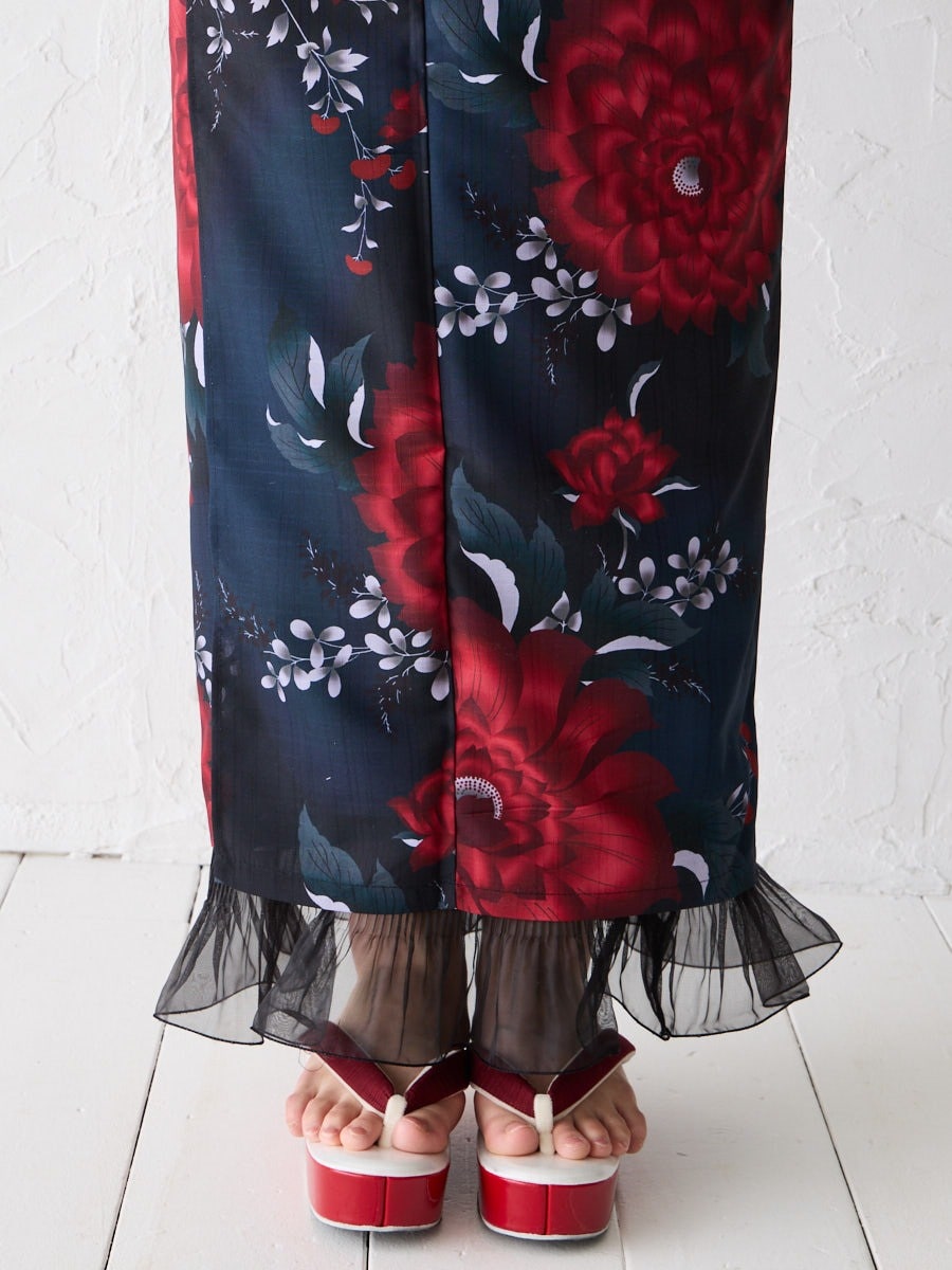 白やグレーの繊細な草花が軽やかな抜け感を生み、黒と赤のコントラストをより際立たせます。華やかでありながら甘くなりすぎず、大人っぽく印象的に着こなせる一枚です。