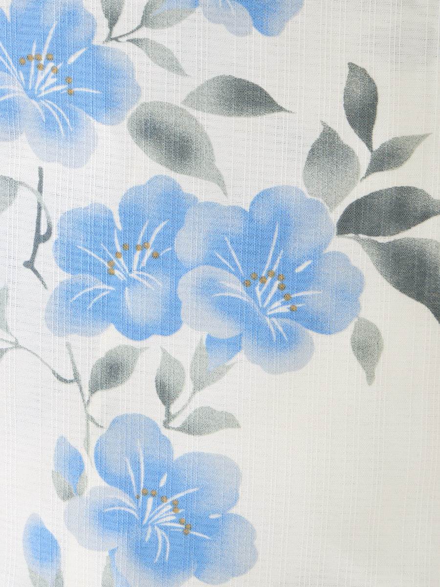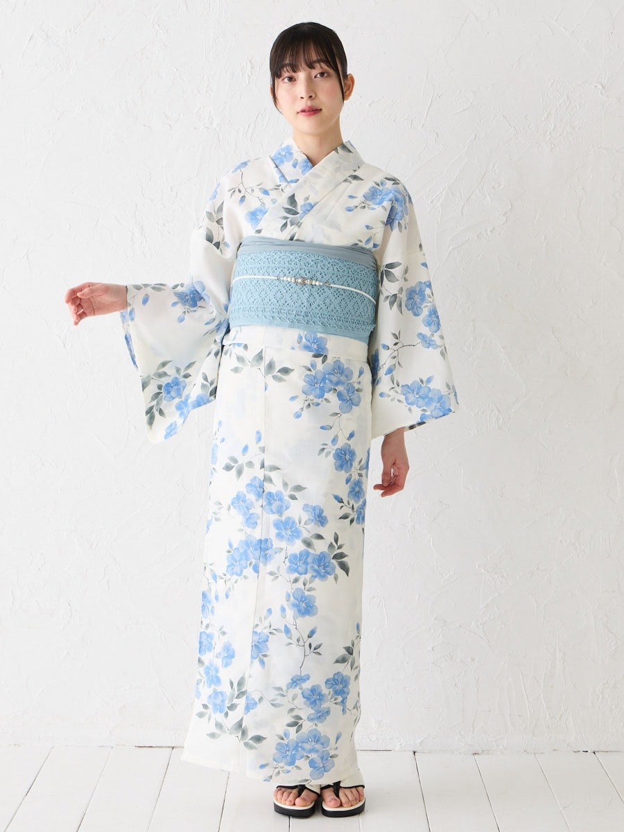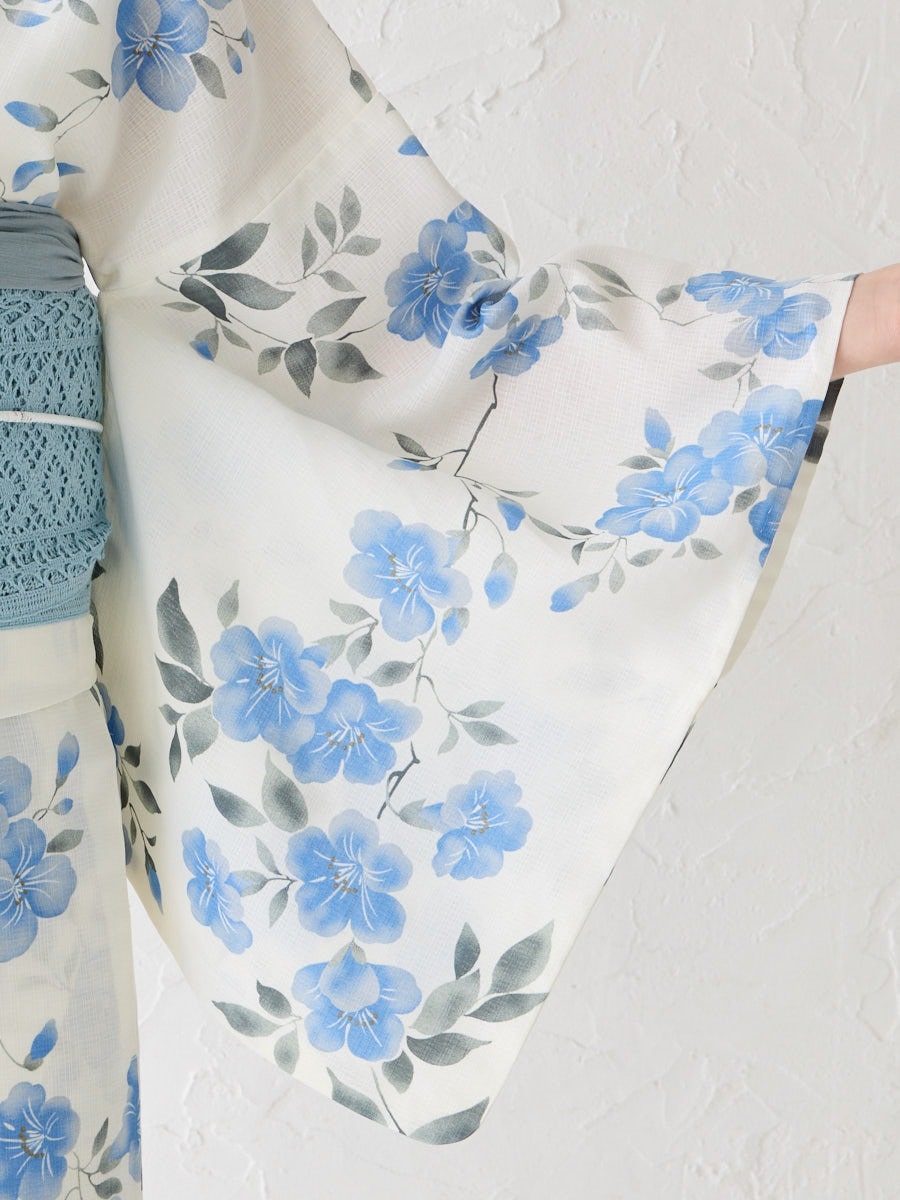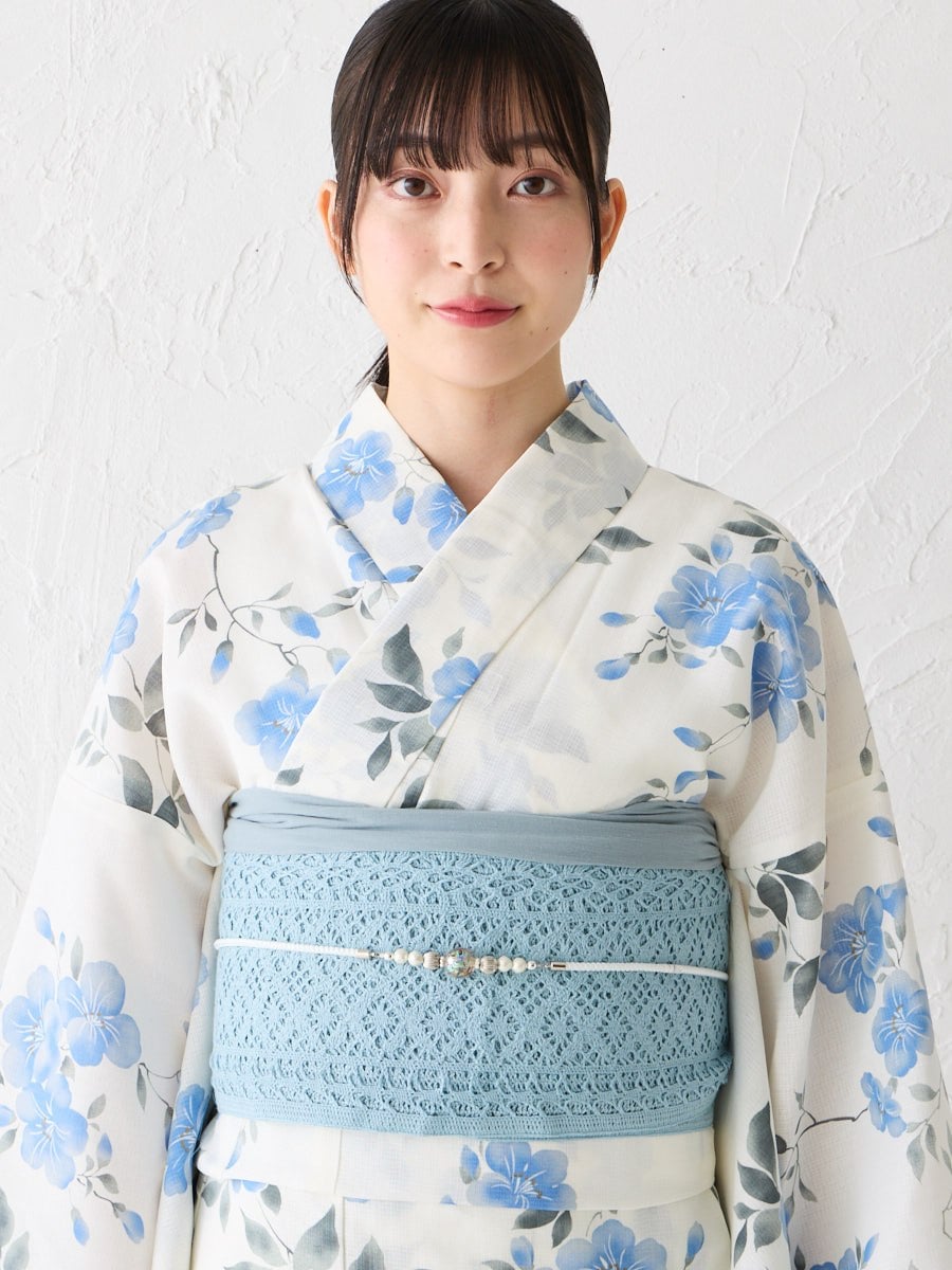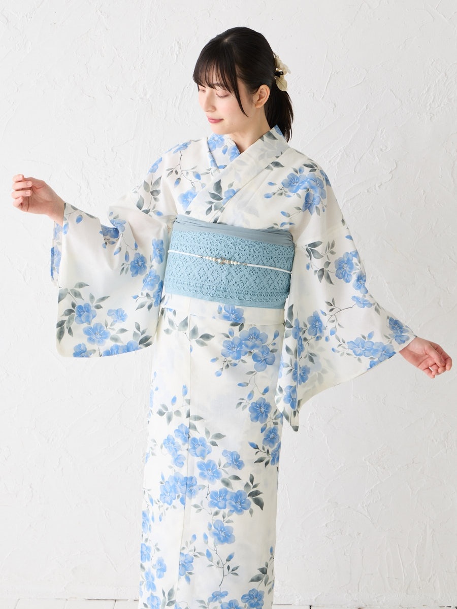 白地にニュアンスカラーの水色の花をあしらった「かずら」は、清涼感あふれる涼やかな印象と、どこか愛らしい可憐さを演出してくれる一枚です。