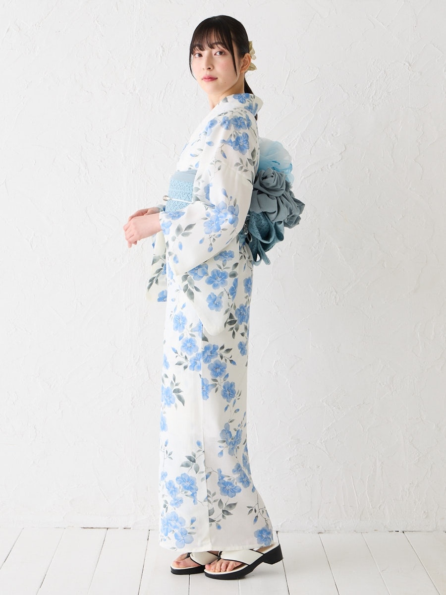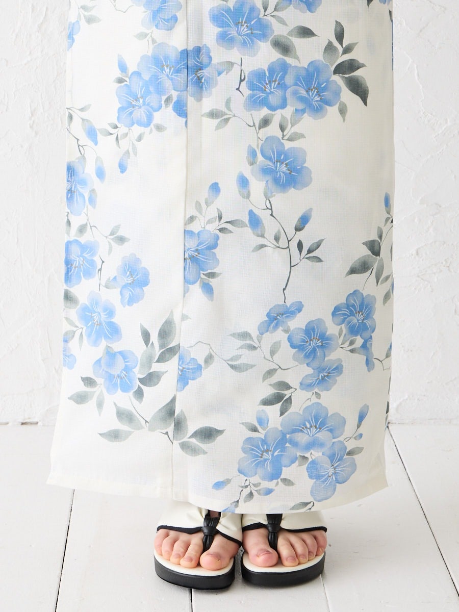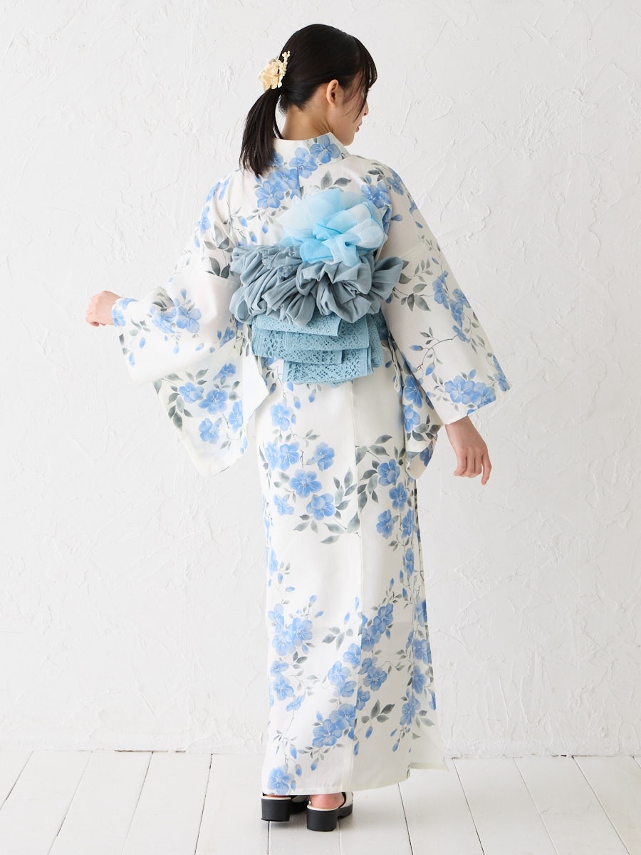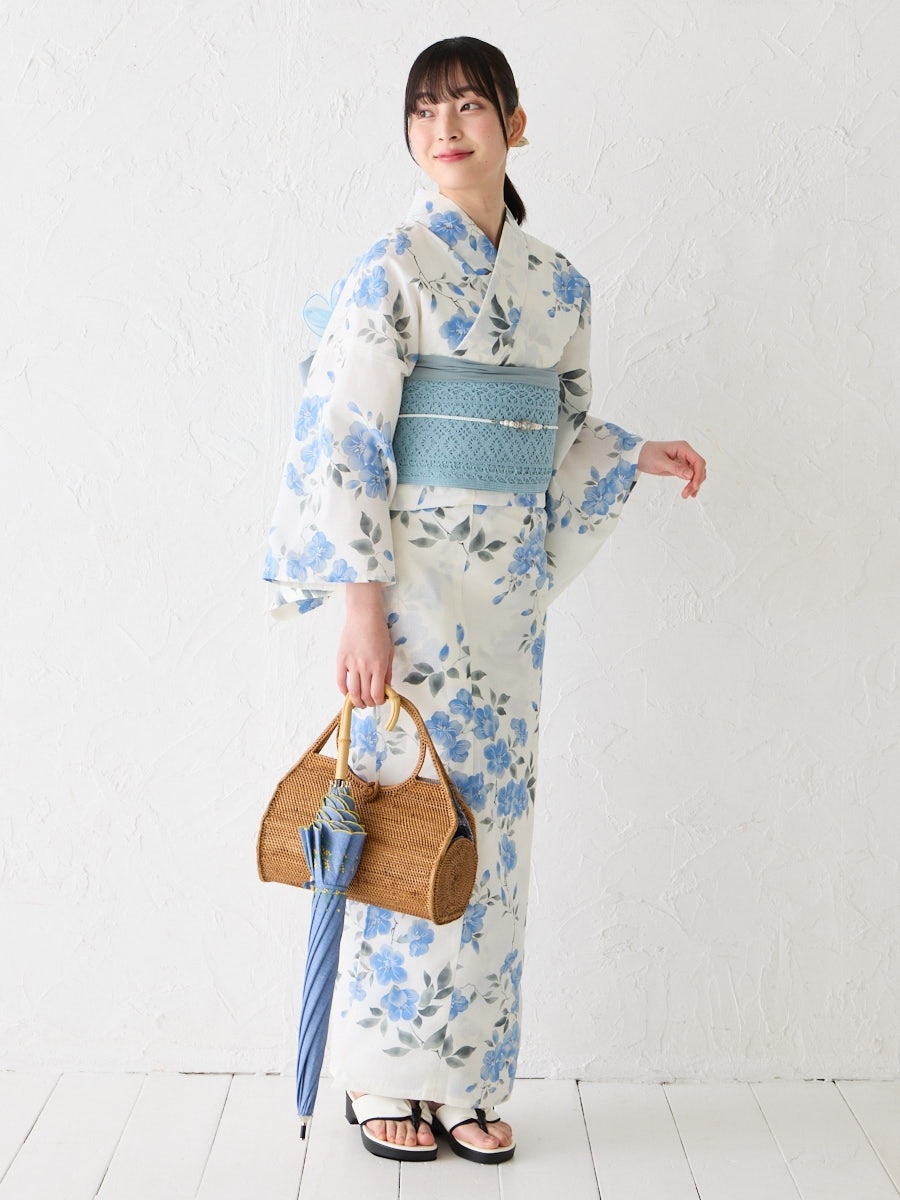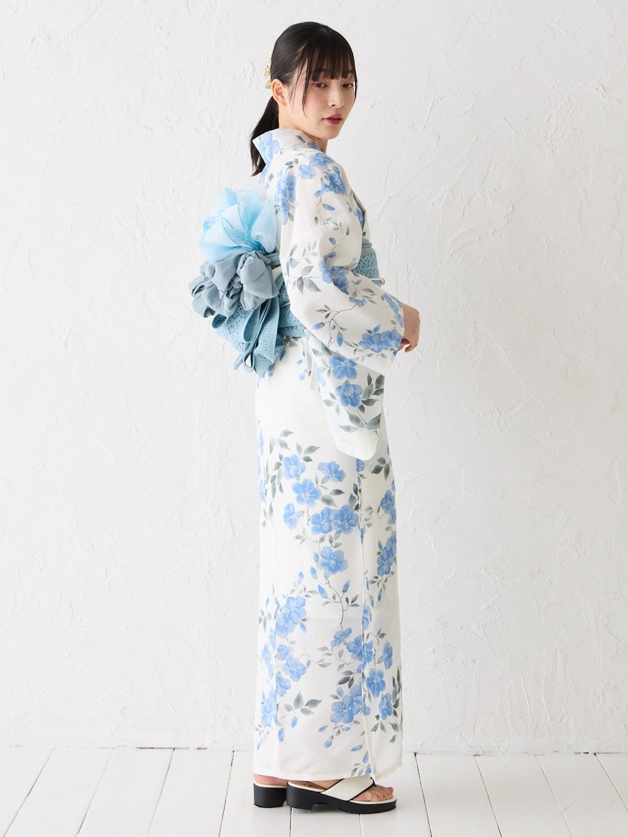 白地にニュアンスカラーの水色の花をあしらった「かずら」は、清涼感あふれる涼やかな印象と、どこか愛らしい可憐さを演出してくれる一枚です。