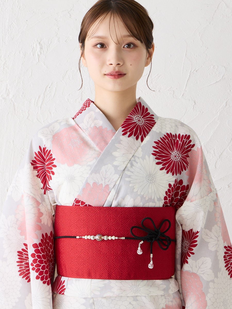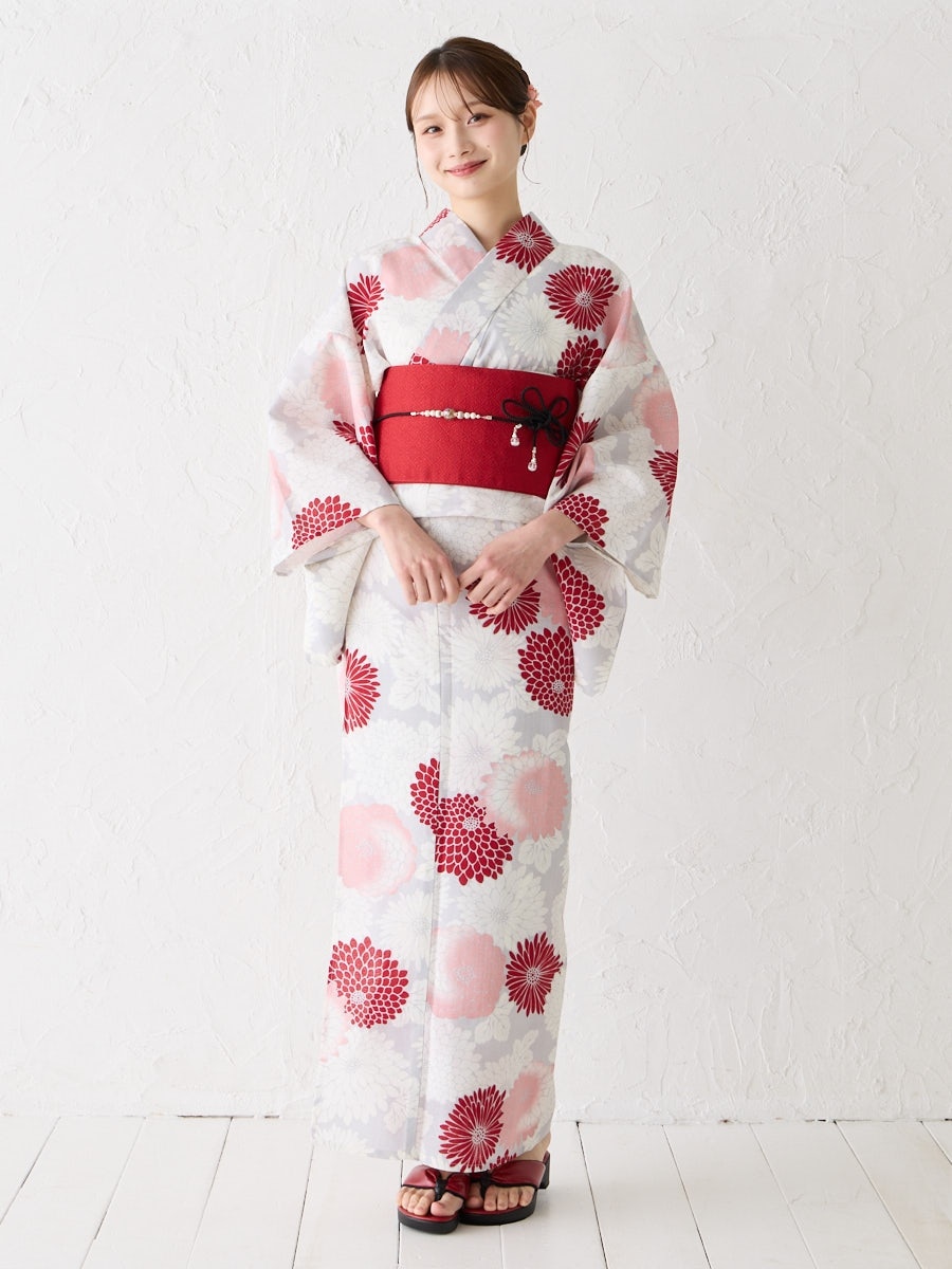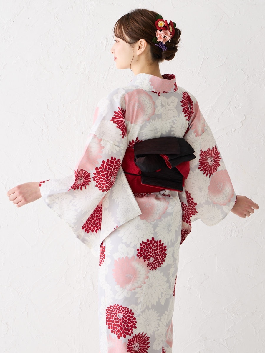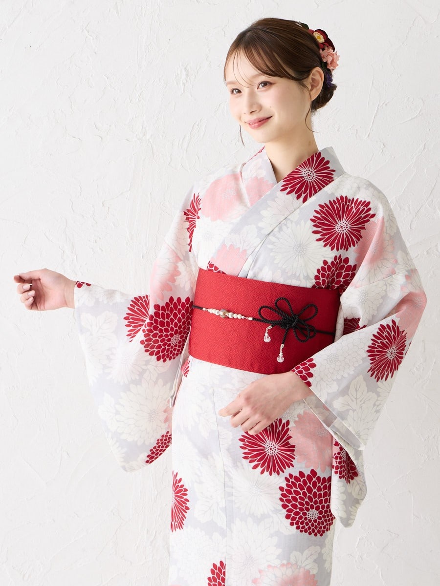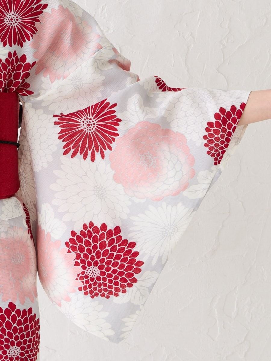 薄いグレー地に赤のグラデーションで菊をあしらった「菊づくし」は、帯の色次第で可愛らしくも大人っぽくもアレンジ可能。