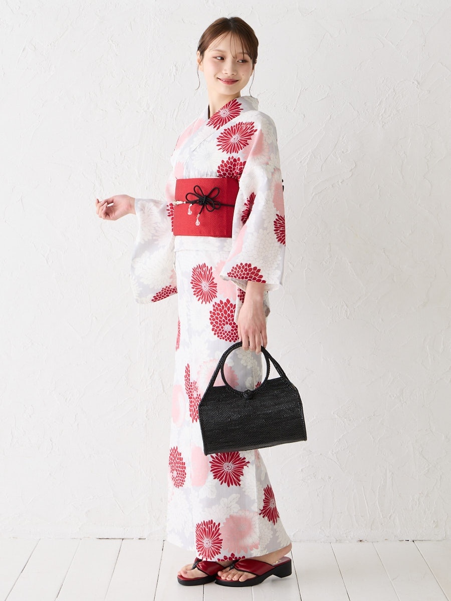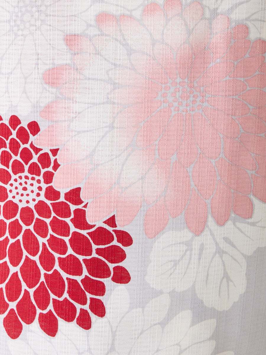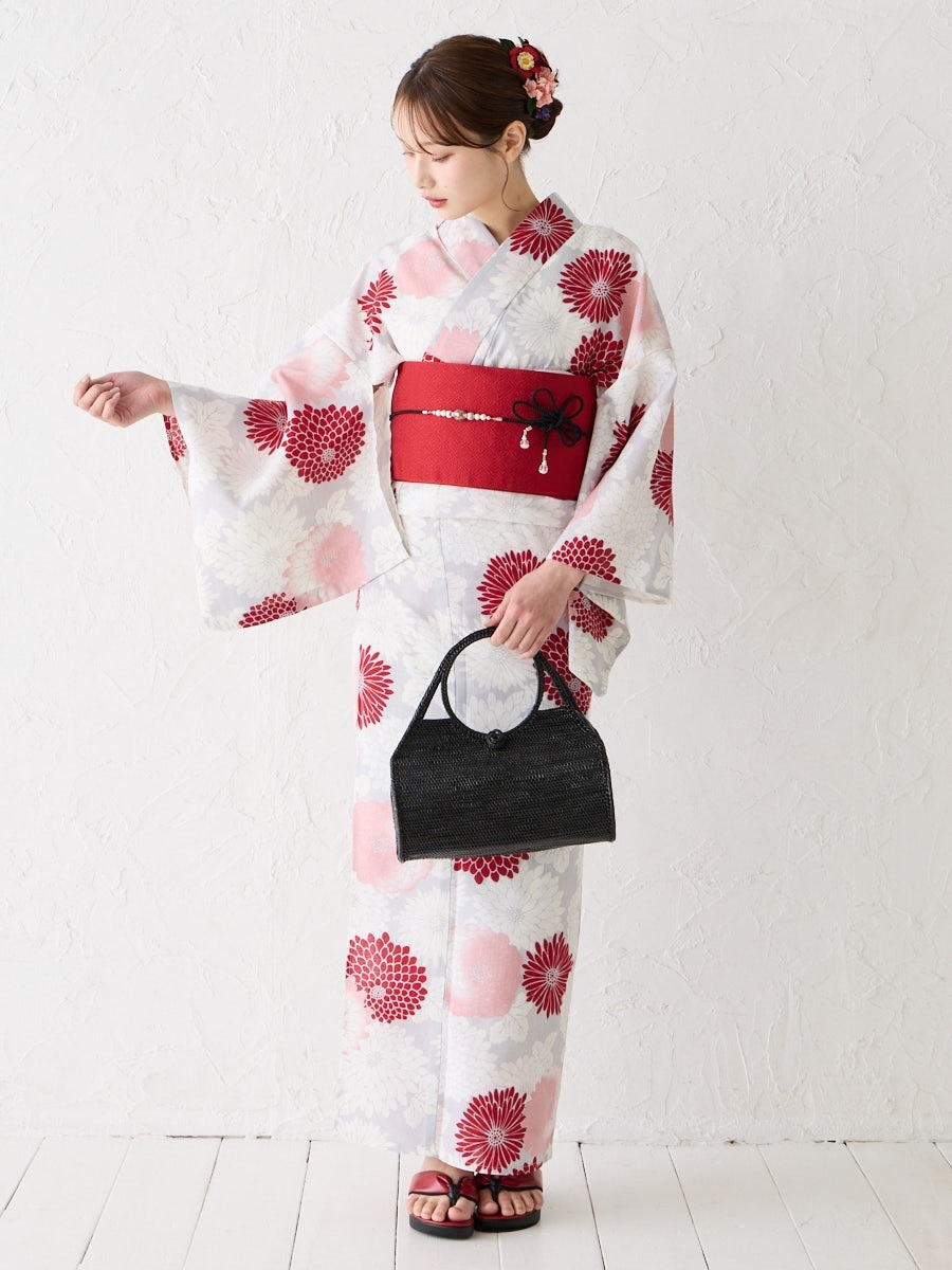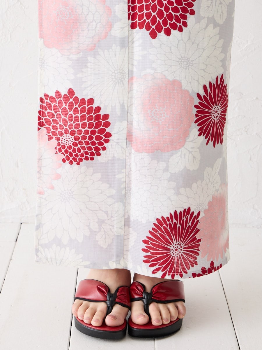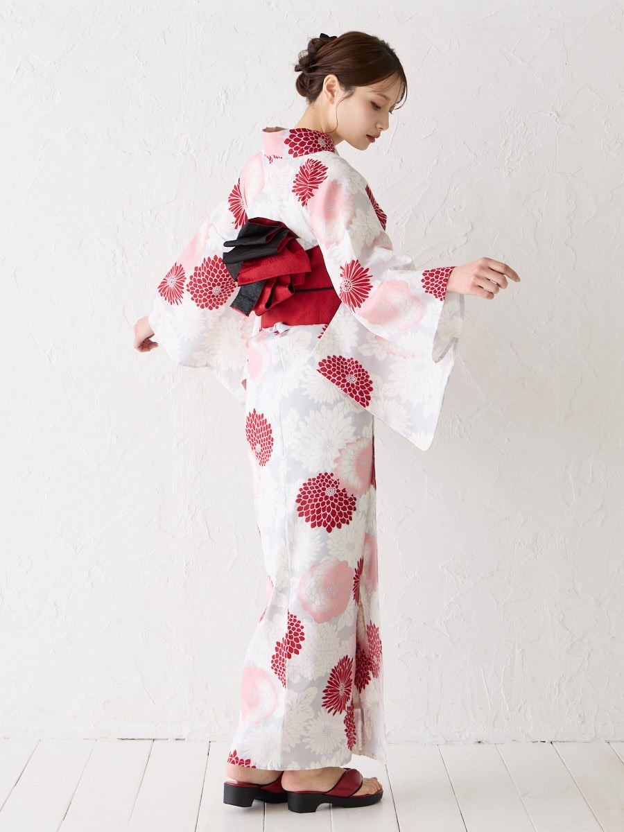 薄いグレー地に赤のグラデーションで菊をあしらった「菊づくし」は、帯の色次第で可愛らしくも大人っぽくもアレンジ可能。