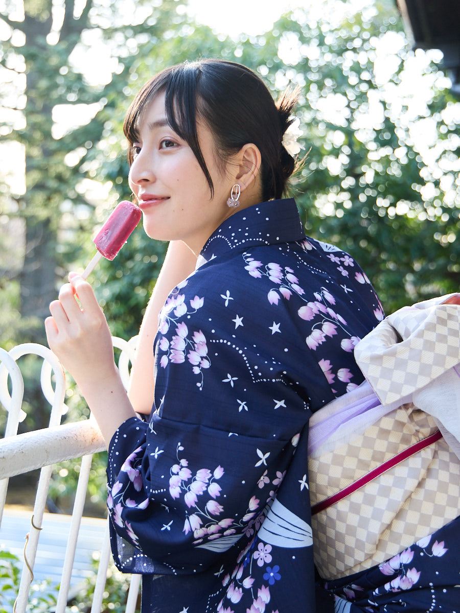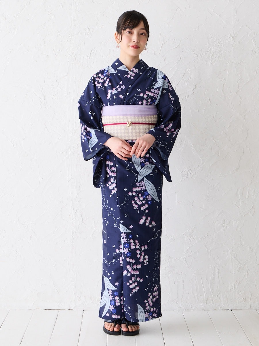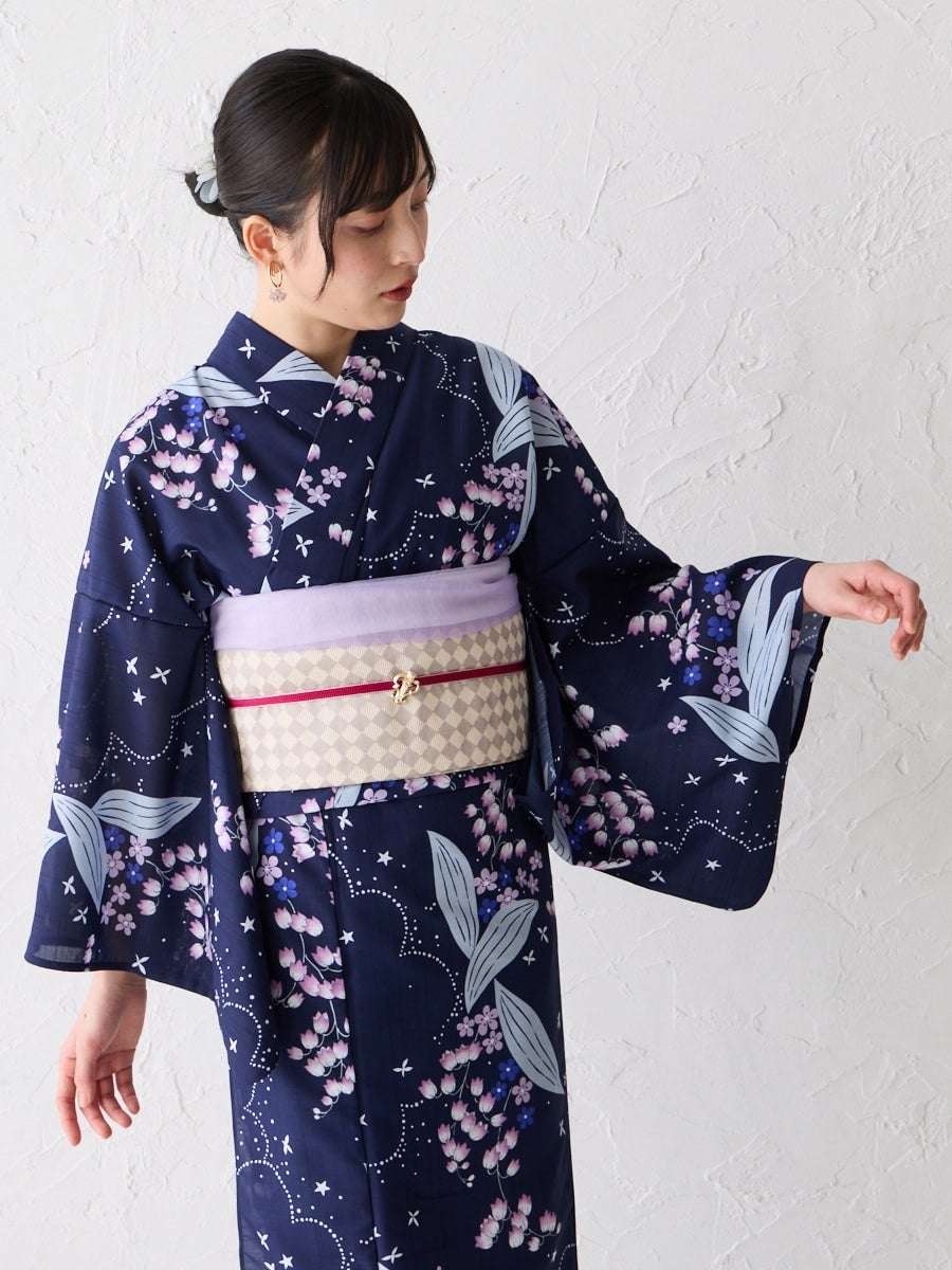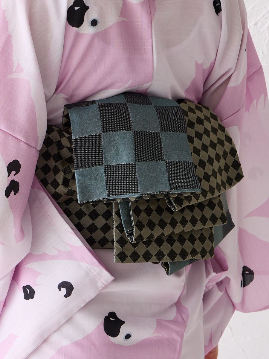 その日の気分やスタイリングに合わせて、くるりと表情を変えられるのも魅力。浴衣にはもちろん、小紋やカジュアル着物にも幅広く合わせて楽しめます。