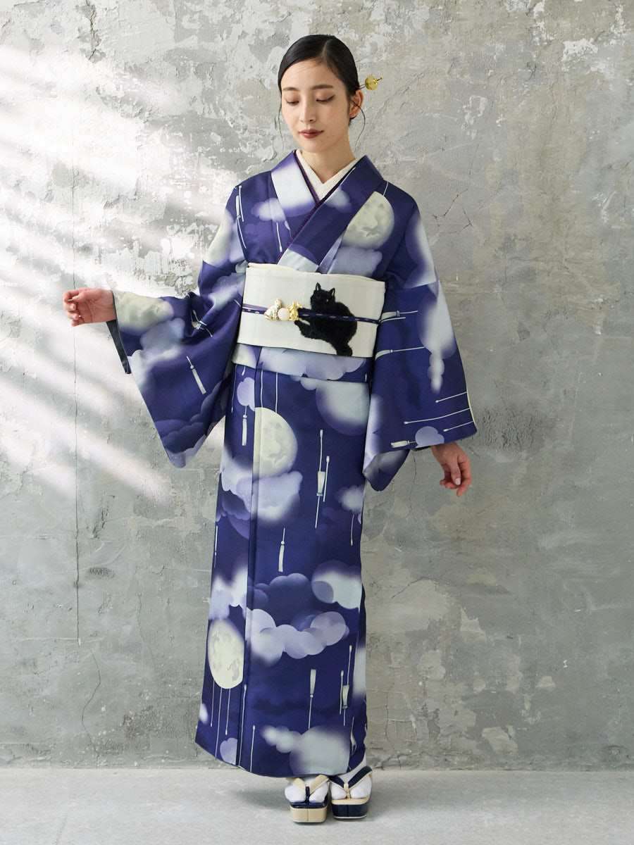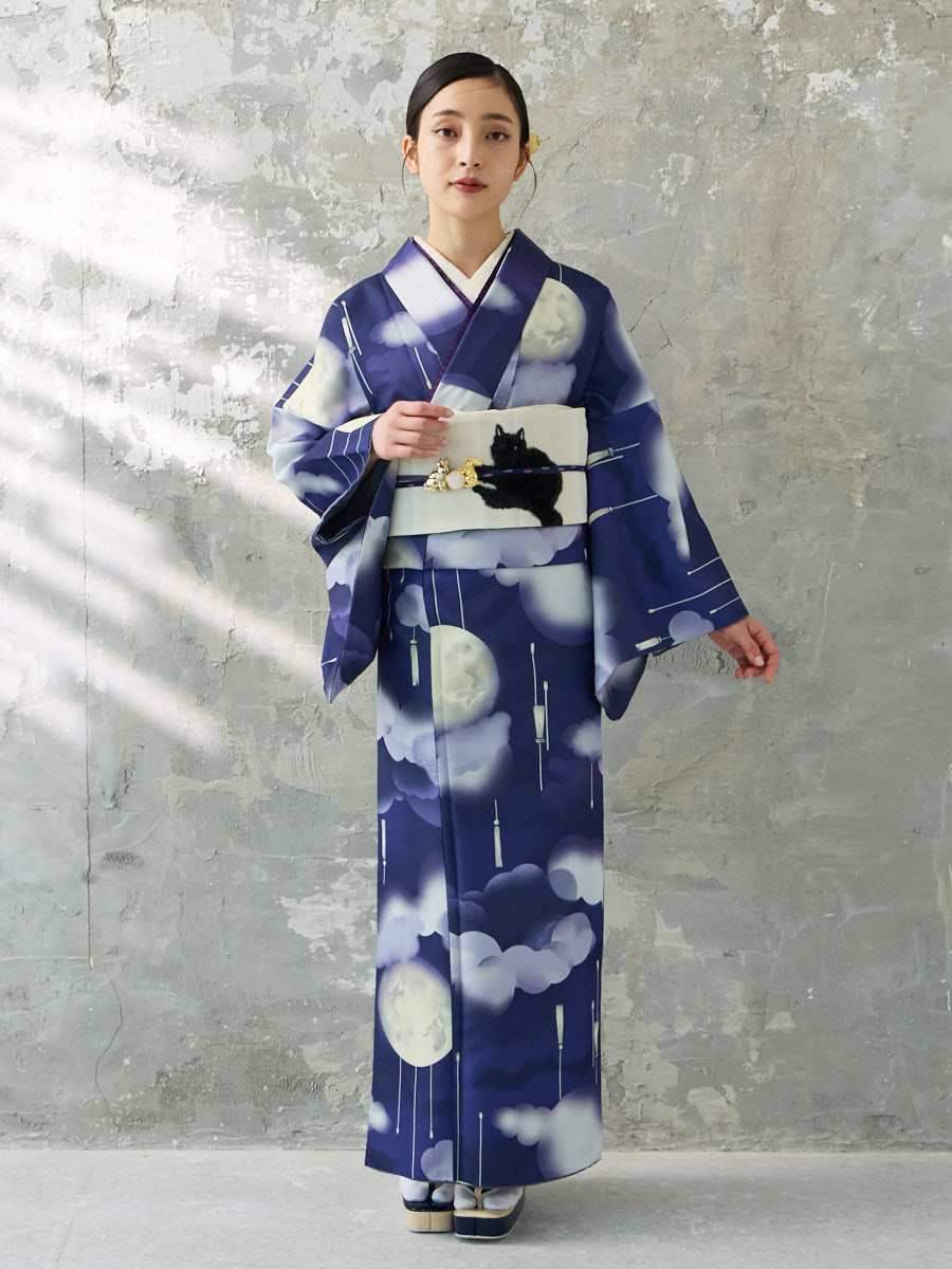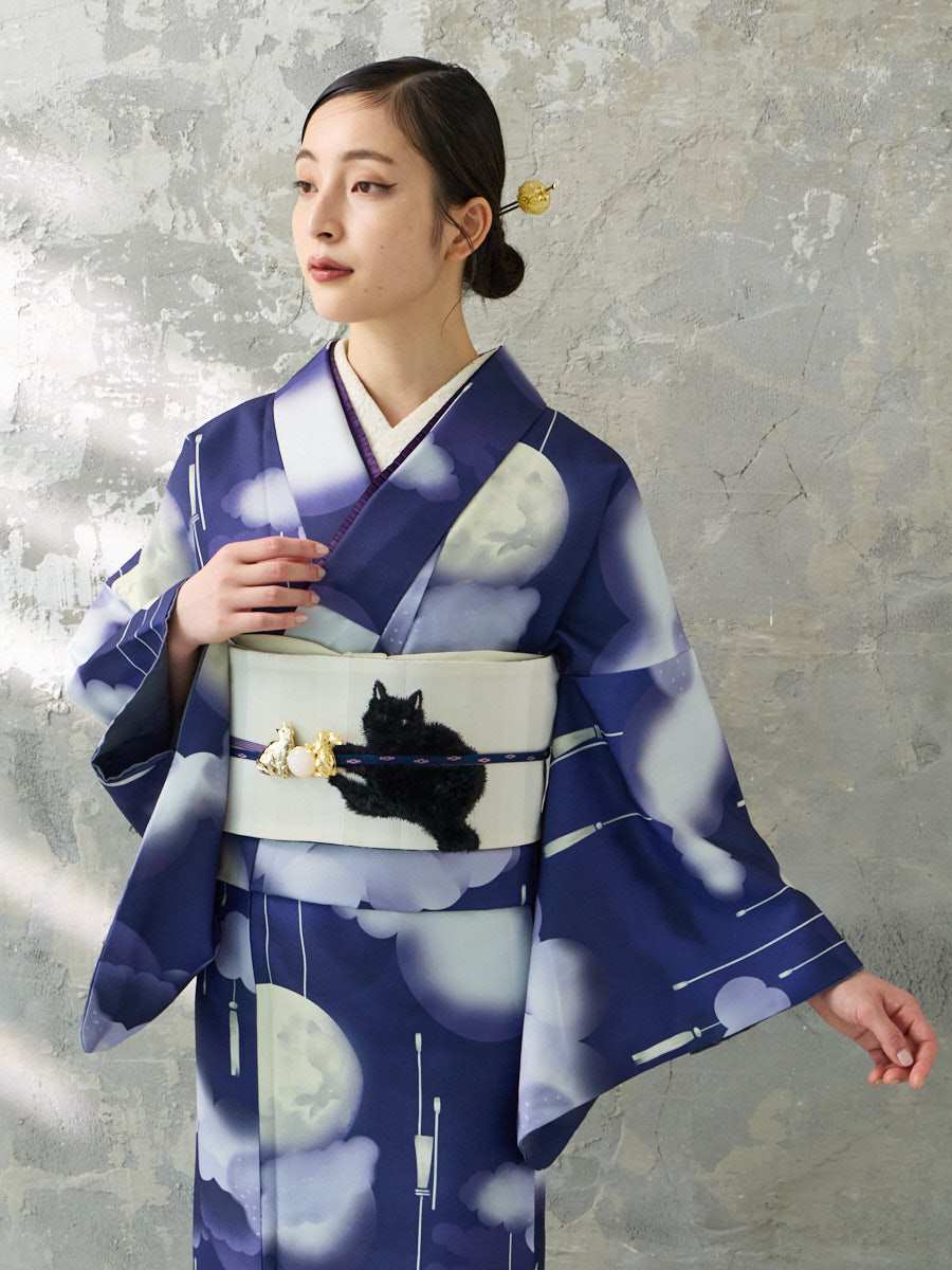 また、スタイリングアイテムとしてデザインされた帯留「見上げ猫」・「月見うさぎ」を合わせると、「お月見雲」のストーリーが完成します。