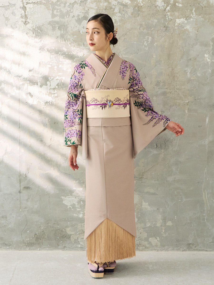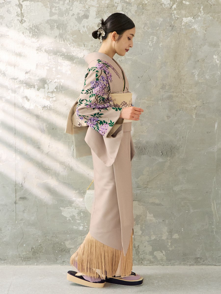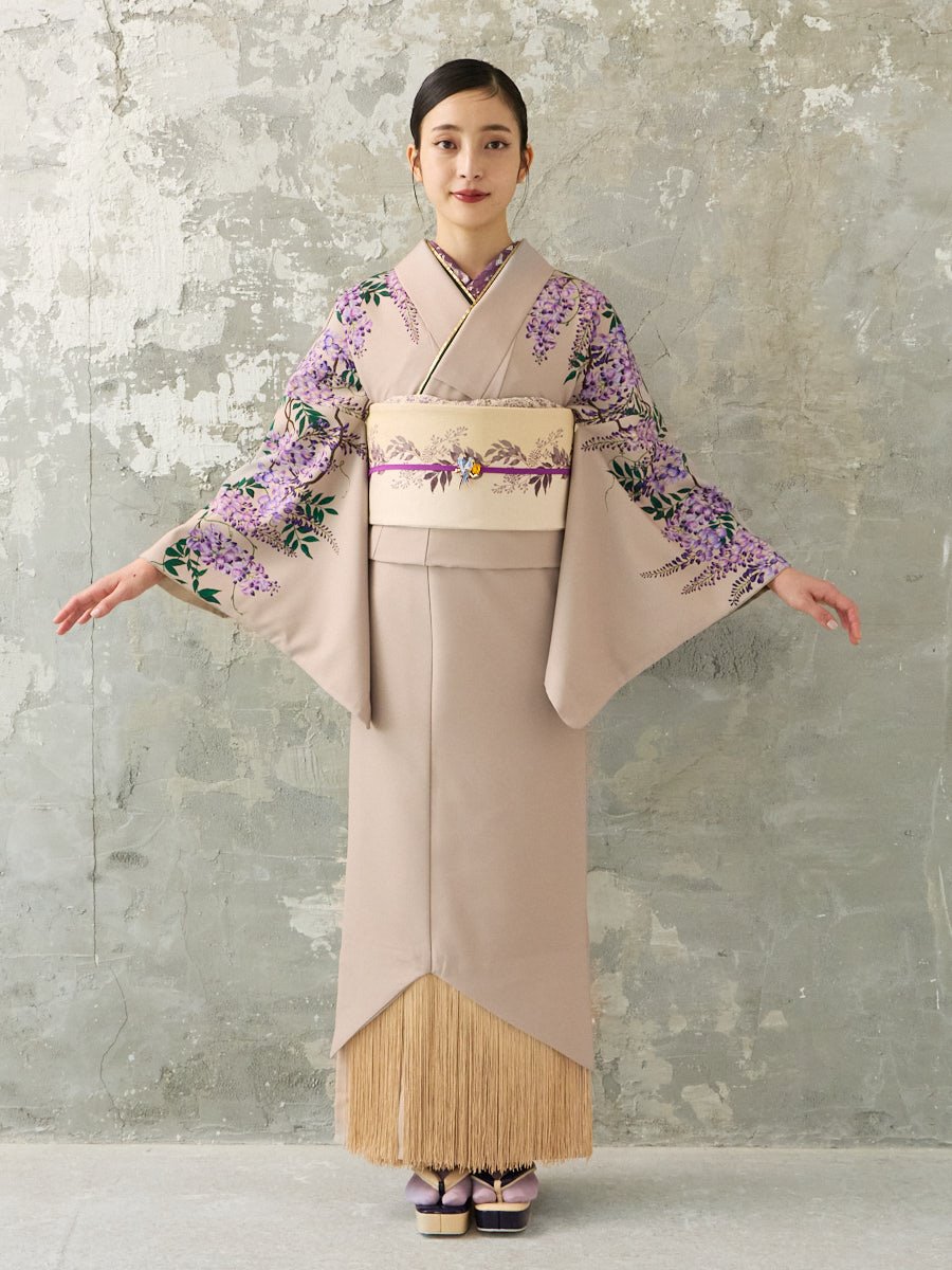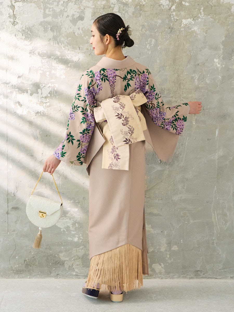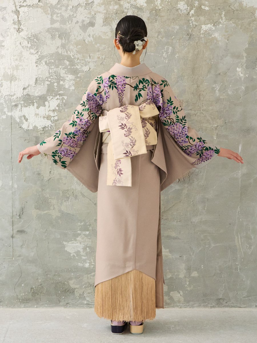 優美な藤の花をあしらった気品ある着物に、裾へ軽やかなフリンジを添えました。