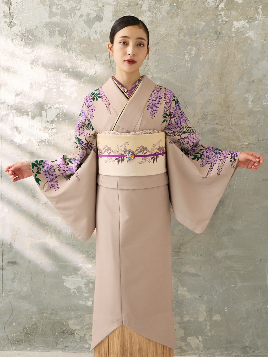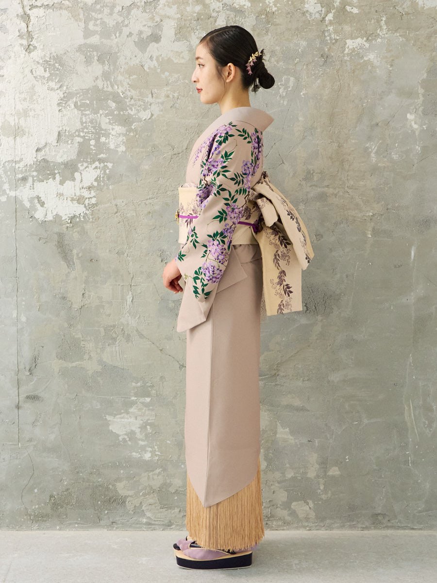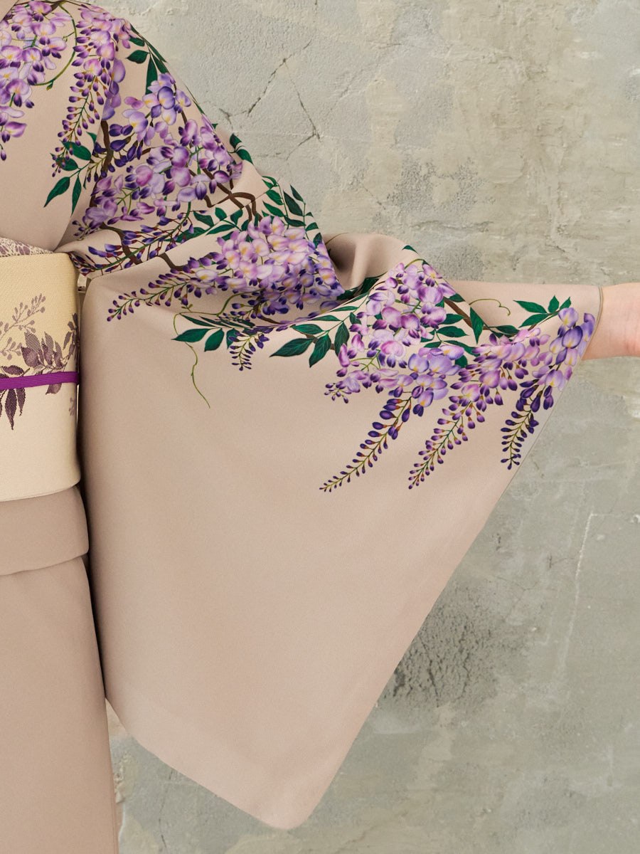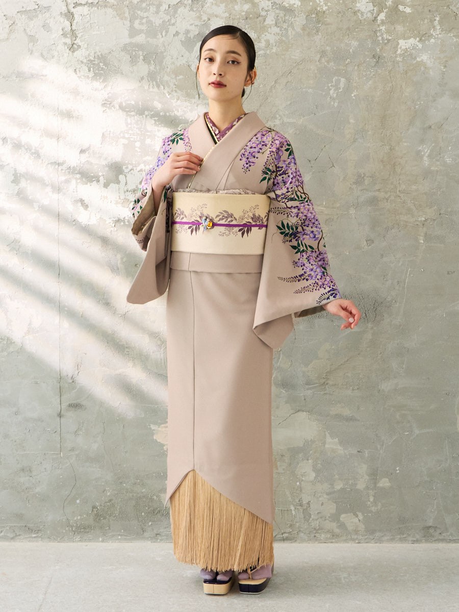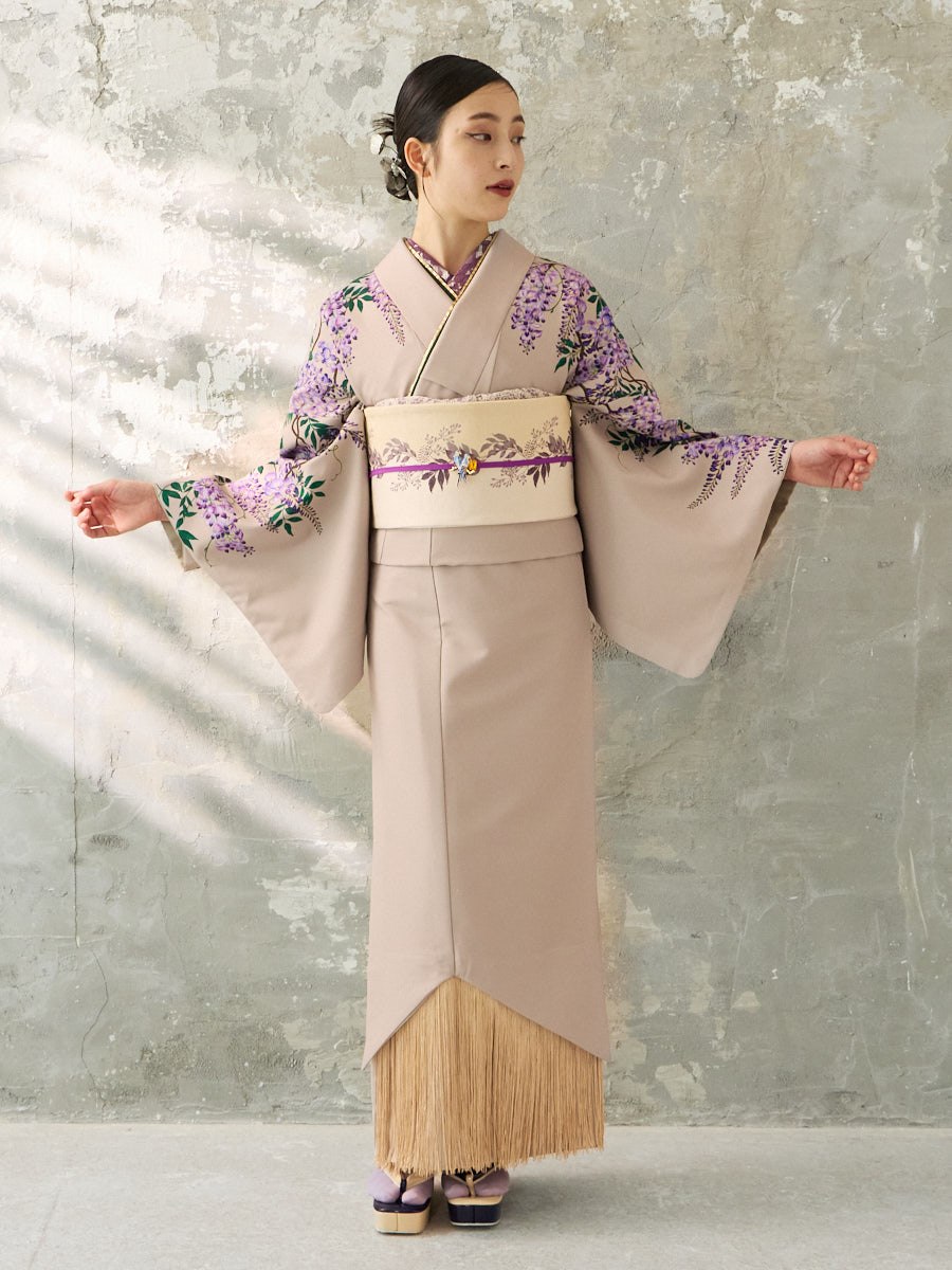 優美な藤の花をあしらった気品ある着物に、裾へ軽やかなフリンジを添えました。