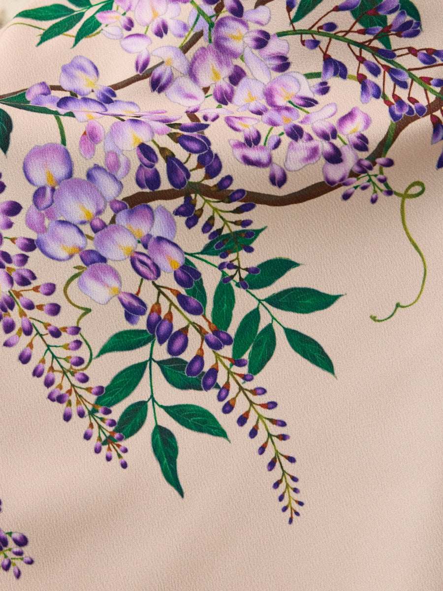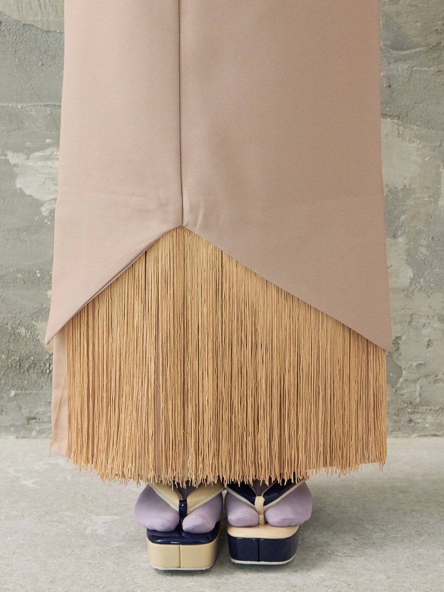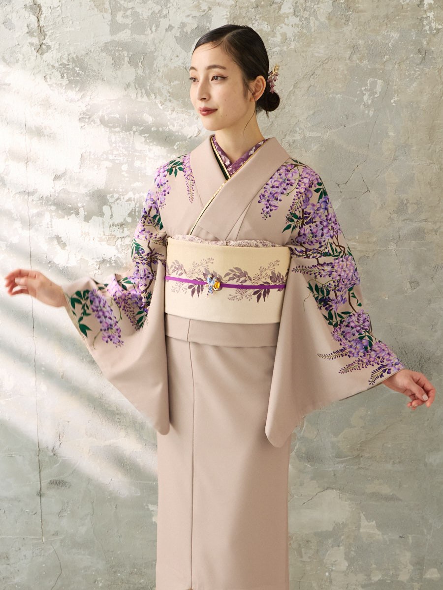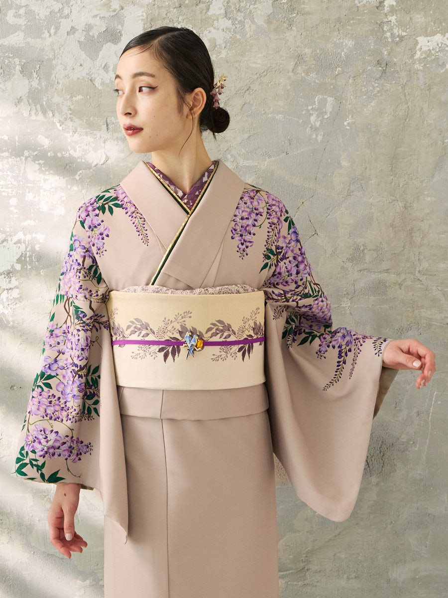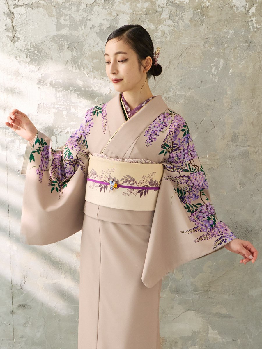 優美な藤の花をあしらった気品ある着物に、裾へ軽やかなフリンジを添えました。
