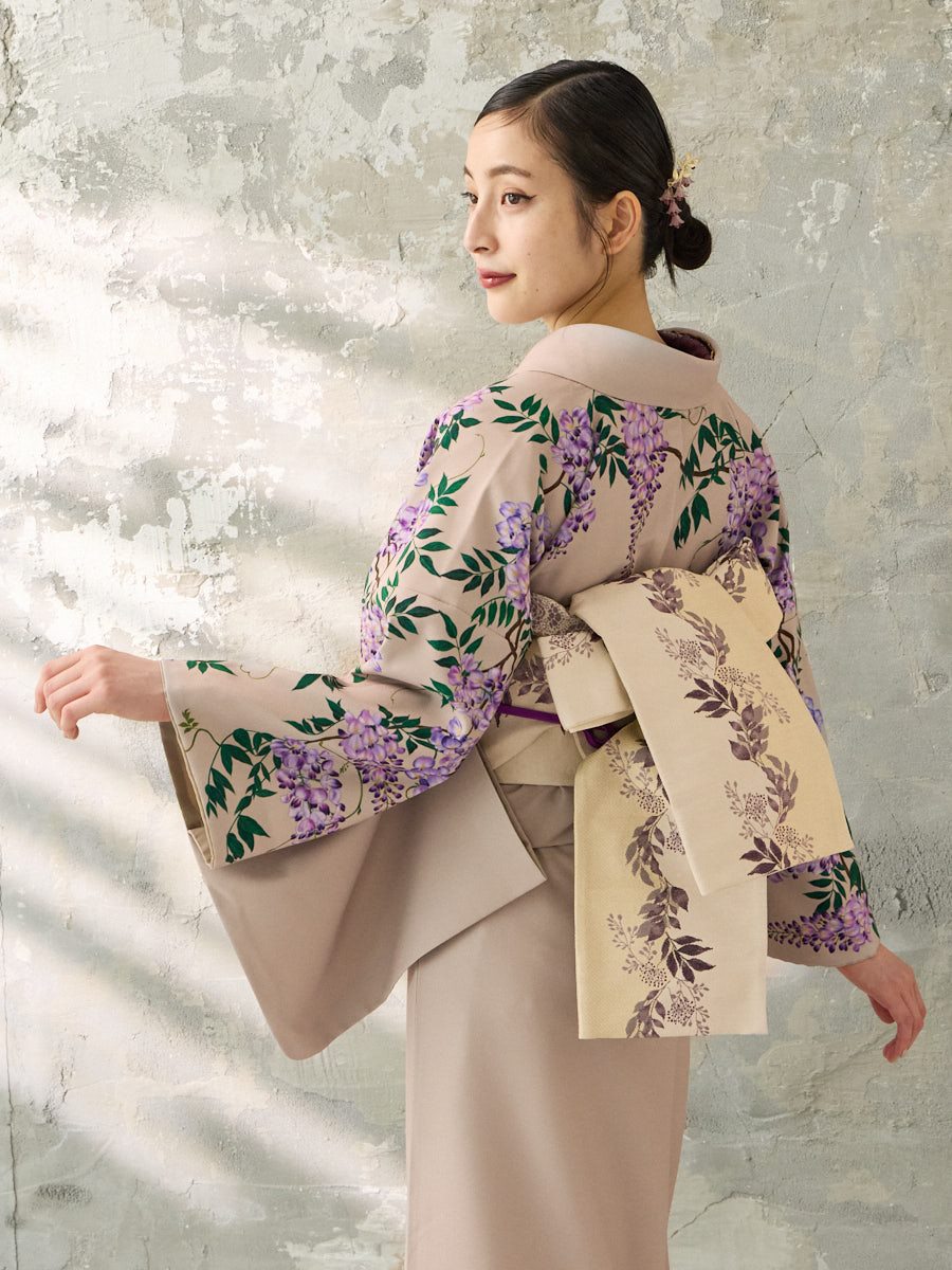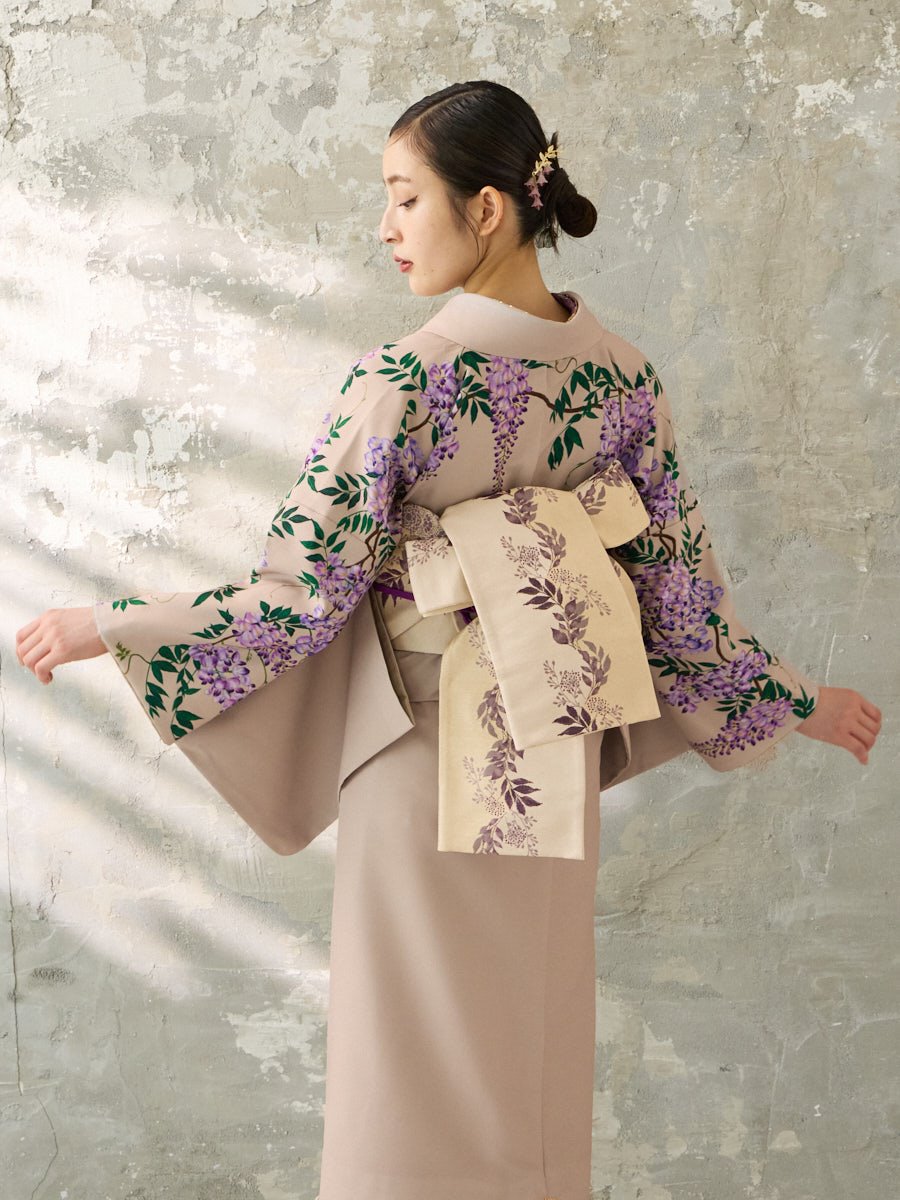 古来より愛される藤の柄は、流れるような曲線で上品さを引き立て、着る人のたおやかな佇まいを演出します。