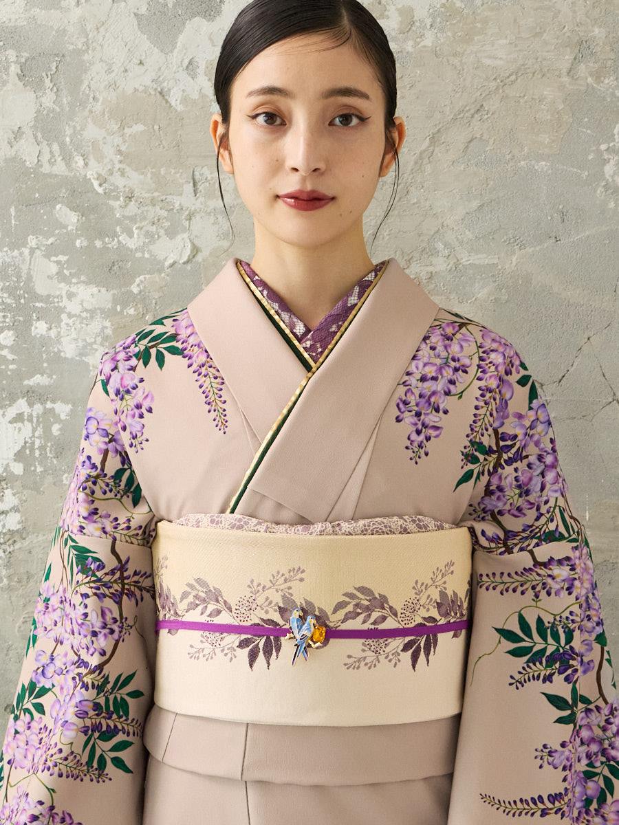 また、スタイリングアイテムとしてデザインされた半巾帯「リーフ」を合わせると、「藤フリンジ」のストーリーが完成します。