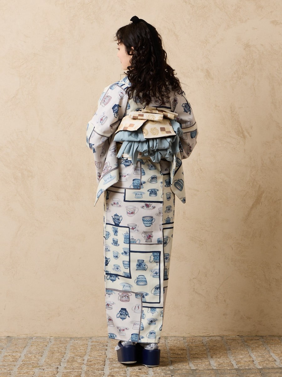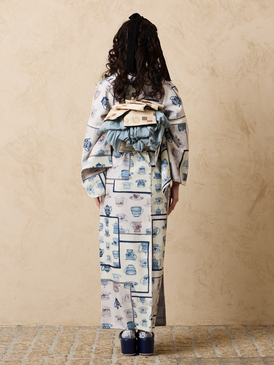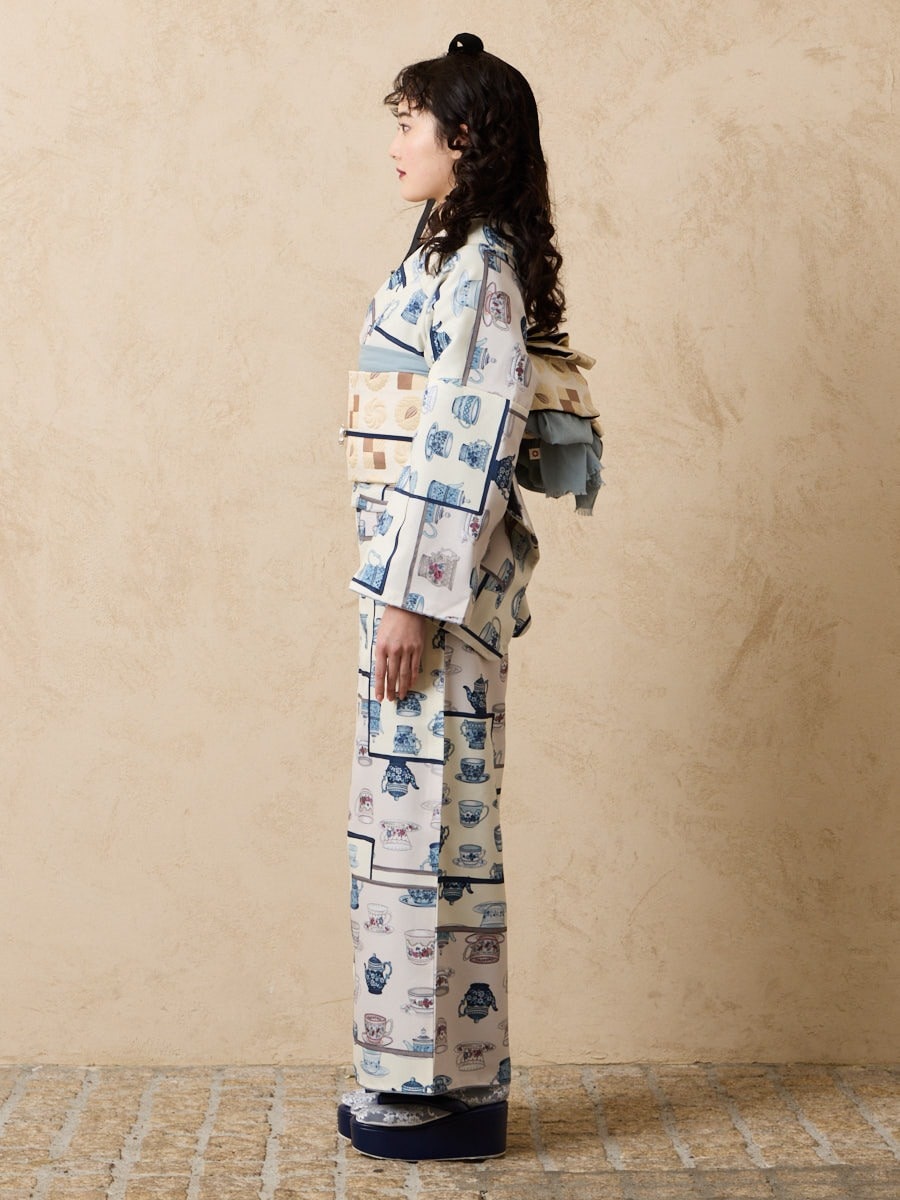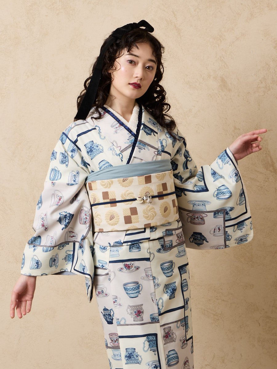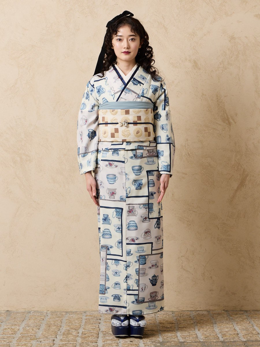 一見、市松取りの整った柄行きの中に、アンティークカップのモチーフが散りばめられた、上品で遊び心のあるデザイン。