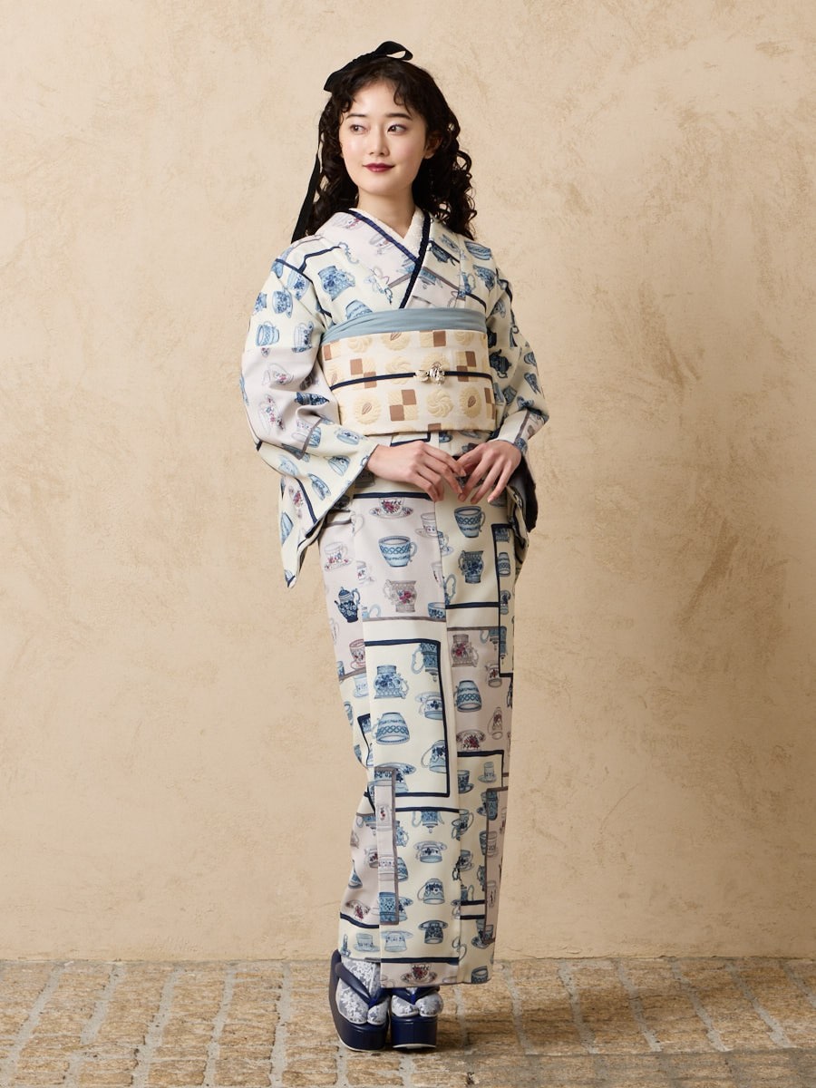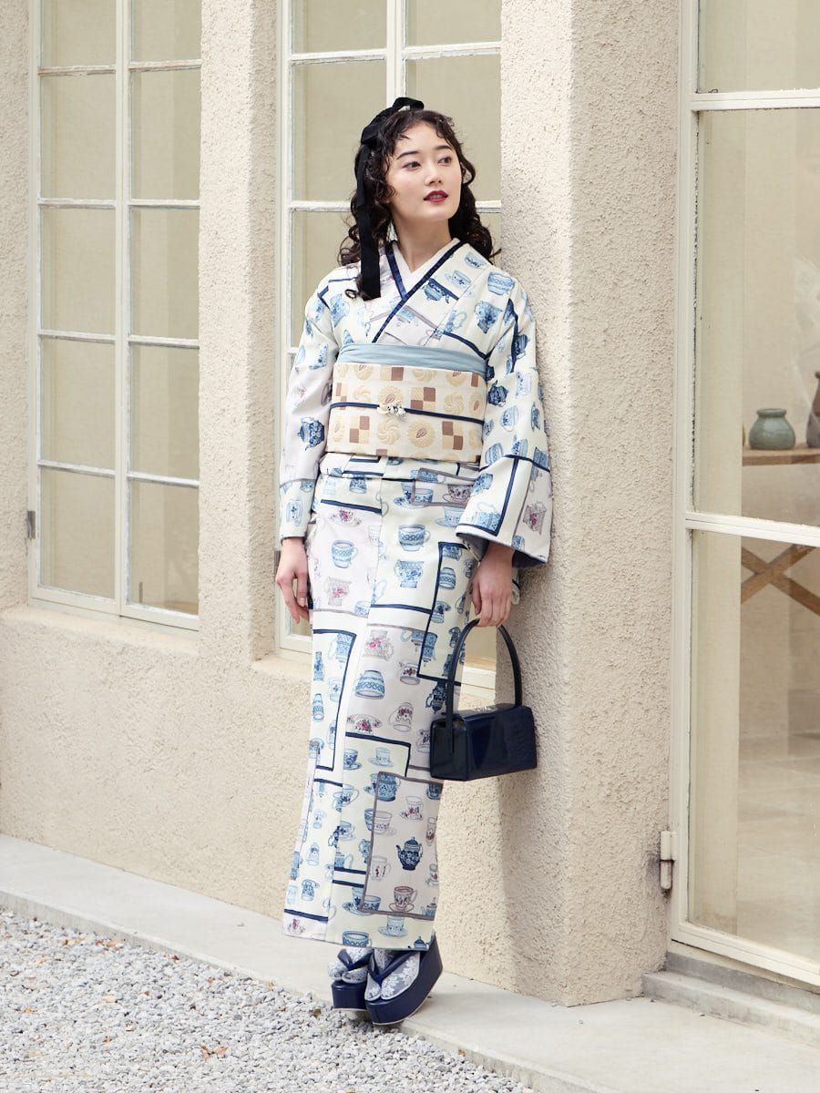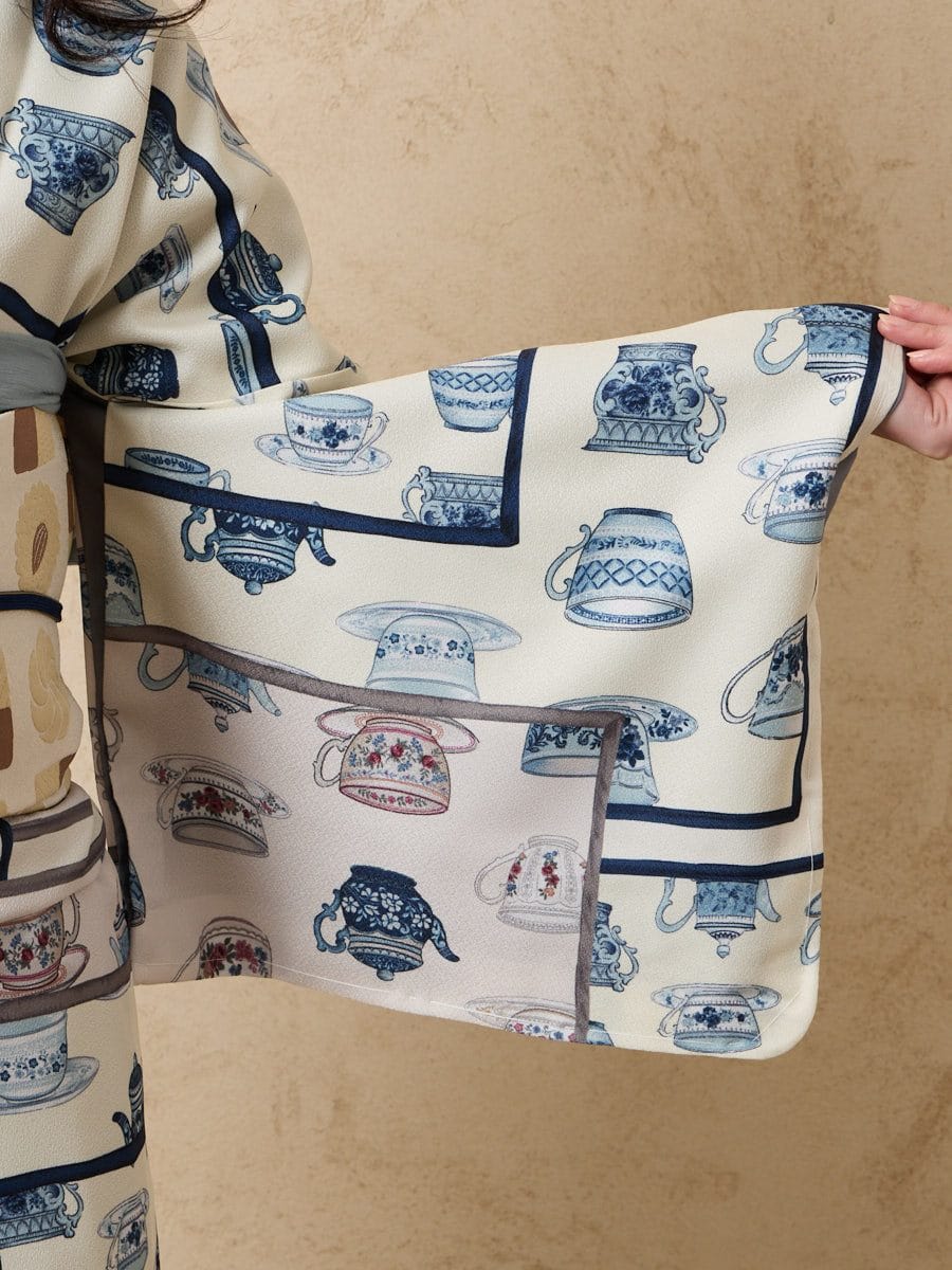 実際に袖を通すと、市松の規則性がすっきりと見える印象をつくり、カップの細やかな線描きが視線をやさしく誘うため、上品で知的な雰囲気を自然とまとえます。