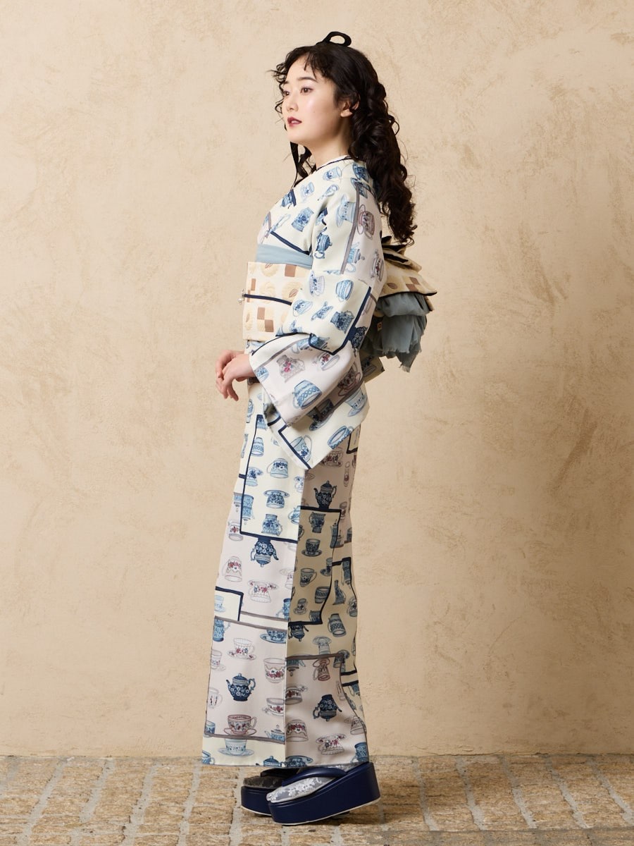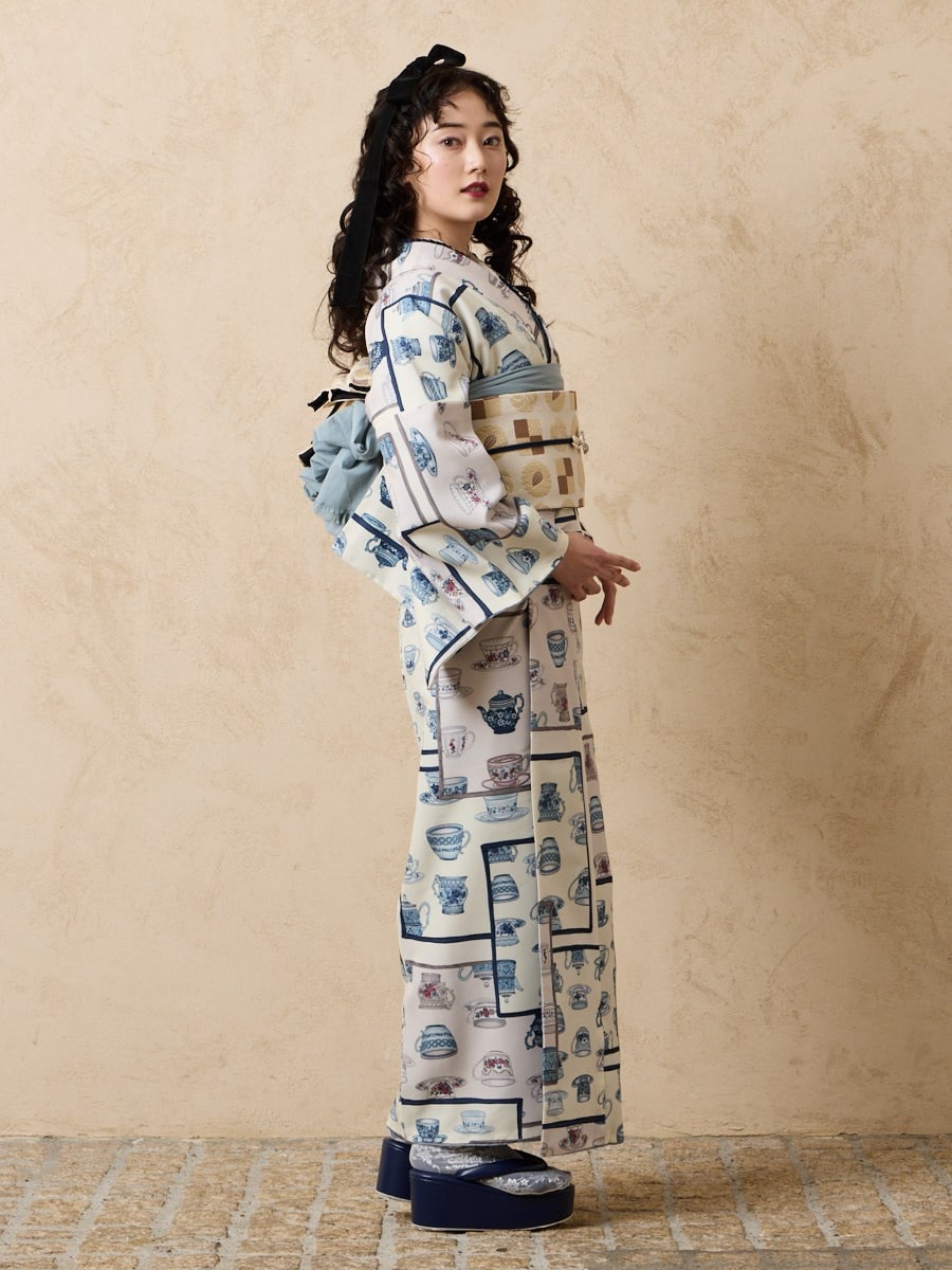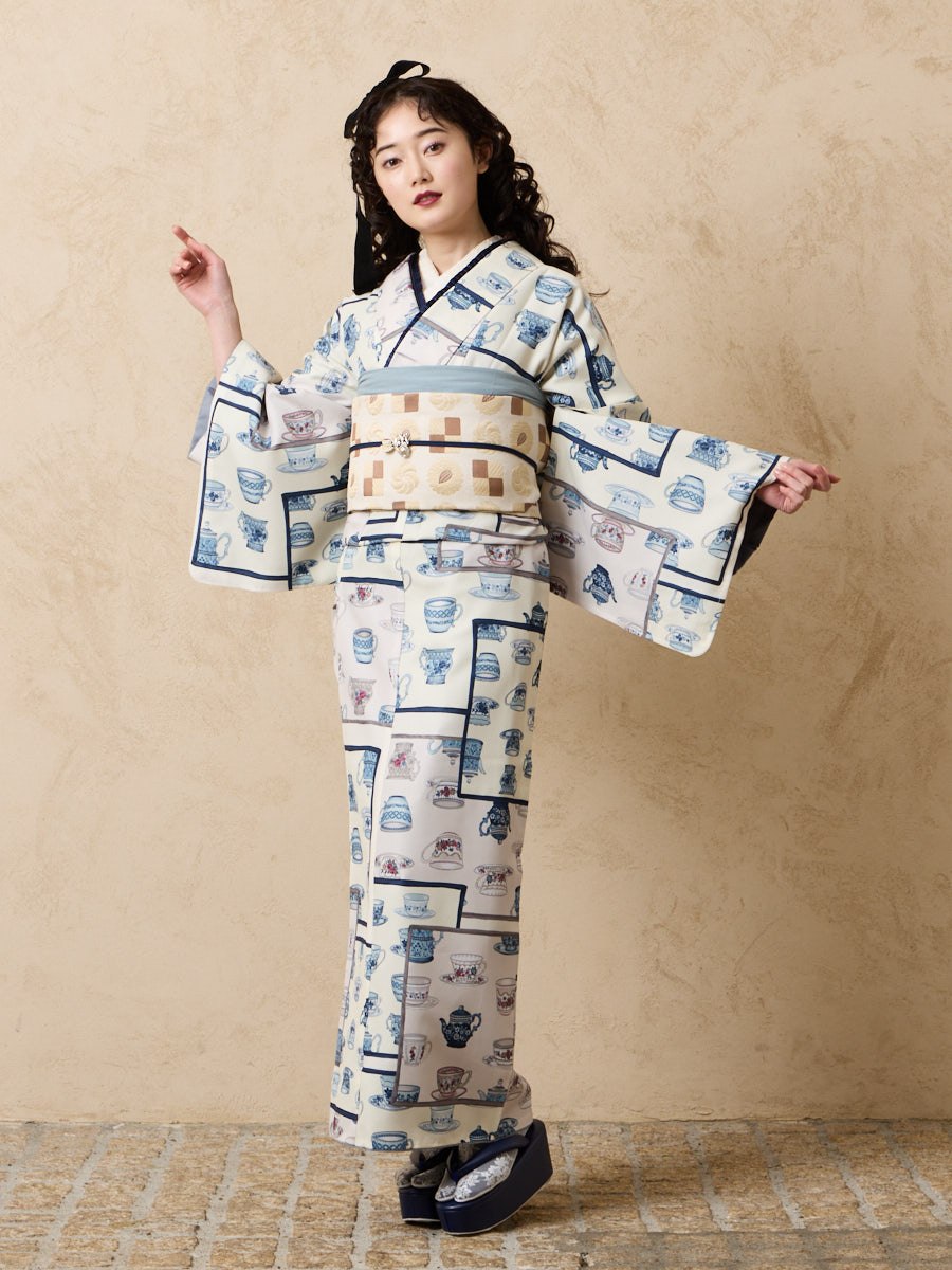 実際に袖を通すと、市松の規則性がすっきりと見える印象をつくり、カップの細やかな線描きが視線をやさしく誘うため、上品で知的な雰囲気を自然とまとえます。