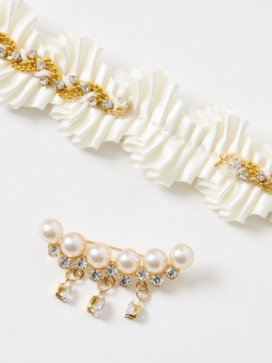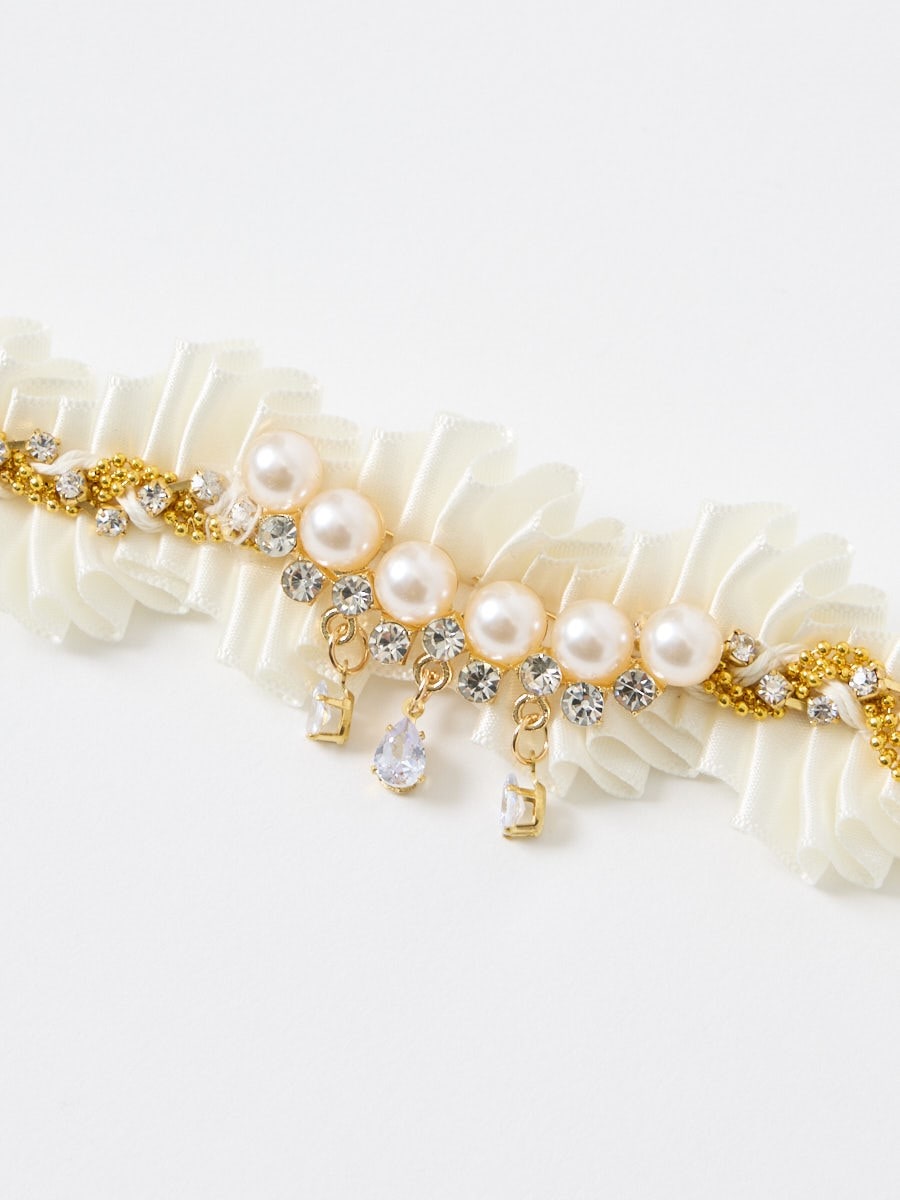 パール、ストーン、チェーン、プリーツ使いがかわいい帯締めです。