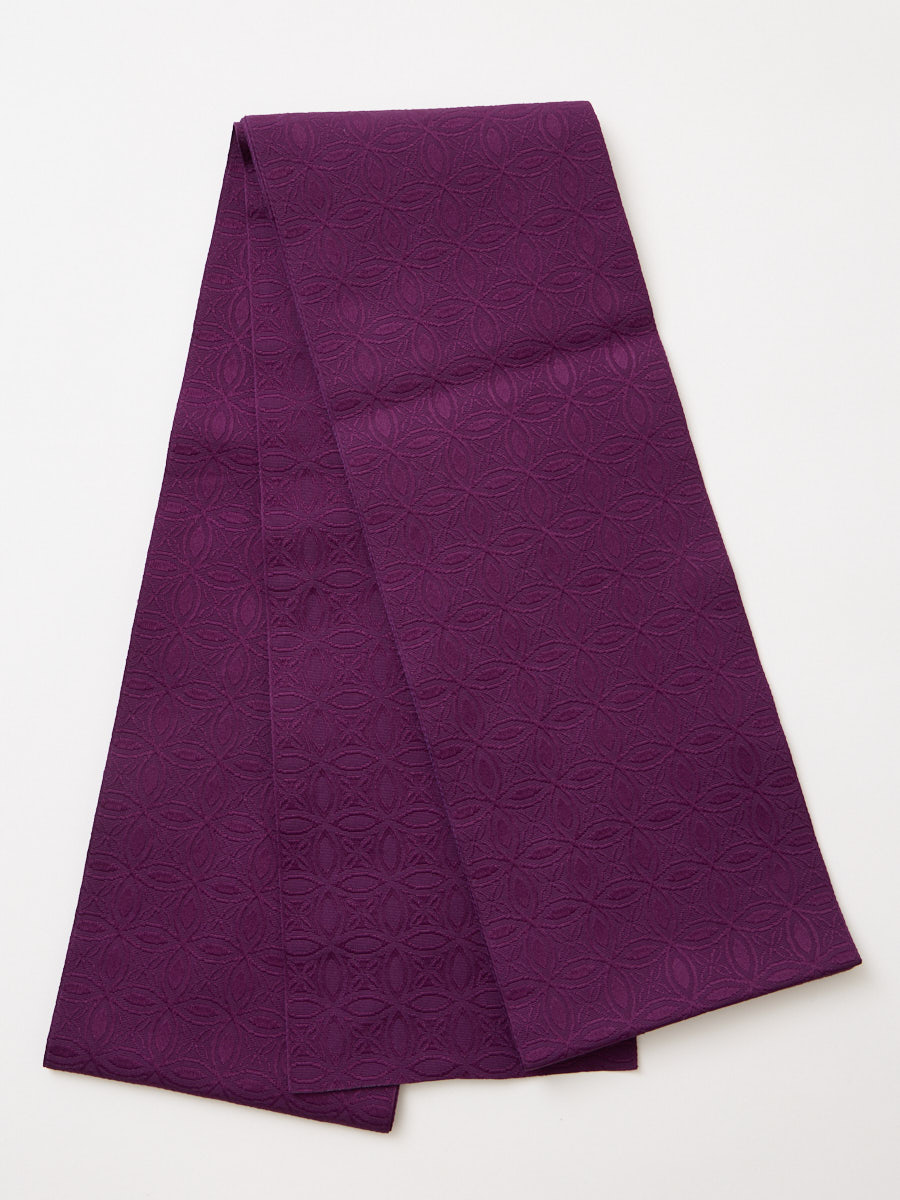かわいらしさと大人っぽさを兼ね備えた花七宝柄の地紋の帯。