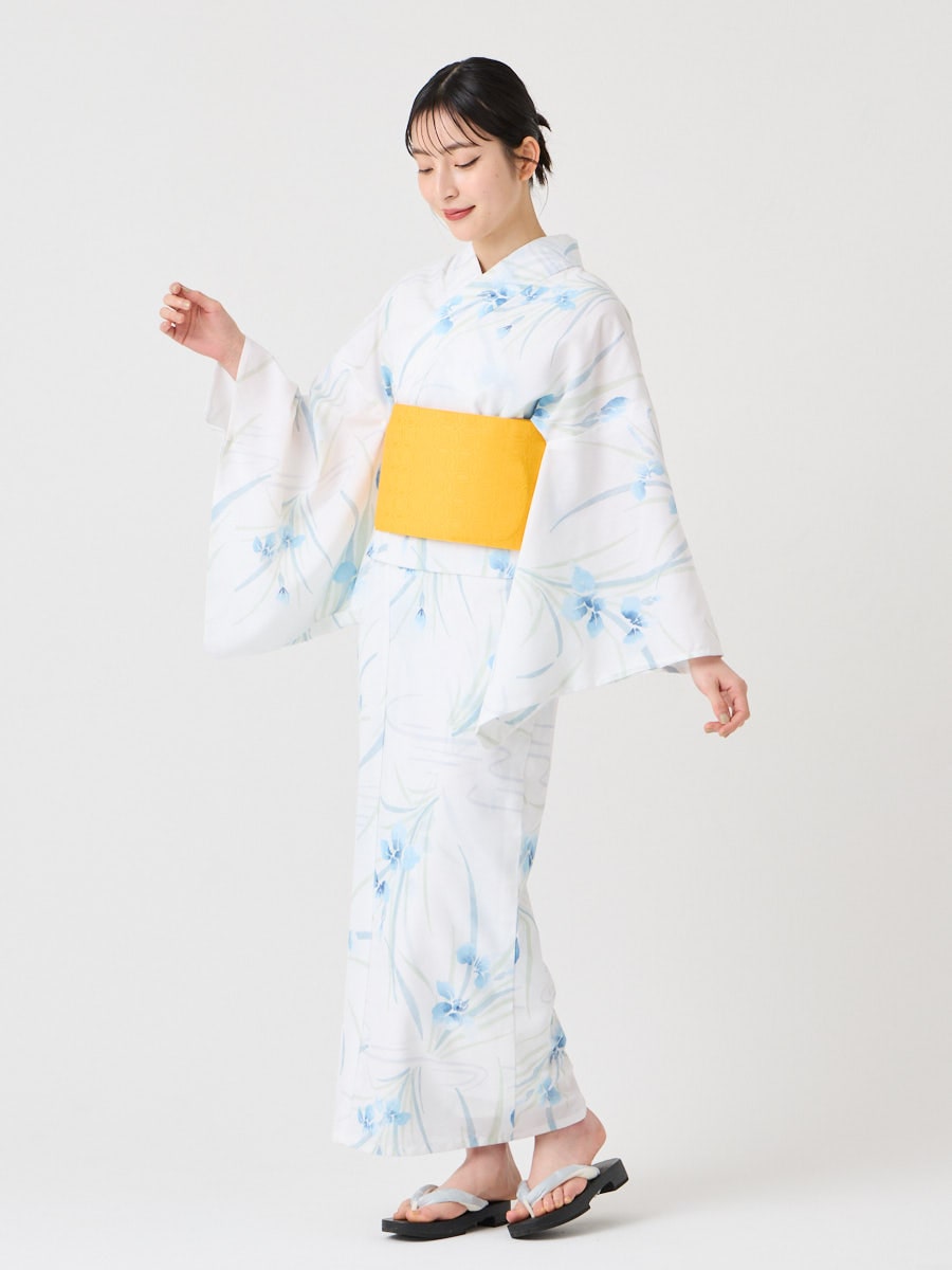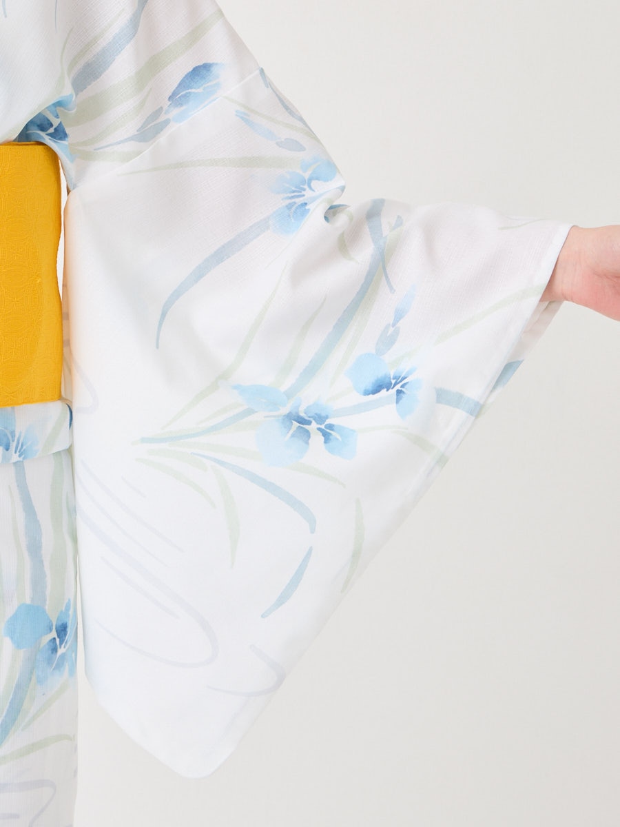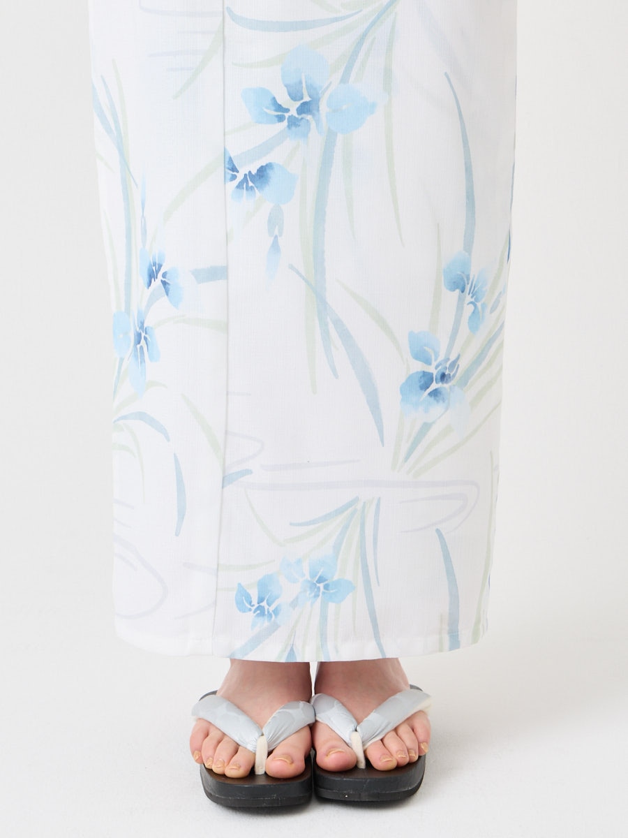 白地にすらりと伸びるあやめの花をデザイン、縦に流れるデザインでスタイルアップ効果も。
