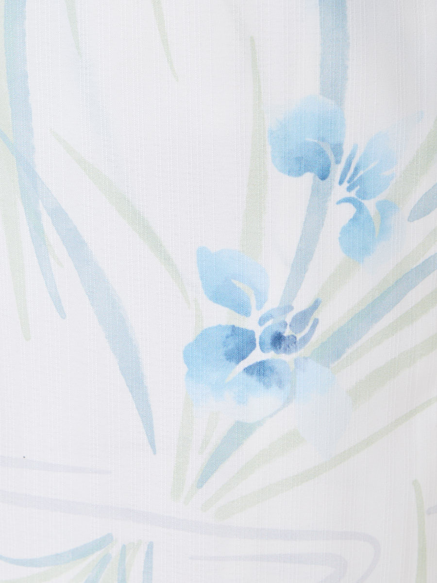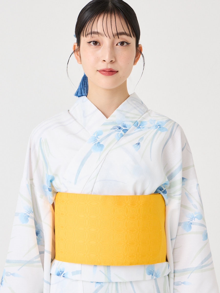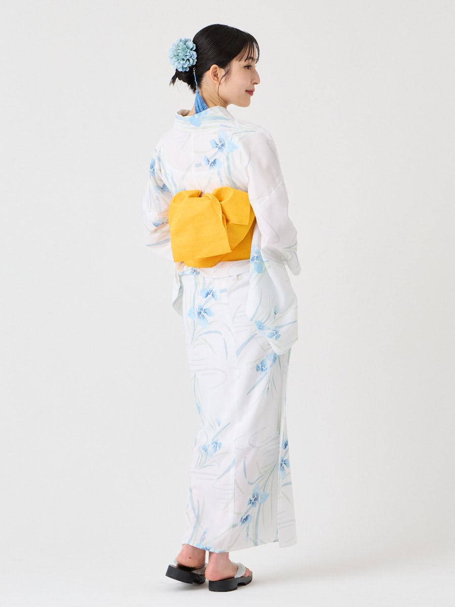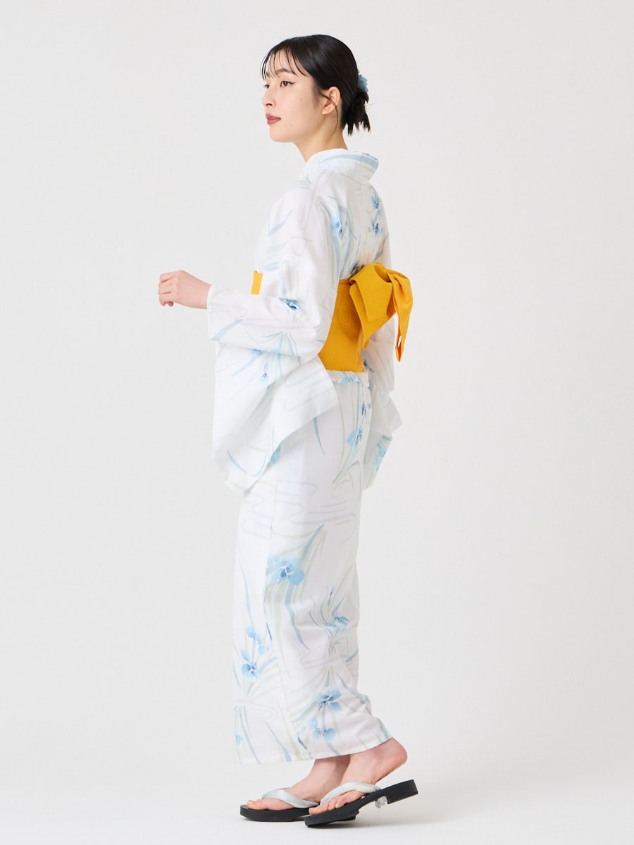 白地にすらりと伸びるあやめの花をデザイン、縦に流れるデザインでスタイルアップ効果も。
