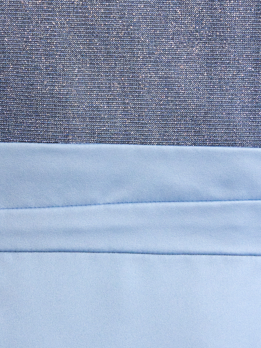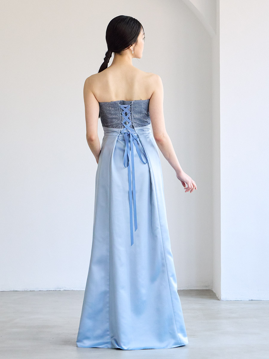 身頃は角度によって色の見え方に変化のあるラメニット、スカートは光沢のあるサテンを使用したスレンダードレス。