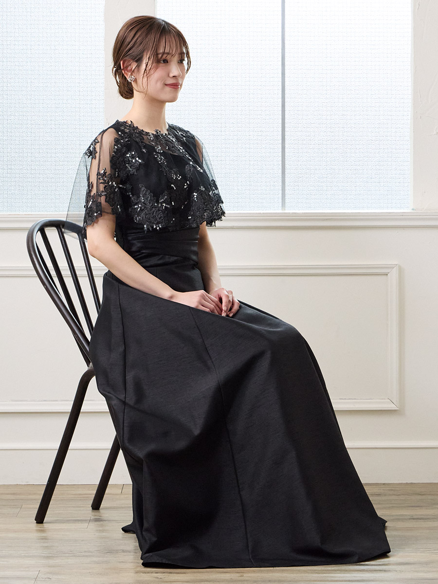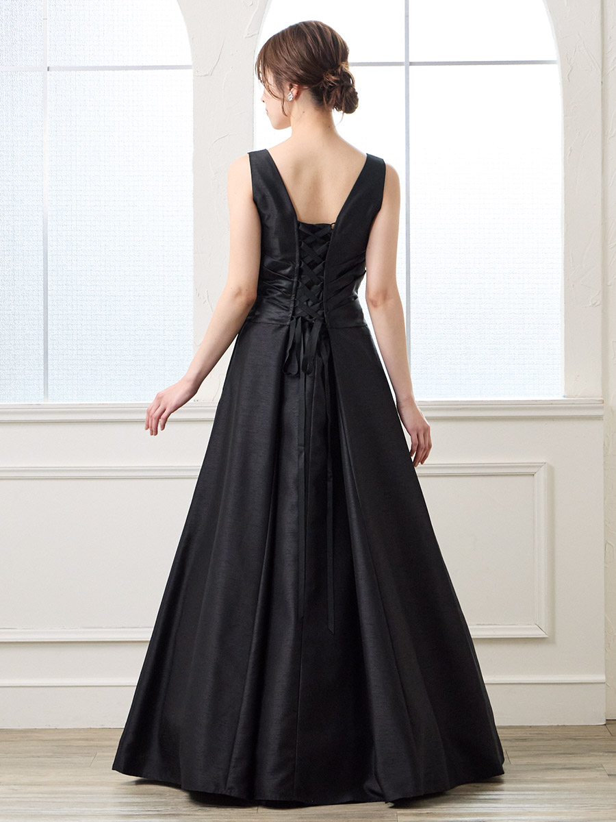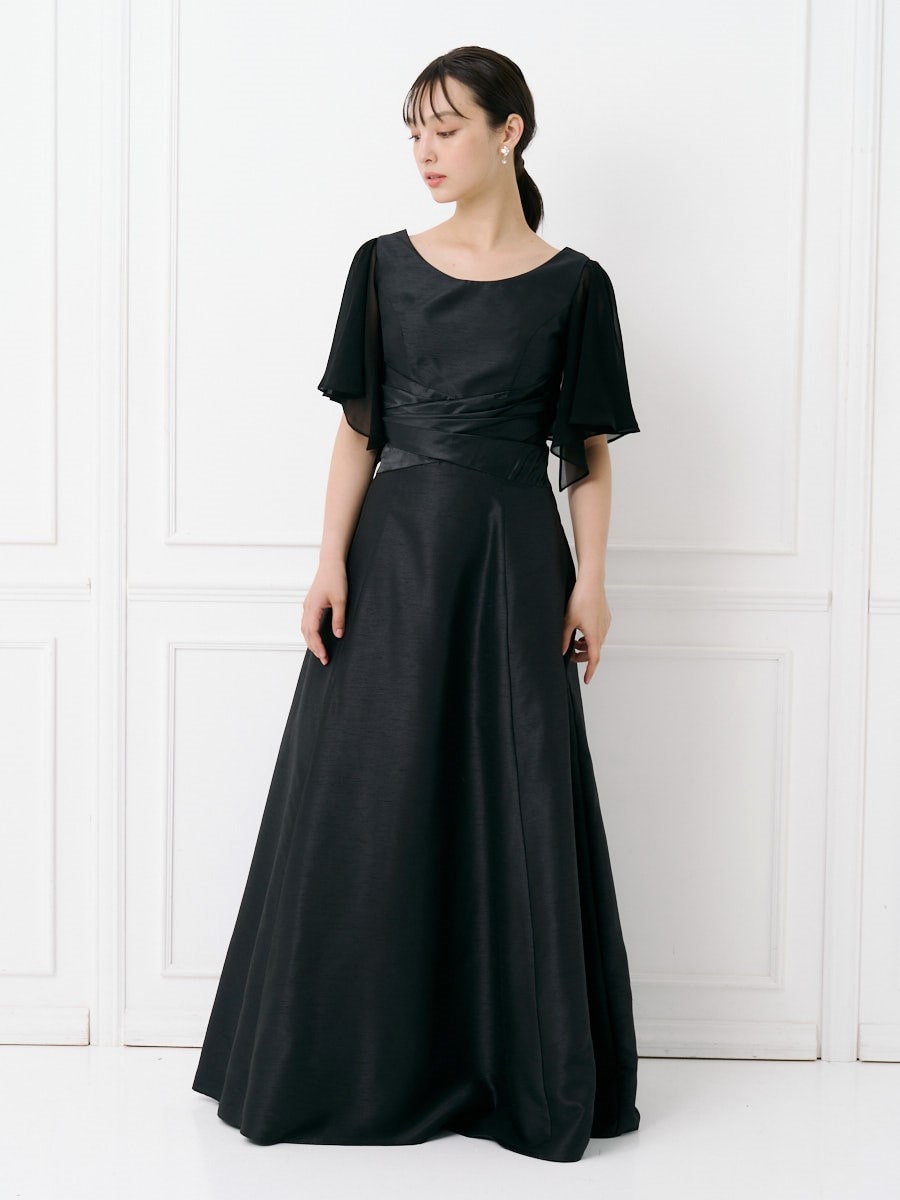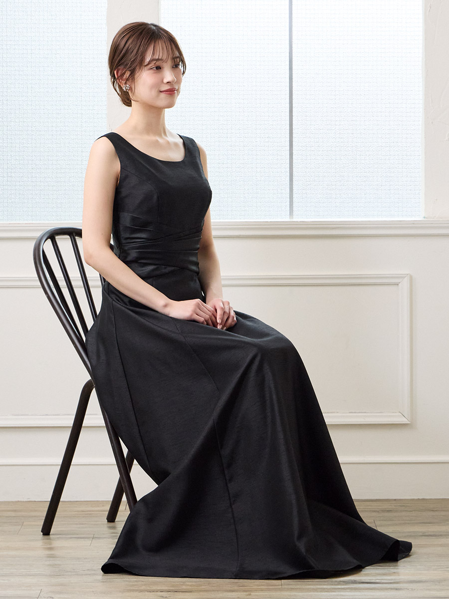 バックサテンシャンタンのマットな風合いが落ち着いた雰囲気のロングドレス