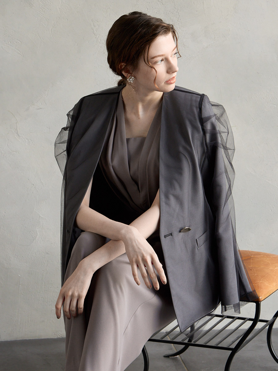 胸元のVラインを描くようなタック使いがエレガントな雰囲気で、程よく開いたネック部分が女性らしさを引き立てます。