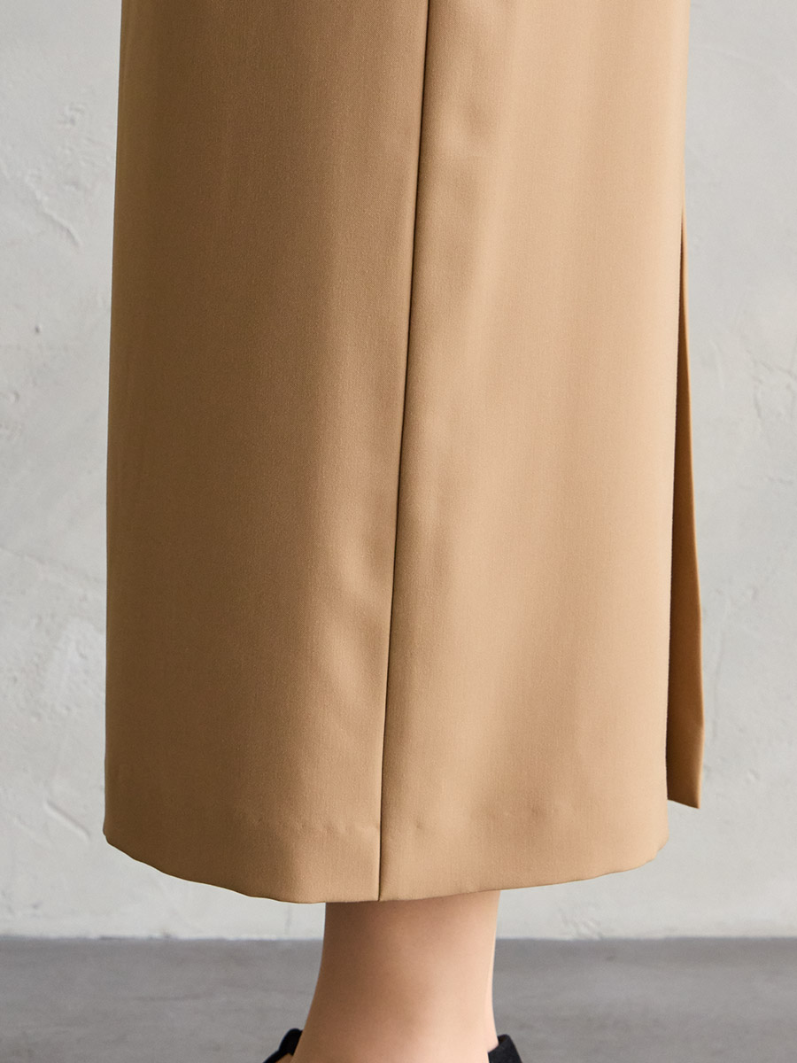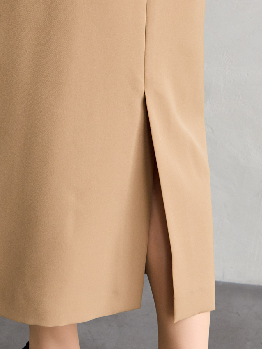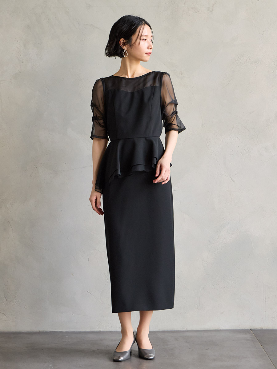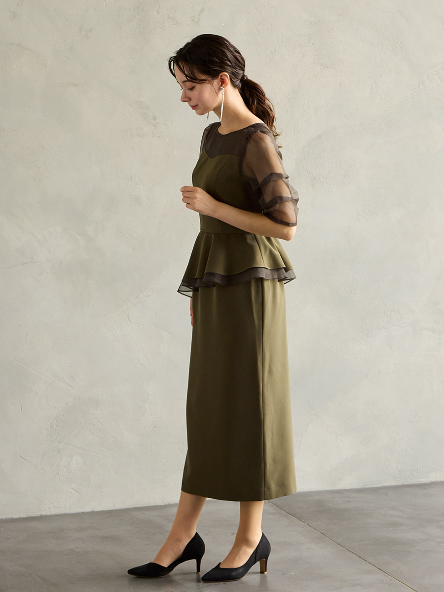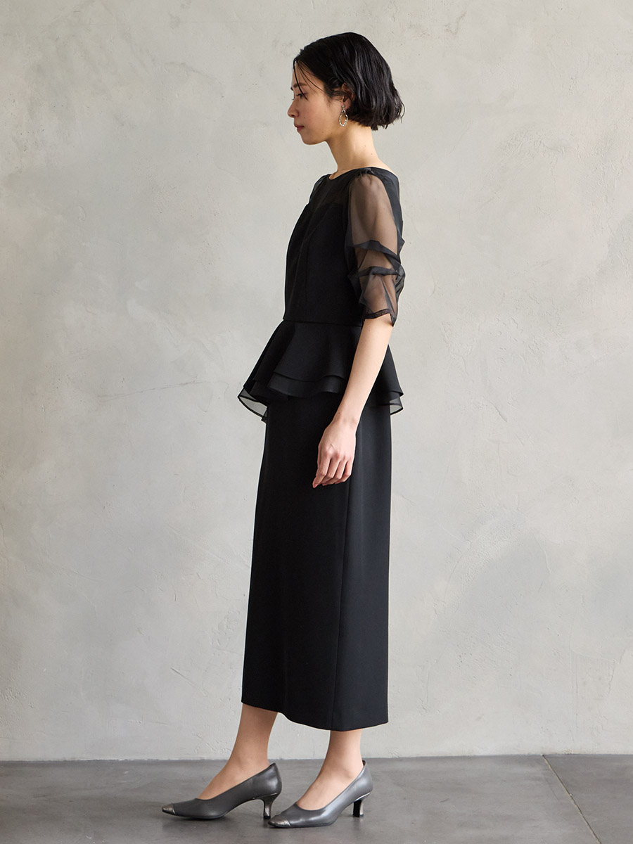 スカートはタイトラインですが、ペプラムデザインがお腹周りを隠してくれるので安心して着用いただけます。